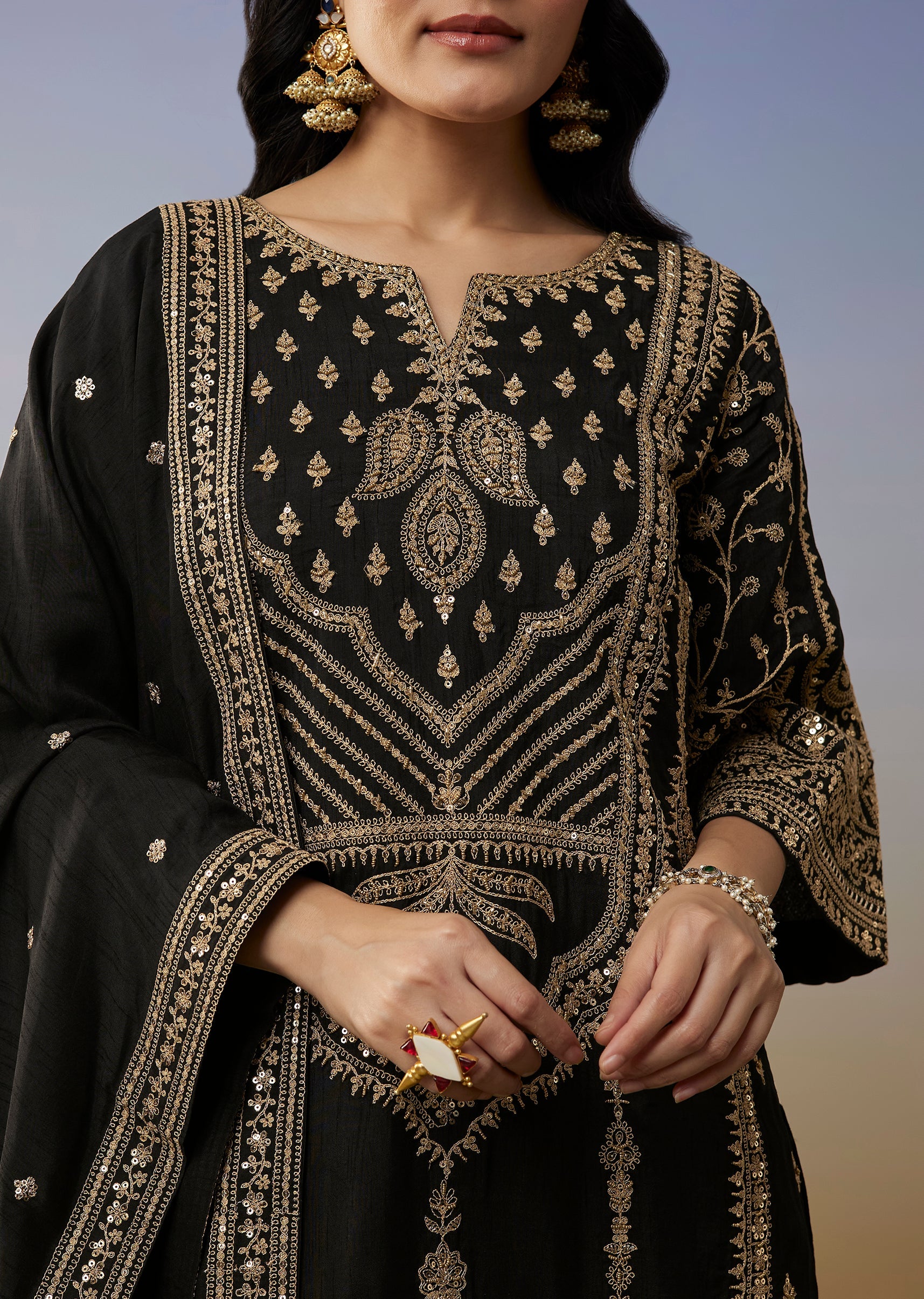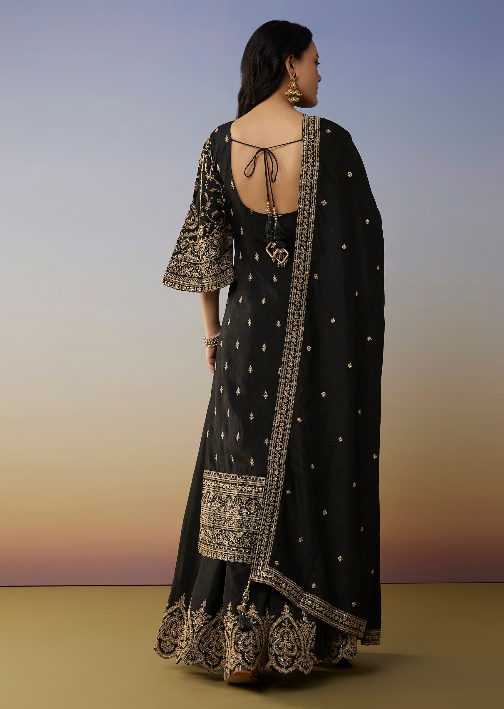 Dramatic and festive, this black silk palazzo suit is detailed with zari thread and sequins that add richness and movement. A stunning choice for evening celebrations and wedding functions.