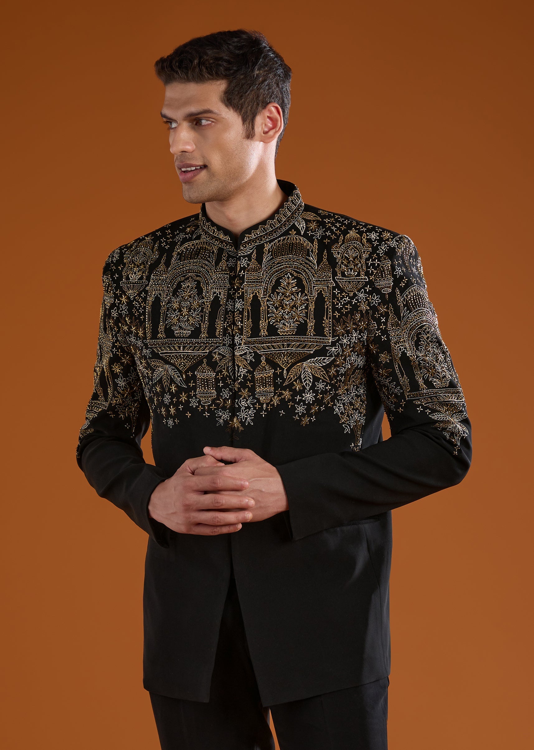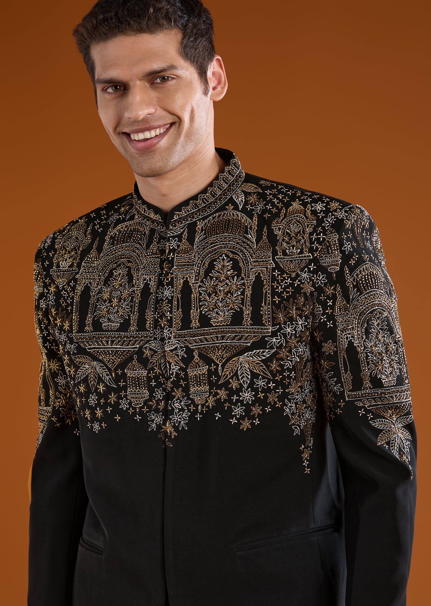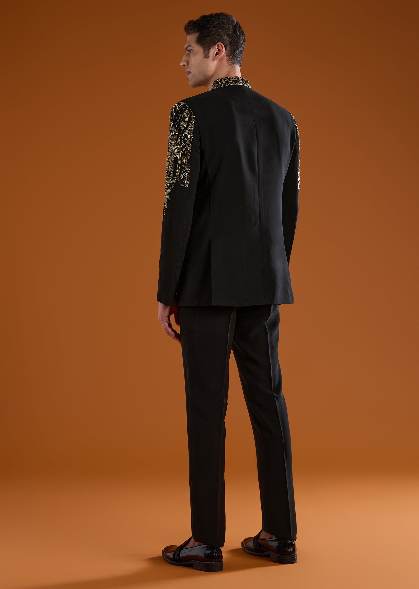 Sharp and tailored, this black suiting jodhpuri pant set features refined embroidery that enhances its formal appeal. Ideal for receptions and coordinated couple styling.