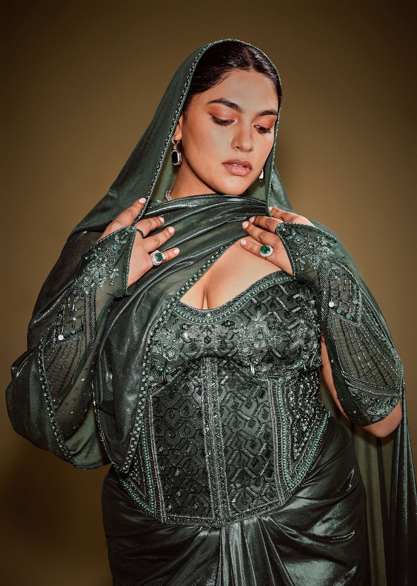 Bottle Green Shimmer Drape Skirt With Embroidered Corset And Dupatta