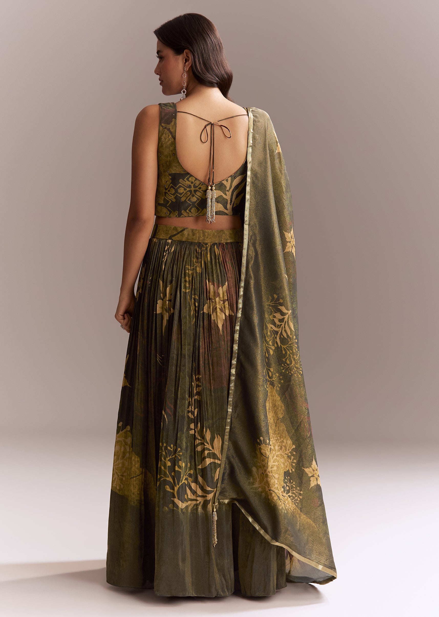 Bottle Green Tissue Lehenga Choli With Floral Print