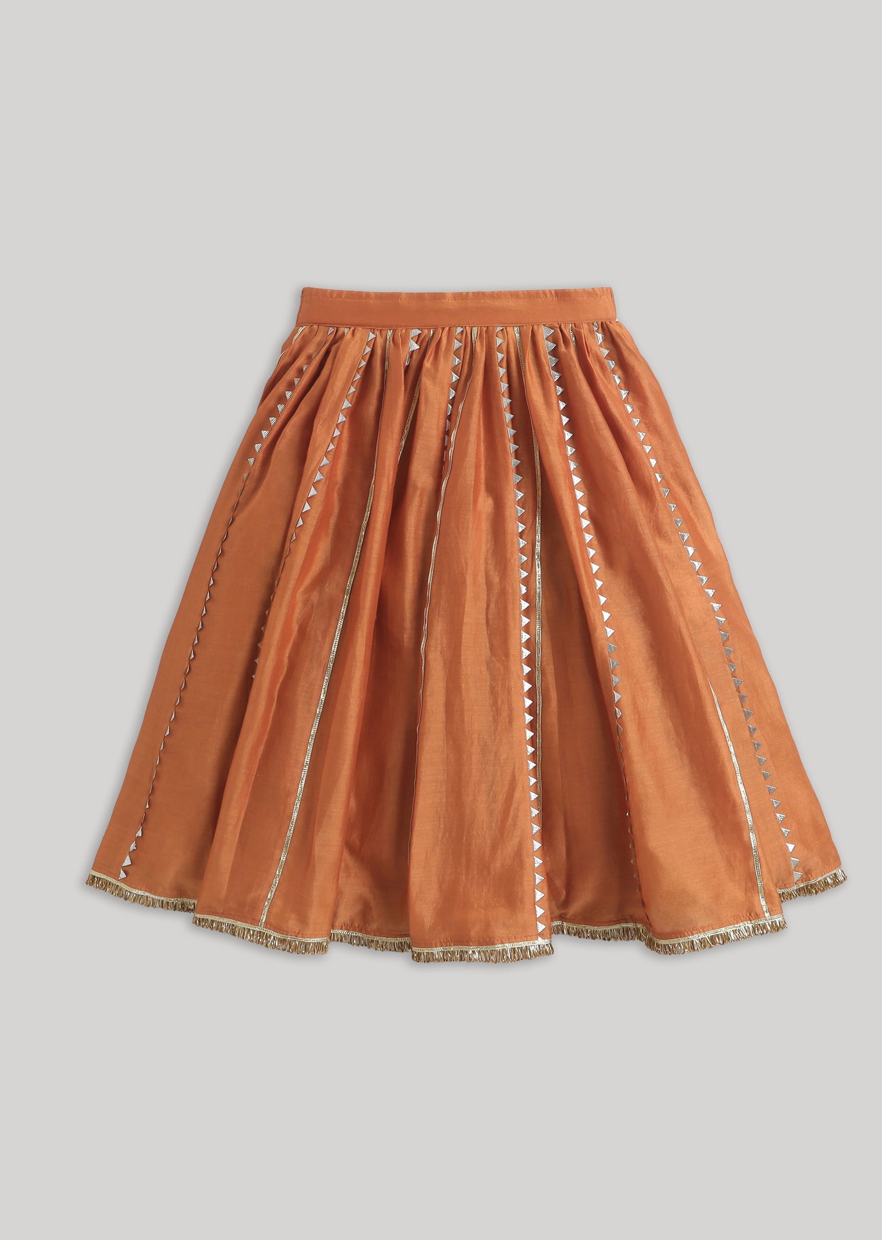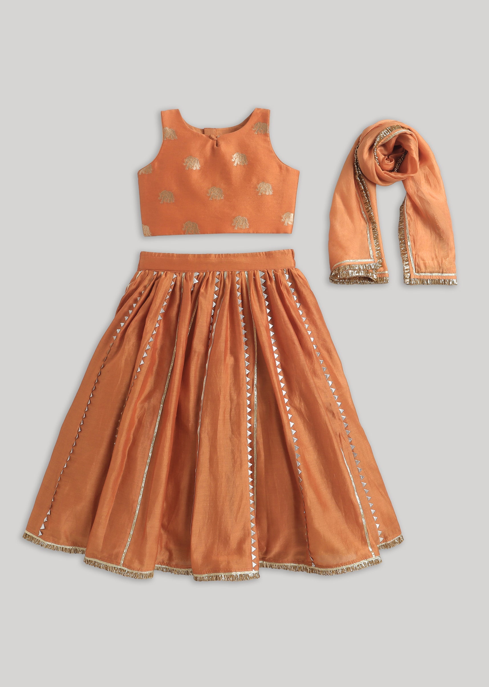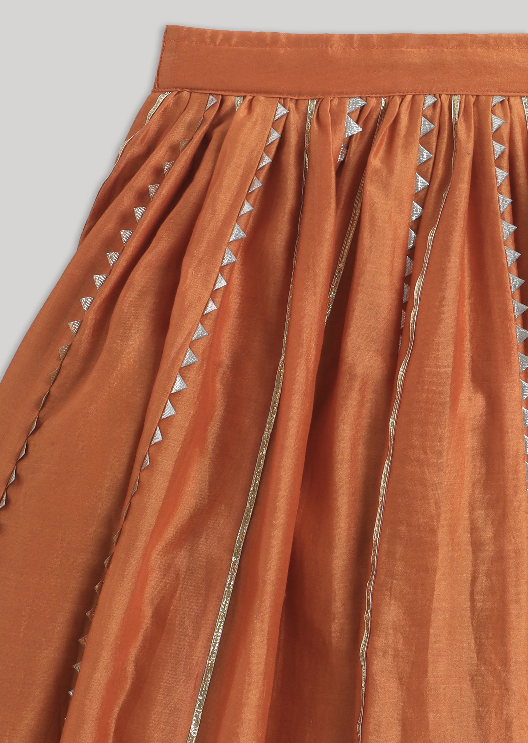 This festive lehenga set is designed in a striking orange with rich gold accents for traditional celebration wear. The chanderi fabric gives it a premium festive feel while staying lightweight for kids. Gotta work detailing adds a classic touch that looks elegant for weddings and pujas. Comes with a dupatta to finish the look in a traditional way. Awarded as the Most Trusted Brand, we're delivering styles you love, just as promised.