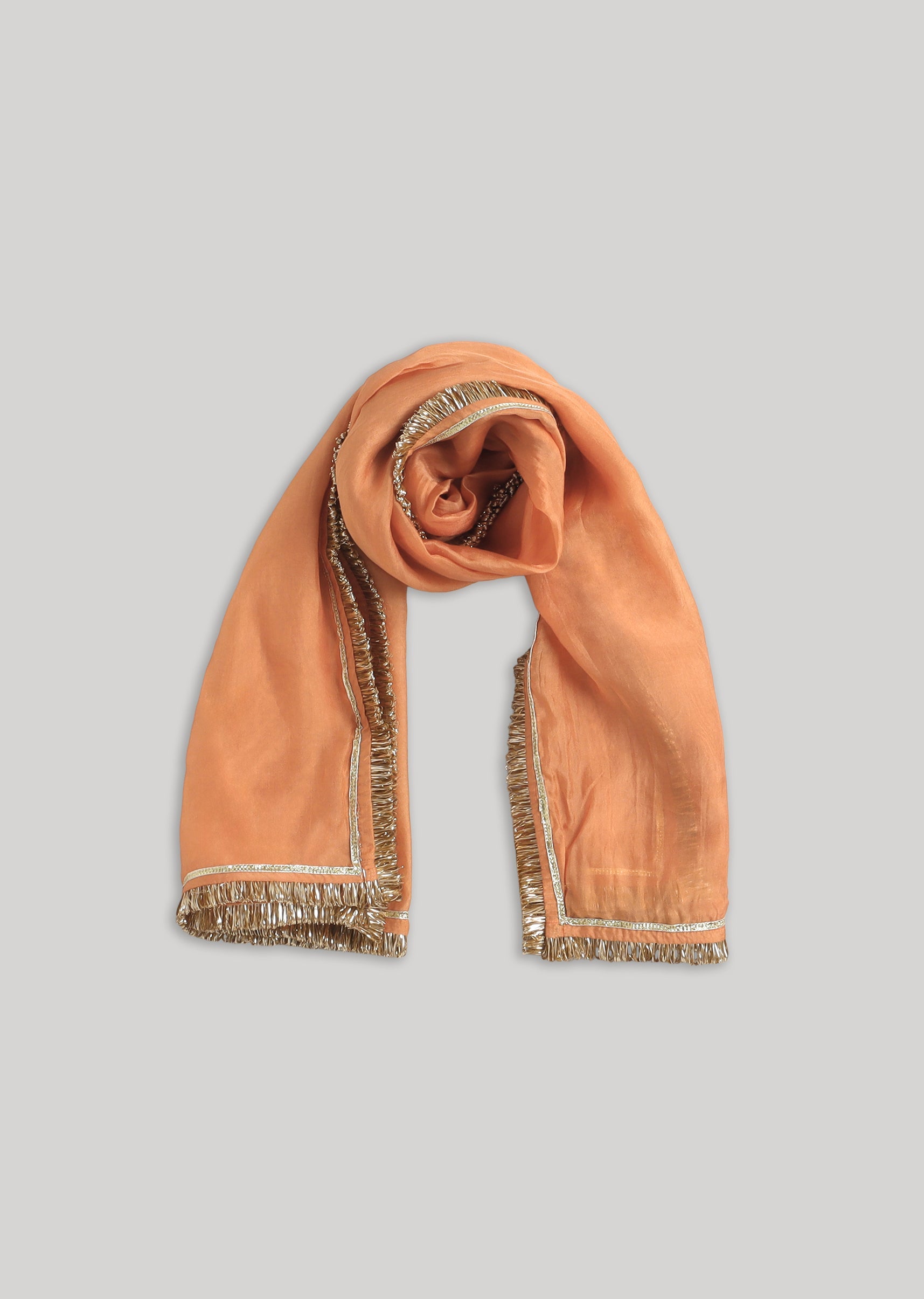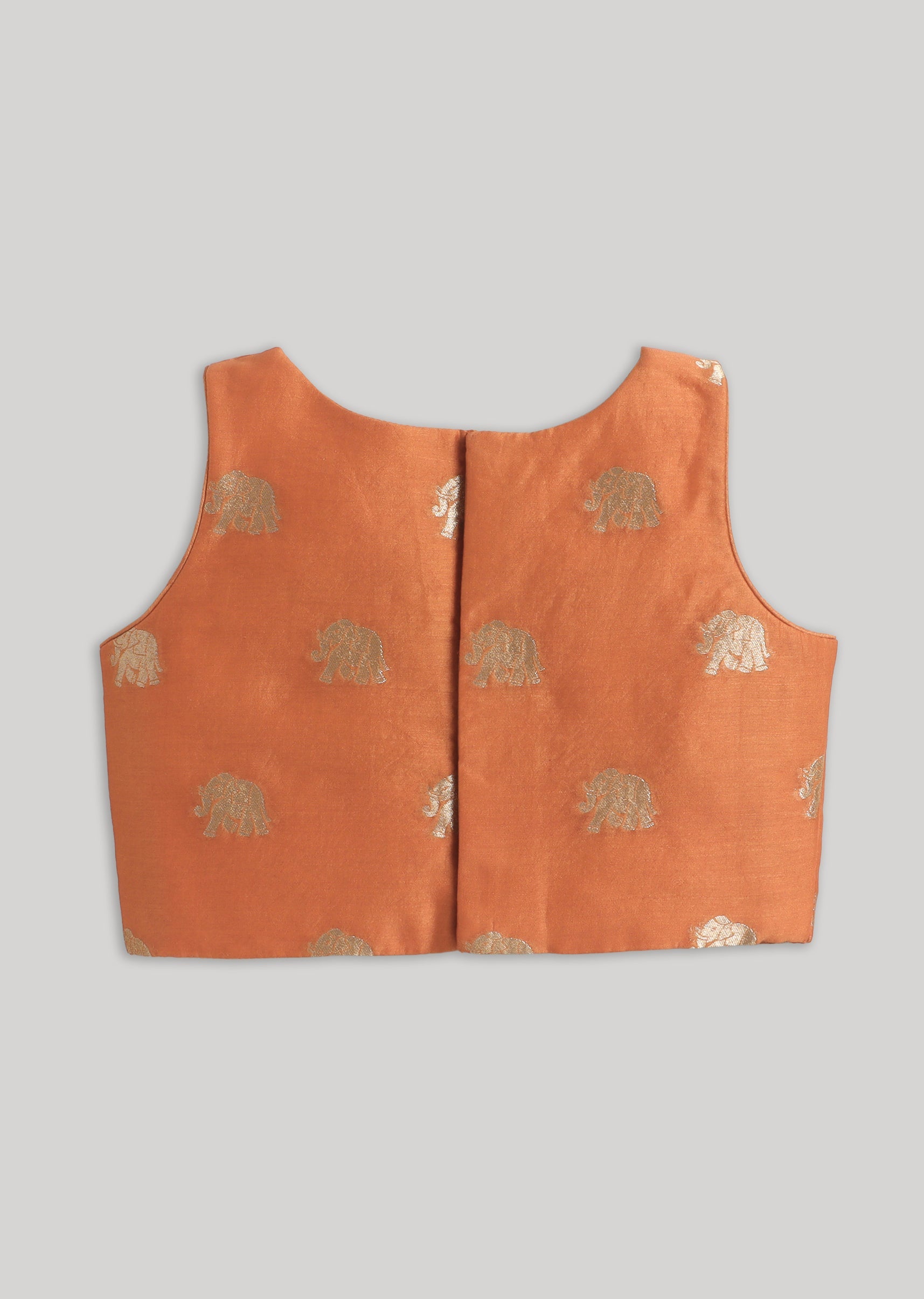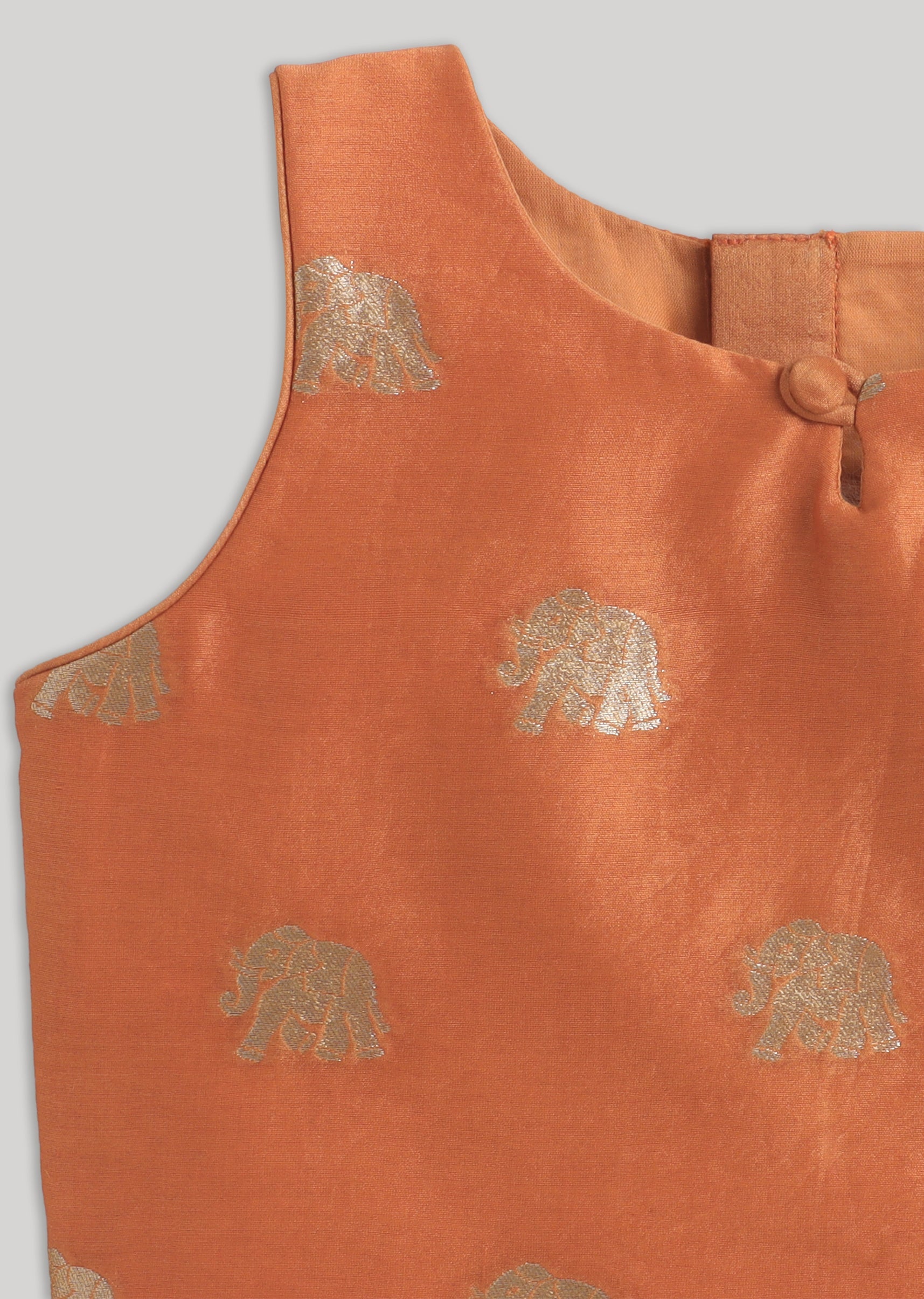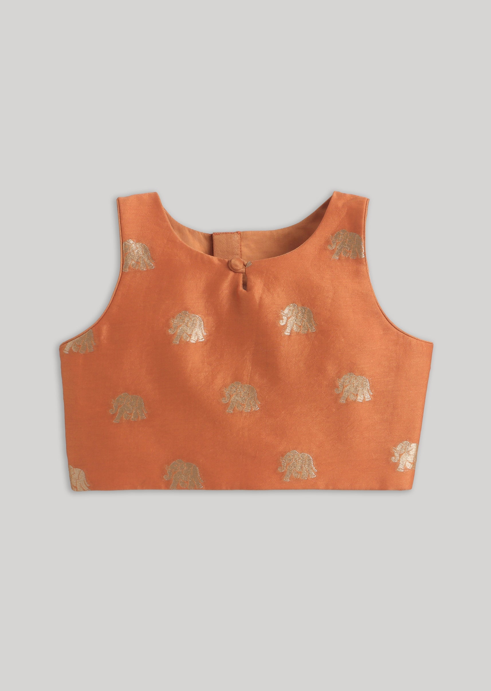 This festive lehenga set is designed in a striking orange with rich gold accents for traditional celebration wear. The chanderi fabric gives it a premium festive feel while staying lightweight for kids. Gotta work detailing adds a classic touch that looks elegant for weddings and pujas. Comes with a dupatta to finish the look in a traditional way. Awarded as the Most Trusted Brand, we're delivering styles you love, just as promised.