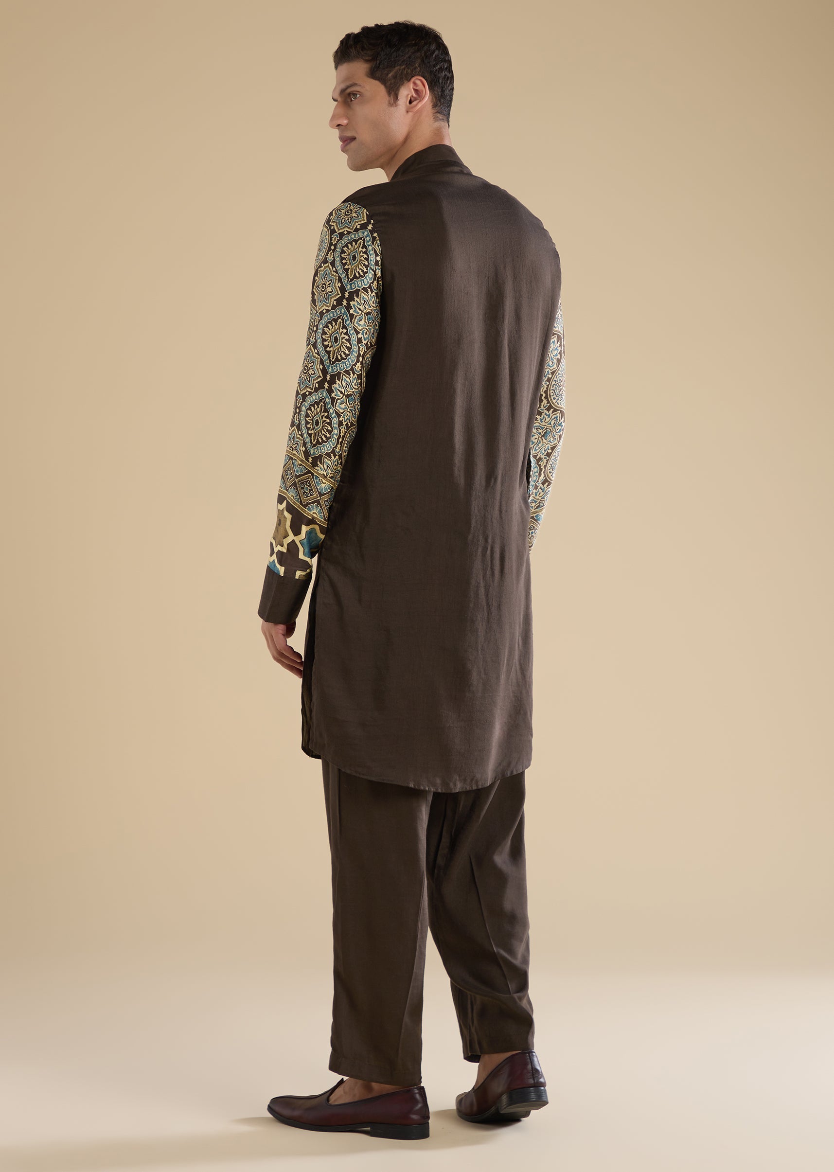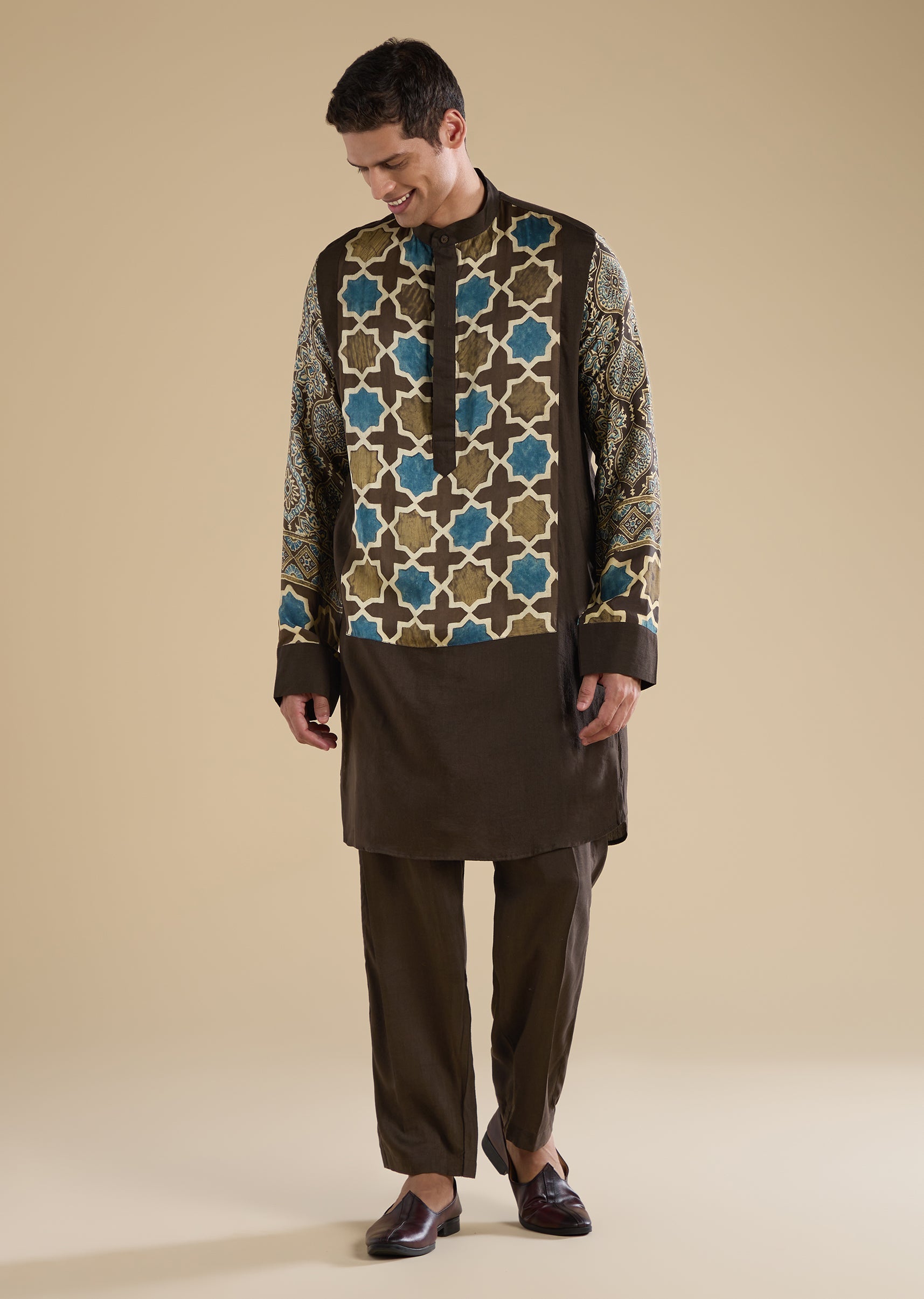 Earthy and artisanal in appeal, this brown kurta set features pure handblock Ajrakh print on soft modal fabric for breathable, all-day comfort. Designed with a mandarin collar, full sleeves, and... More Product Details