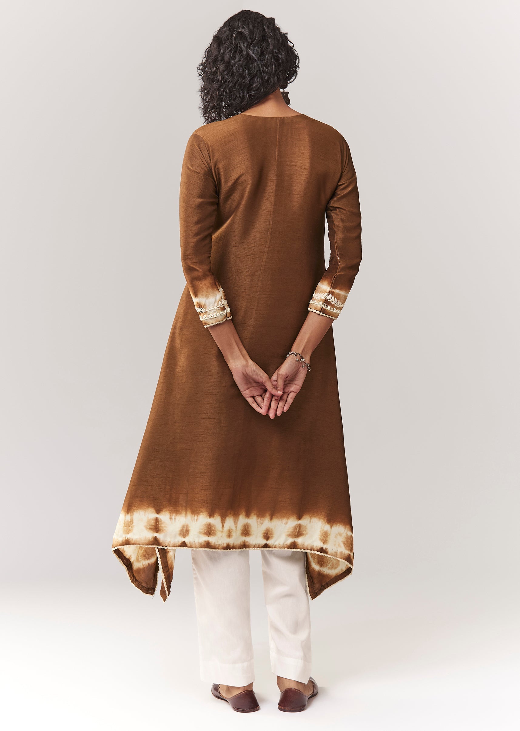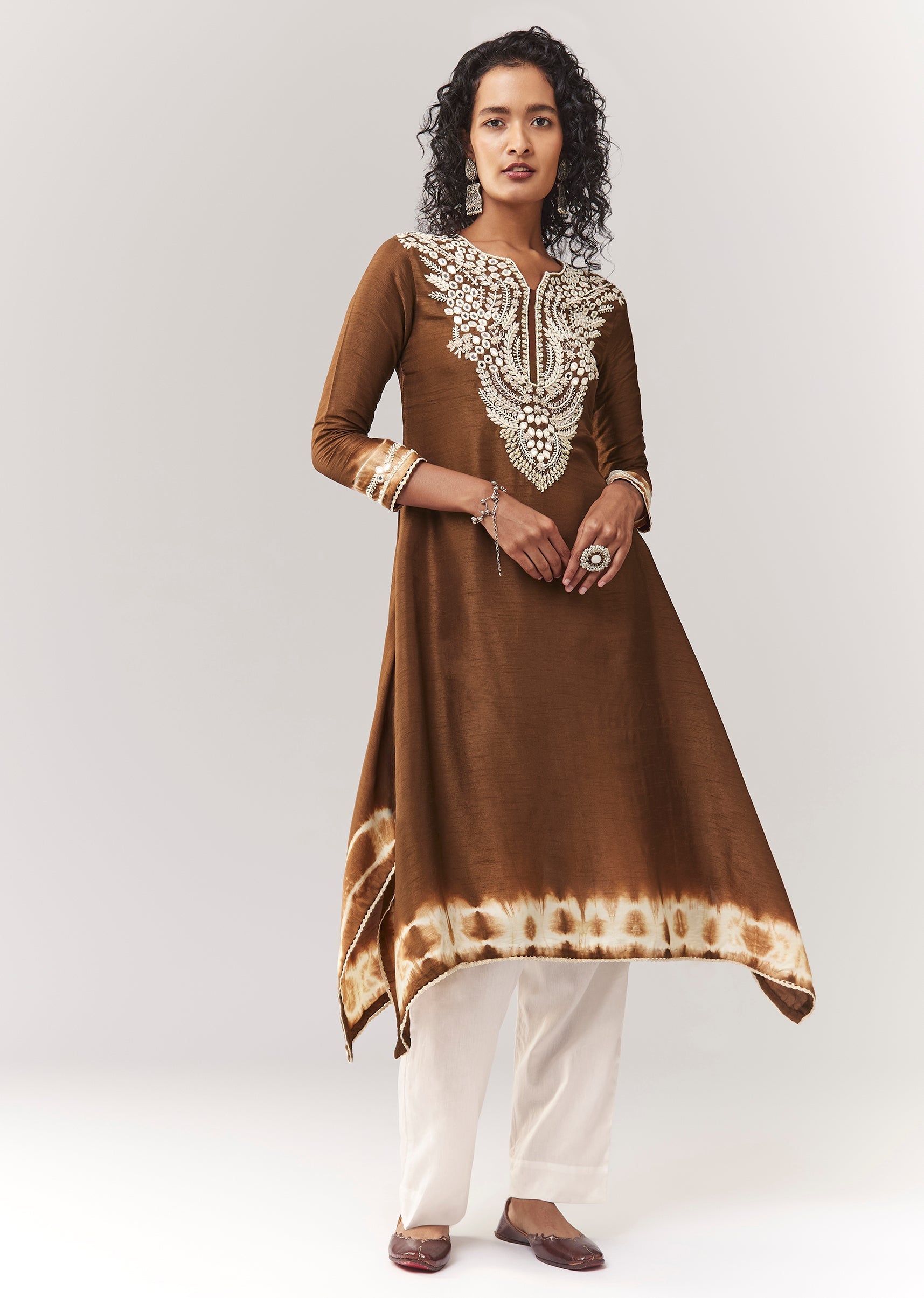 A classic festive co-ord in an earthy brown tone with white contrast, featuring mirror and sequin embroidery and a leheriya border. The asymmetric A-line kurta has a notched neckline and 3/4 sleeves, styled minimally for mature, elegant dressing. Straight pants (mid-waist, elasticated) complete the set for effortless wearability. Awarded as the Most Trusted Brand, we're delivering styles you love, just as promised.