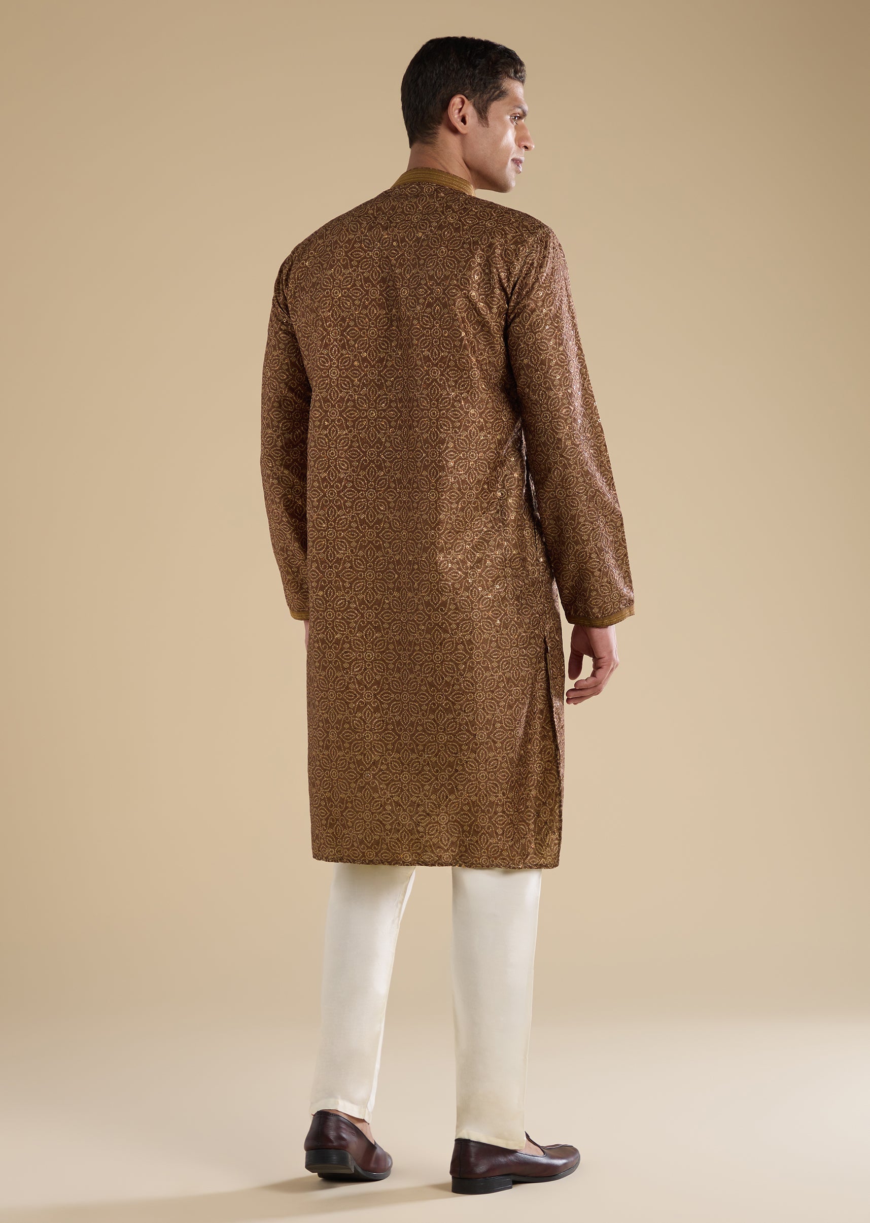Warm and understated, this brown kurta set is designed for relaxed everyday wear. Crafted in a soft silk base, it features a mandarin collar, full sleeves, and subtle resham thread... More Product Details