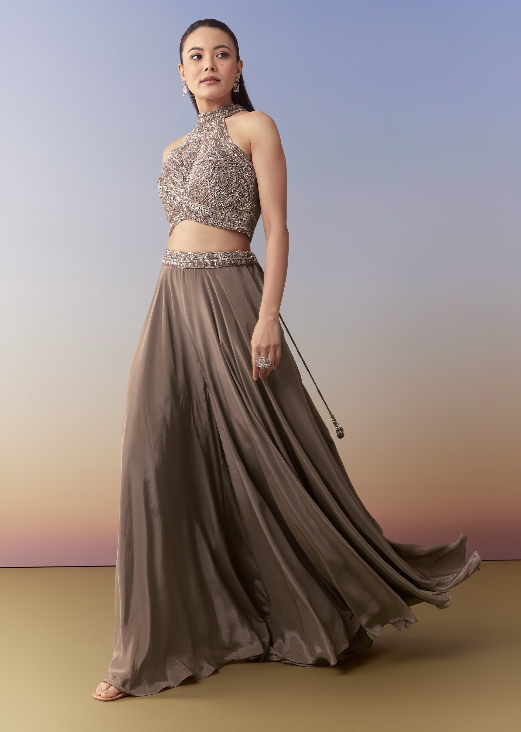 Bring effortless style to your festive wardrobe with this brown palazzo set, featuring a crop top embellished with cutdana and sequin work for a subtle yet striking shimmer. The flowy... More Product Details