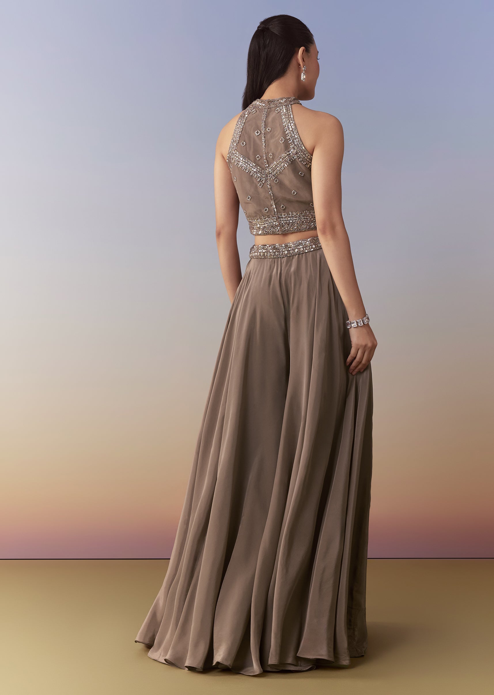 Brown Embellished Crop Top Palazzo Set