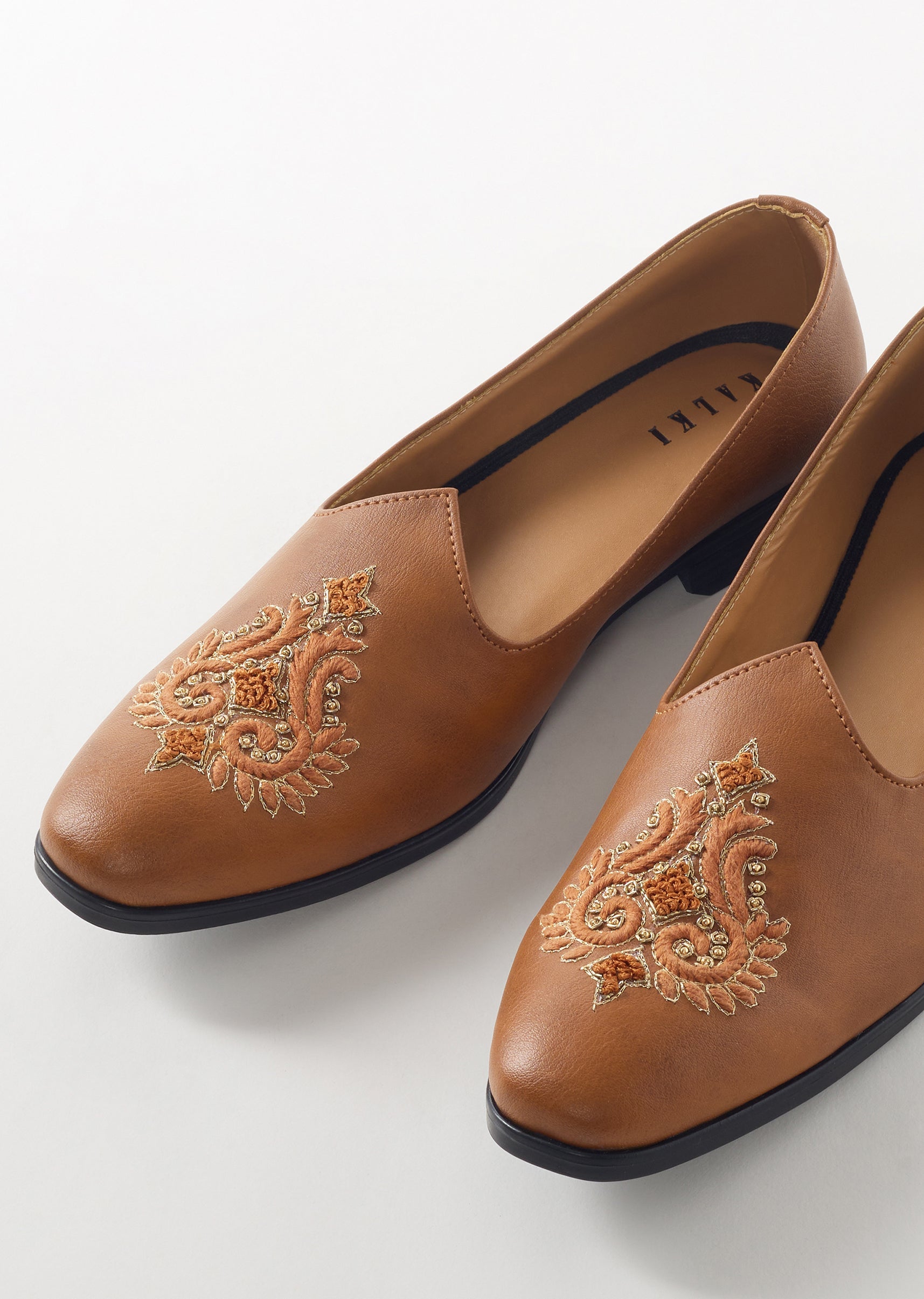 Brown Embroidered Ethnic Slip On Shoes For Men