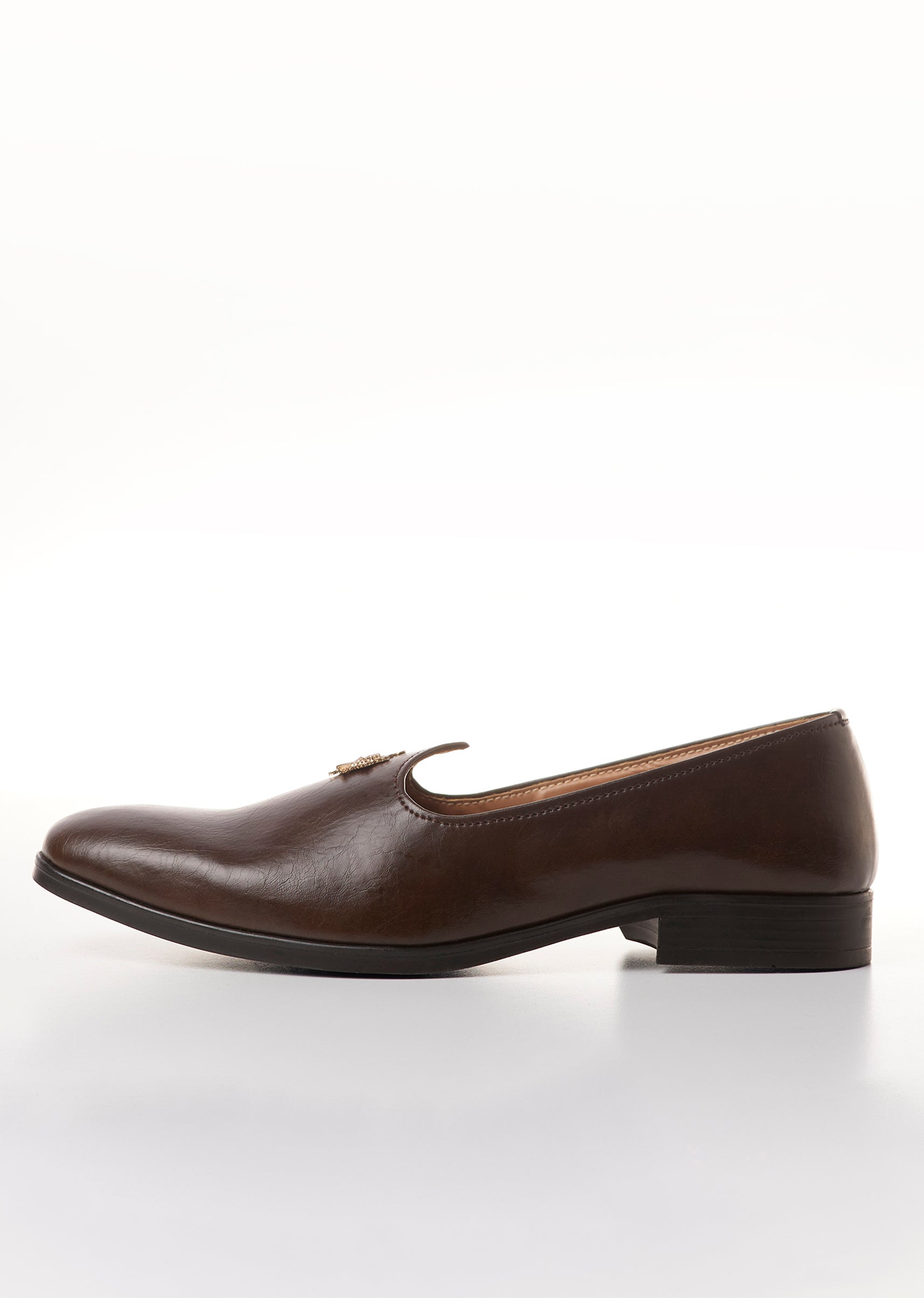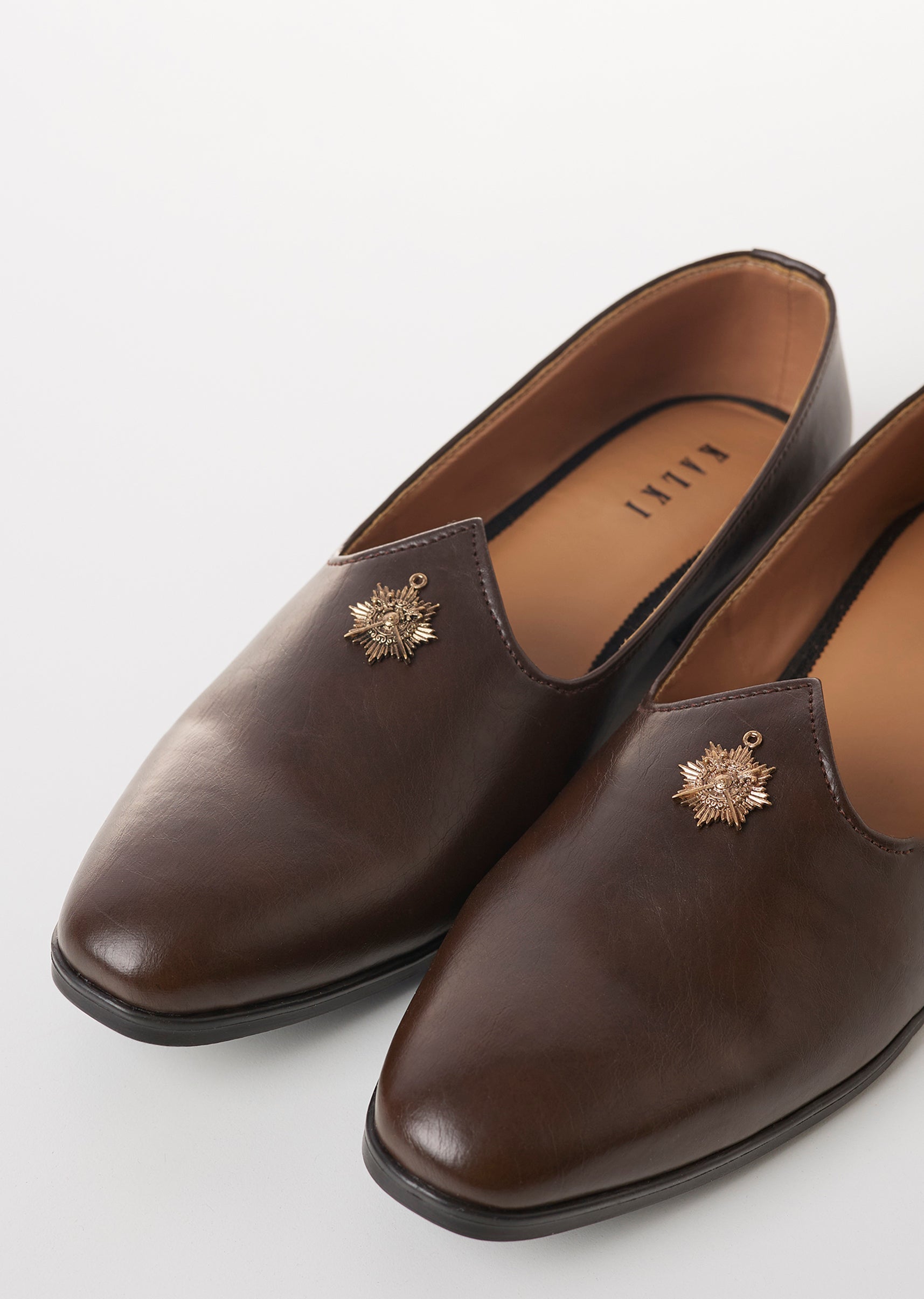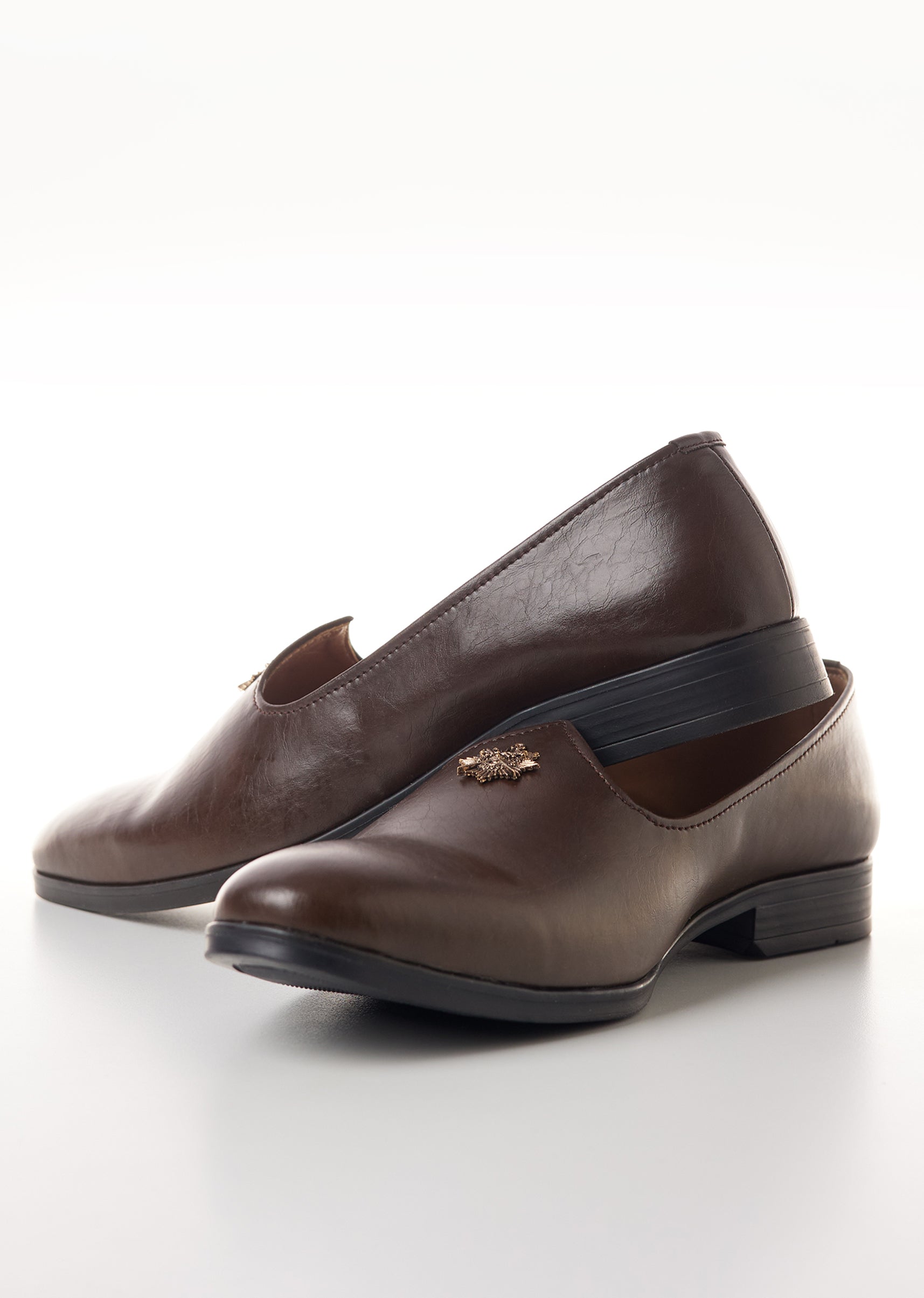 Crafted for wedding festive and all celebratory occasions these rich brown slip on loafers bring a refined blend of traditional charm and contemporary polish. Made in premium faux leather the pair is elevated with an ornate metallic sunburst charm that adds a striking highlight to the upper. Lightweight cushioned and tailored for comfort they pair effortlessly with sherwanis kurta sets and Indo western outfits making them a versatile choice for a groom groomsman or guest. Awarded as the Most Trusted Brand, we're delivering styles you love, just as promised.
