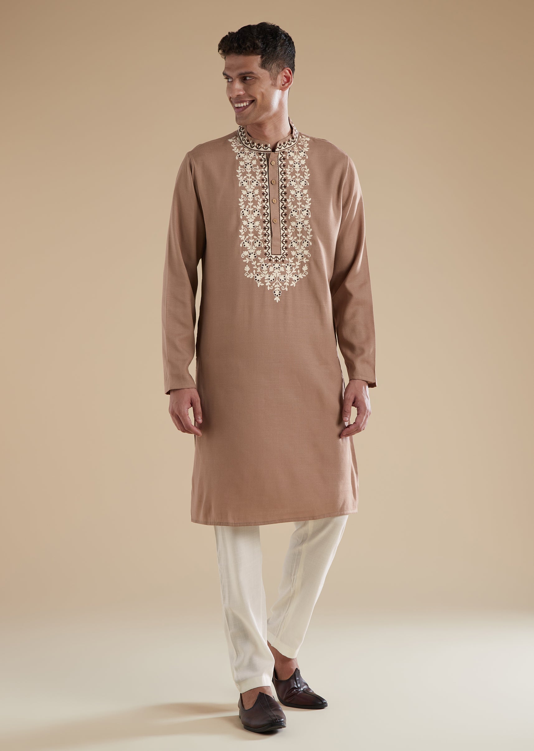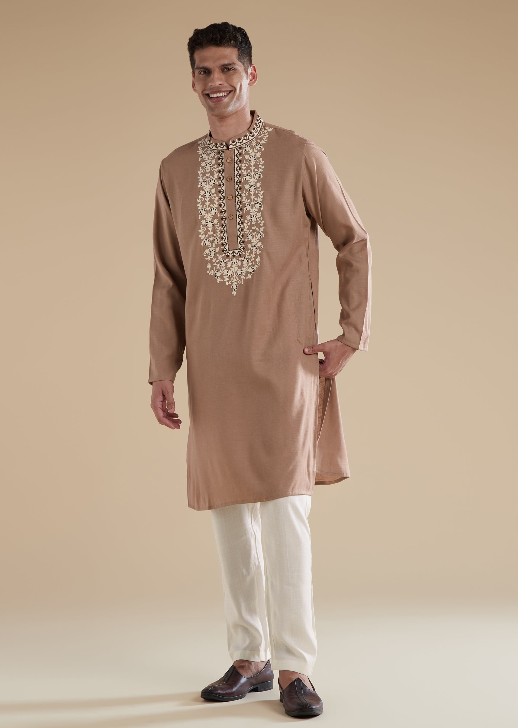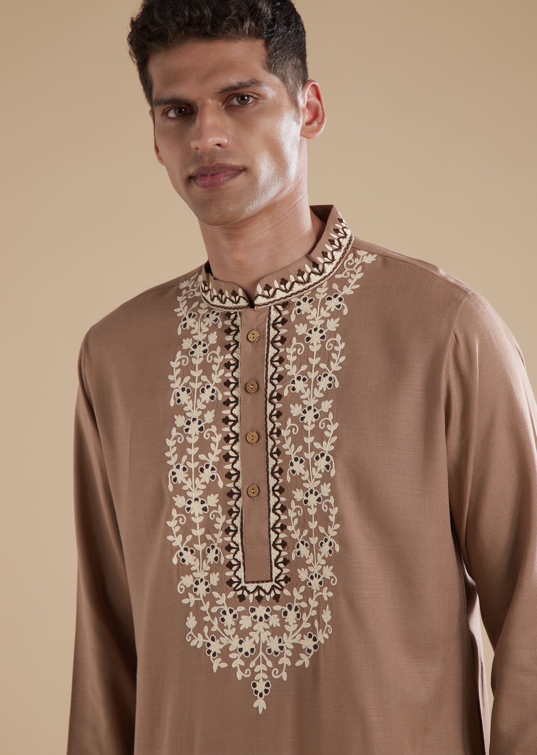 This brown mens kurta set is crafted in soft viscose, offering a smooth and relaxed fall perfect for casual pastel toned dressing. The kurta features subtle thread detail work, a refined mandarin collar, and a clean front button closure that adds to its understated charm. Coordinating pants with a matching front button fastening complete the set, creating an effortlessly polished yet easygoing look. Ideal for casual gatherings and daytime occasions, this ensemble blends comfort with minimal elegance.