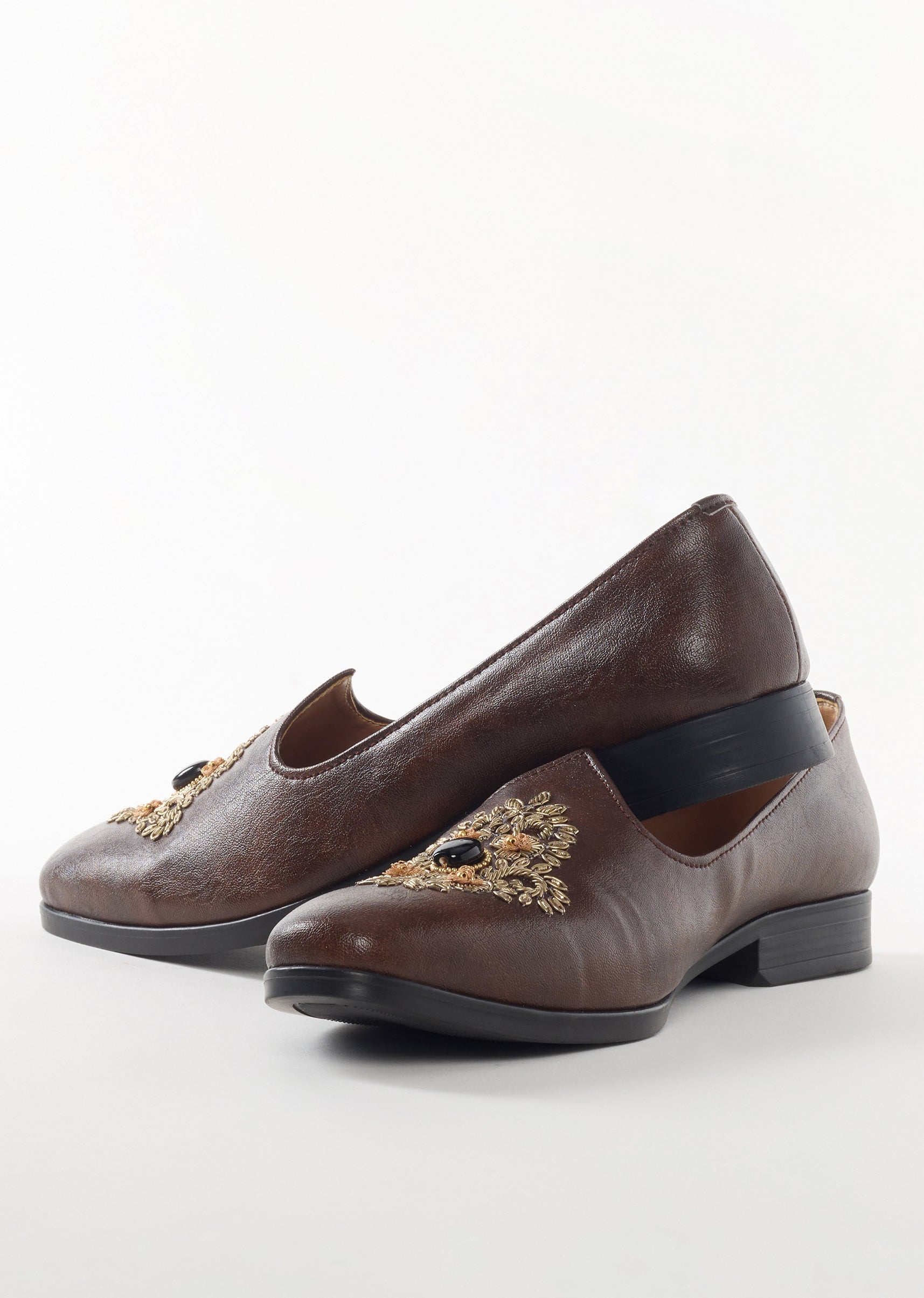 Brown Leather Ethnic Jutti With Floral Embroidery And Decorative Stone For Men