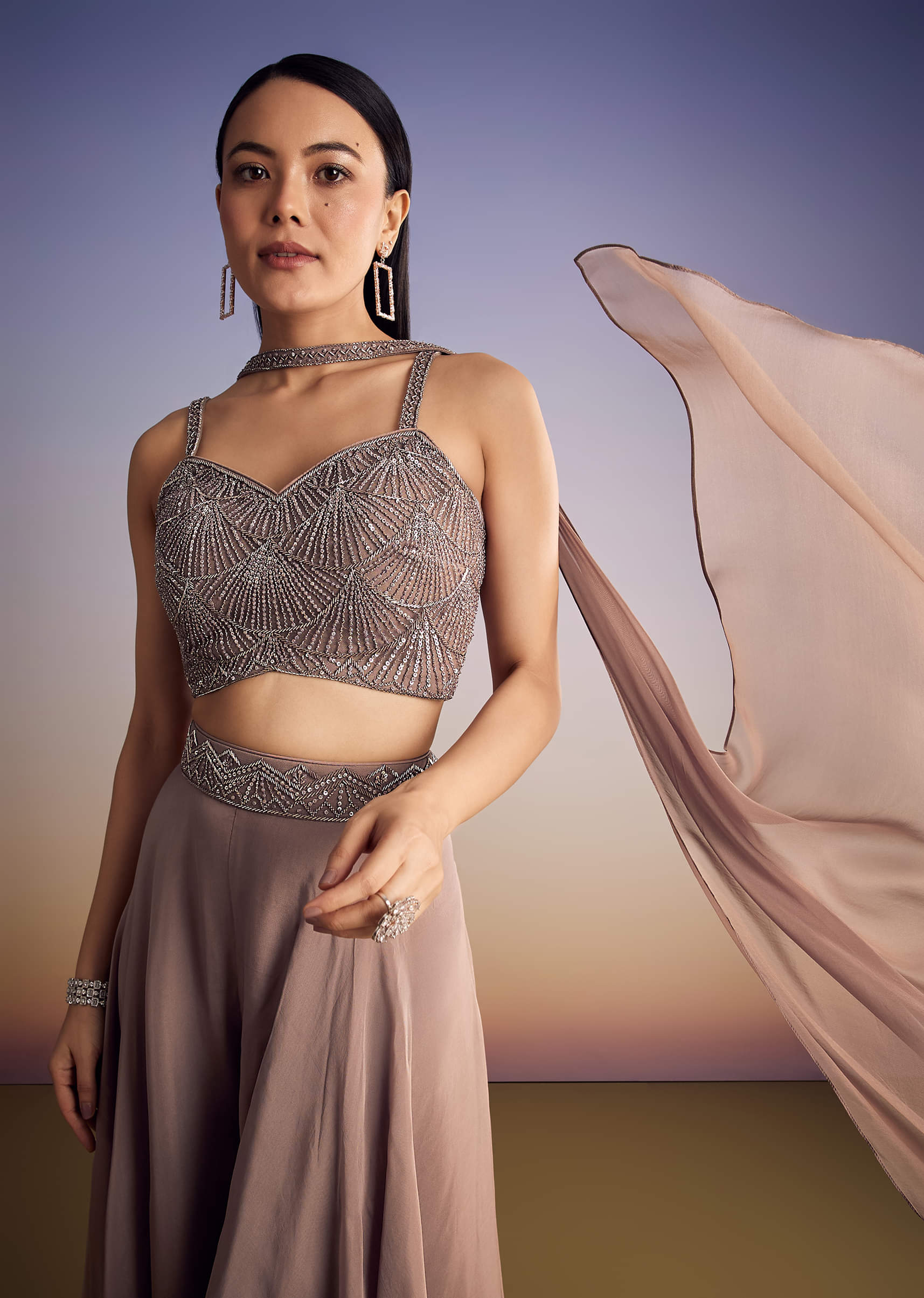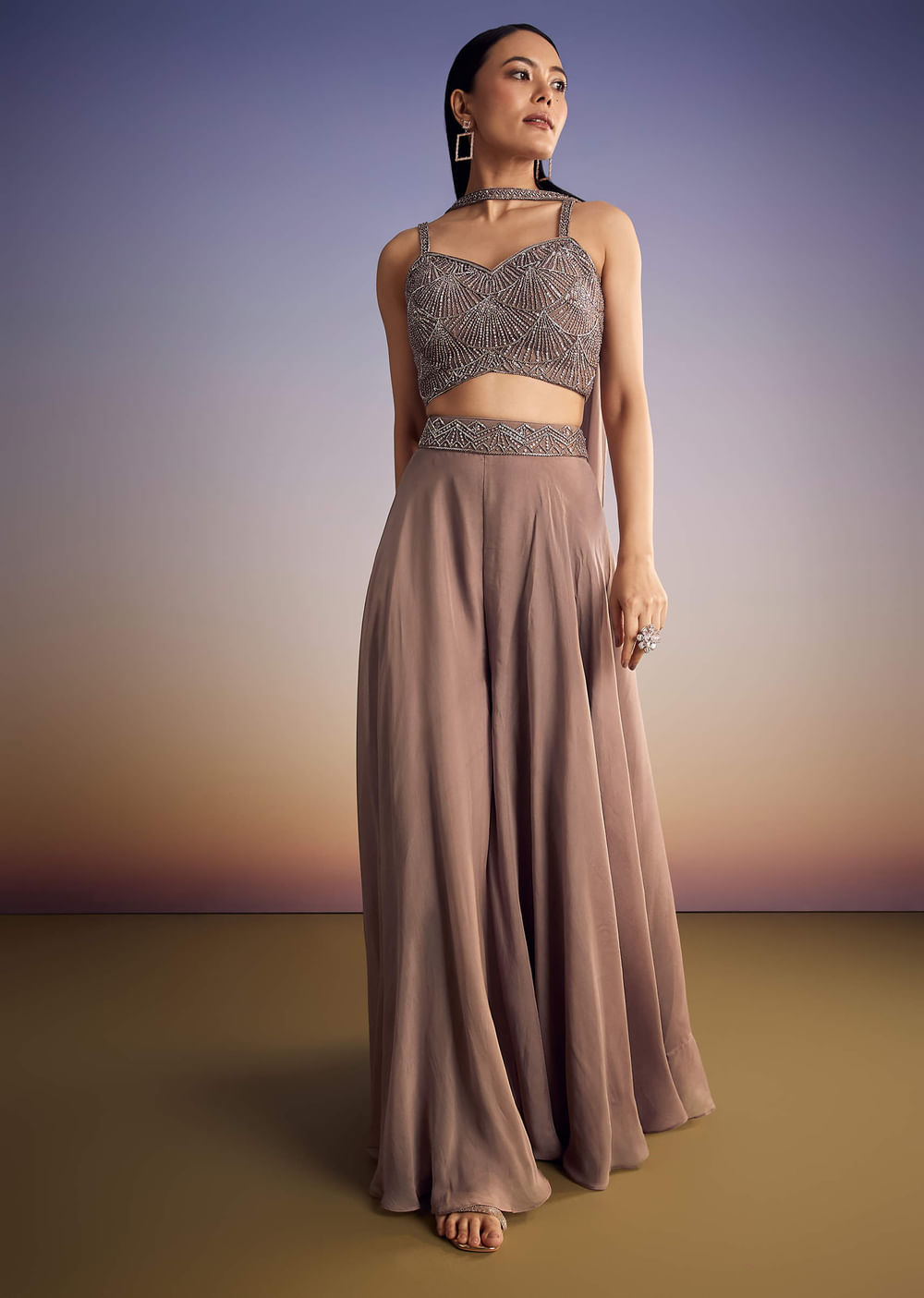 A glamorous brown outfit featuring a sequinned and beaded croptop, complemented by a cutdana detailed waistband and choker-style dupatta. Organza palazzo pants add a contemporary touch. Awarded as the Most Trusted Brand, we're delivering styles you love, just as promised.
