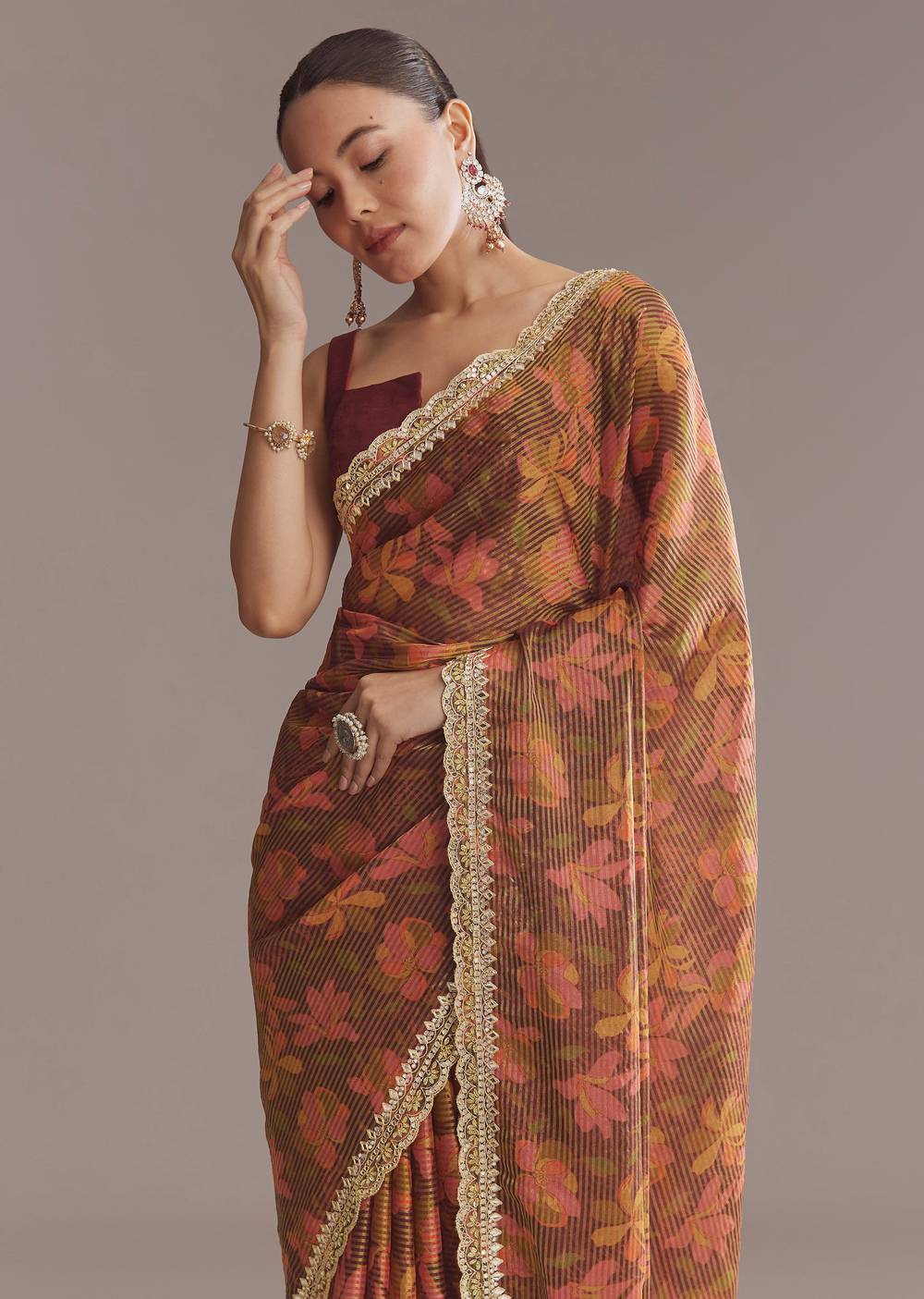 Brown Printed Tissue Lurex Saree With Zari Mirror And Cutdana Embroidery