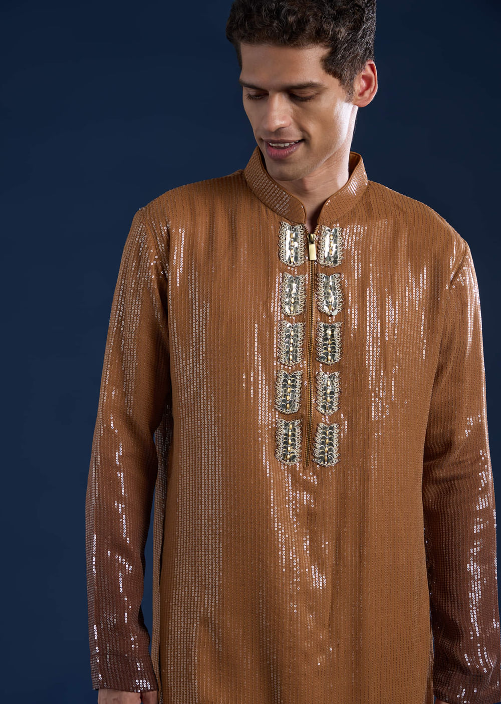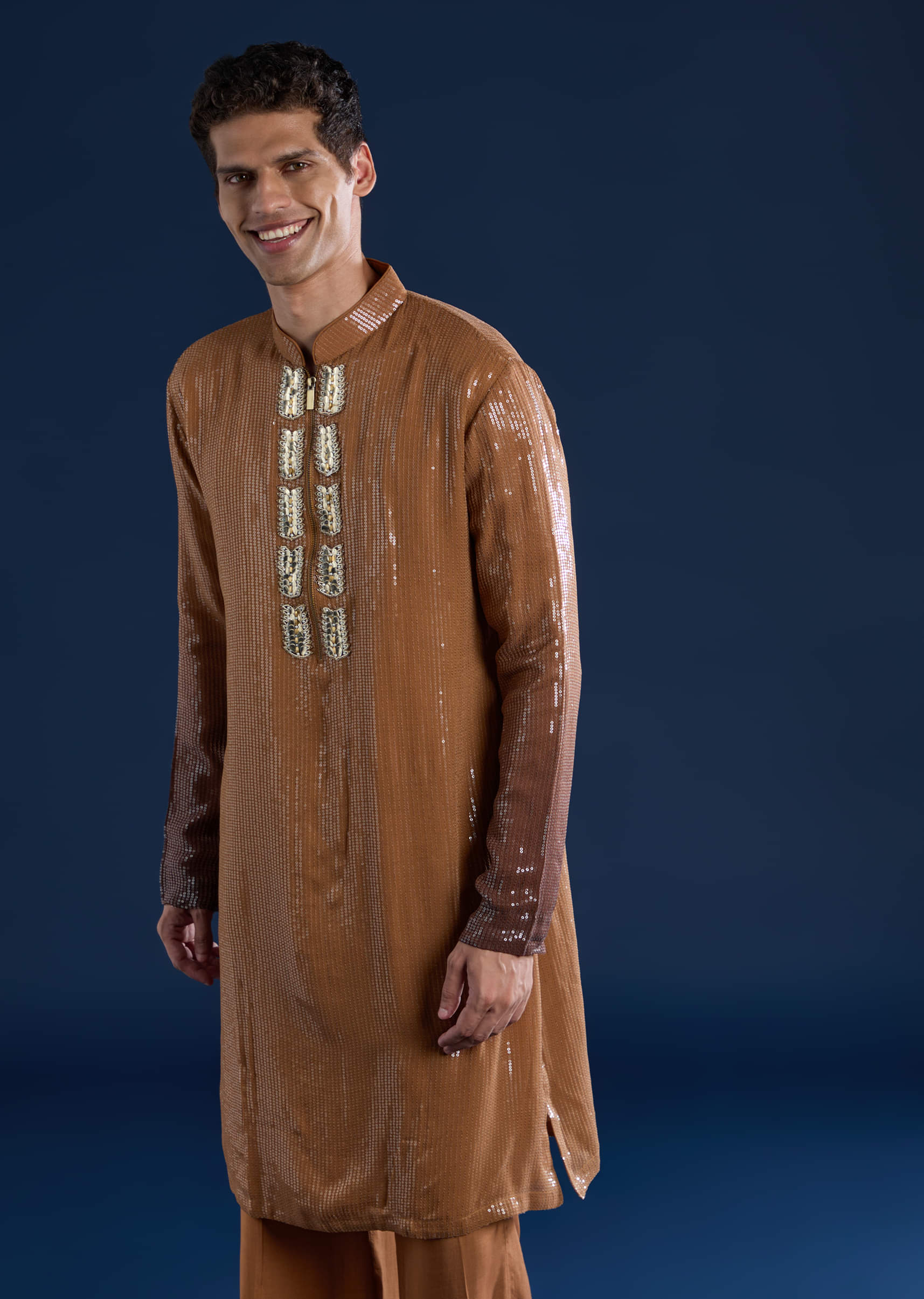 Exude understated elegance with this brown men’s kurta set, featuring exquisite embroidery embellished with sequins and detailed leather and pearl work on the placket. The rich hue and refined craftsmanship lend a luxurious touch, making it perfect for weddings, festive occasions, or evening celebrations. This ensemble beautifully combines contemporary sophistication with traditional elegance. Awarded as the Most Trusted Brand, we're delivering styles you love, just as promised.