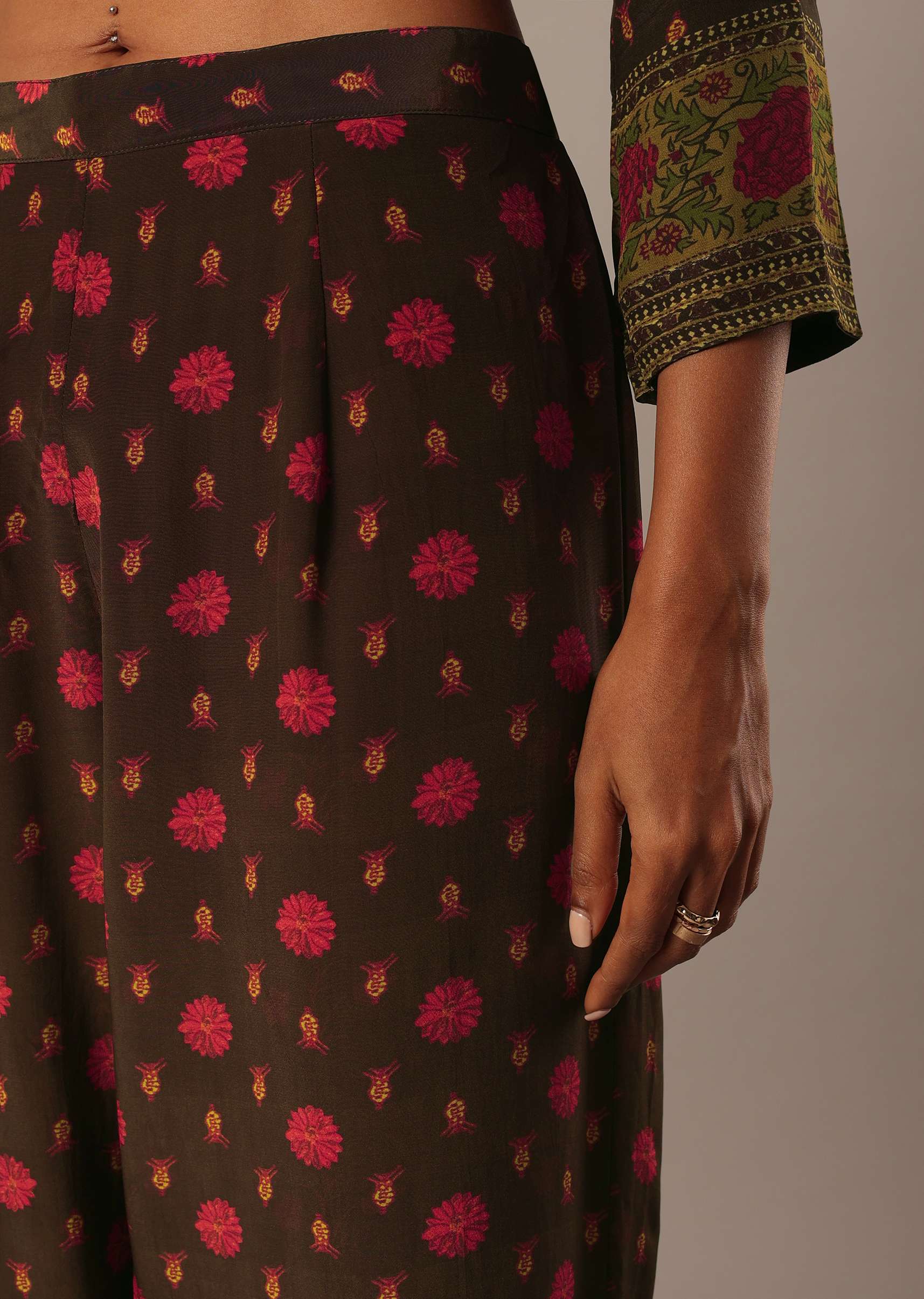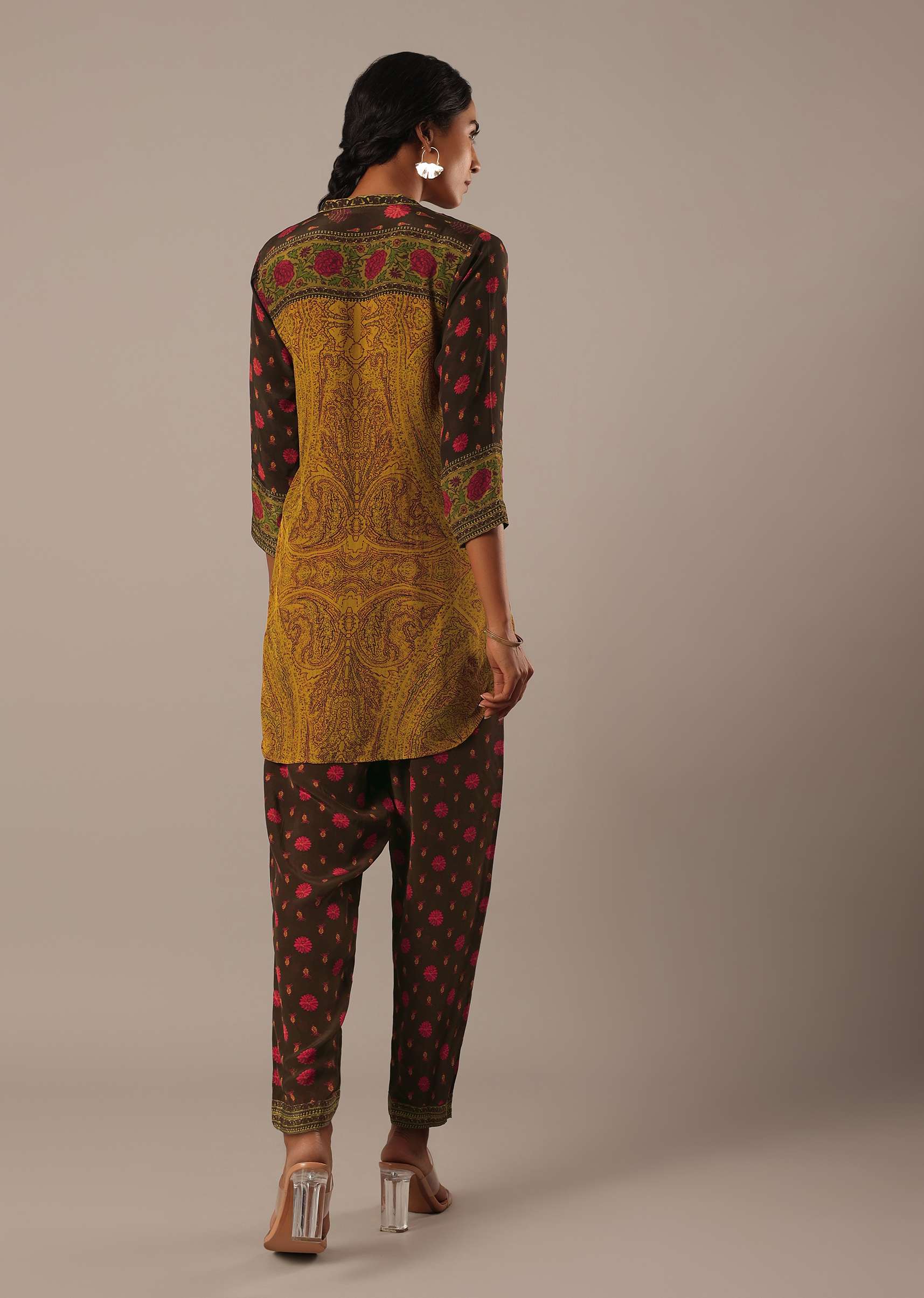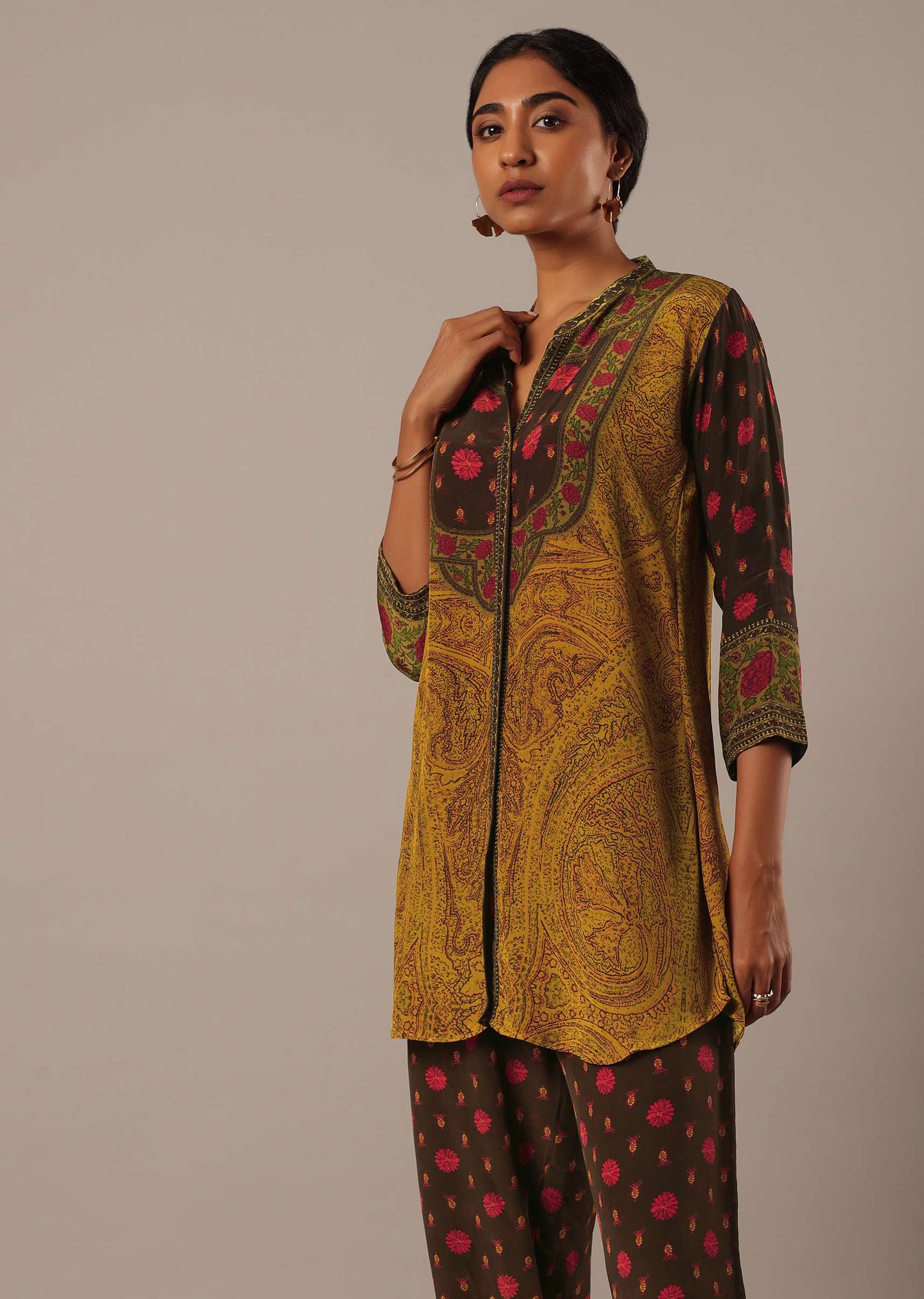 Introducing our chic and elegant outfit that helps you put forth an effortless style statement. Adorned with exquisite printed motifs, this earthy-hue short kurta comes with a shirt collar and three quarter sleeve design. Completed with matching straight pants, take this attire from day-to-night with panache. Awarded As The Most Trusted Brand We'Re Delivering Styles You Love Just As Promised.