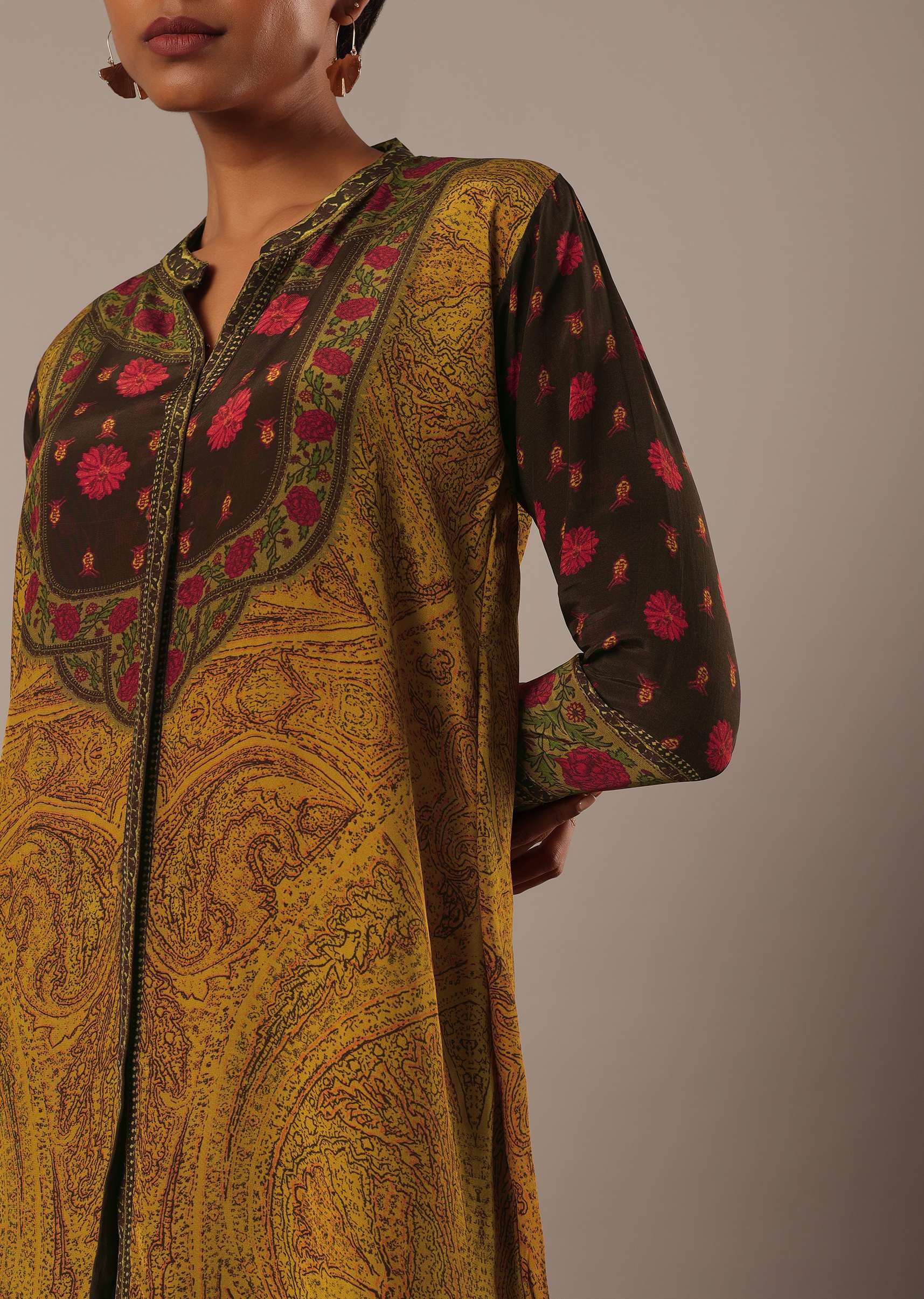 Introducing our chic and elegant outfit that helps you put forth an effortless style statement. Adorned with exquisite printed motifs, this earthy-hue short kurta comes with a shirt collar and... More Product Details