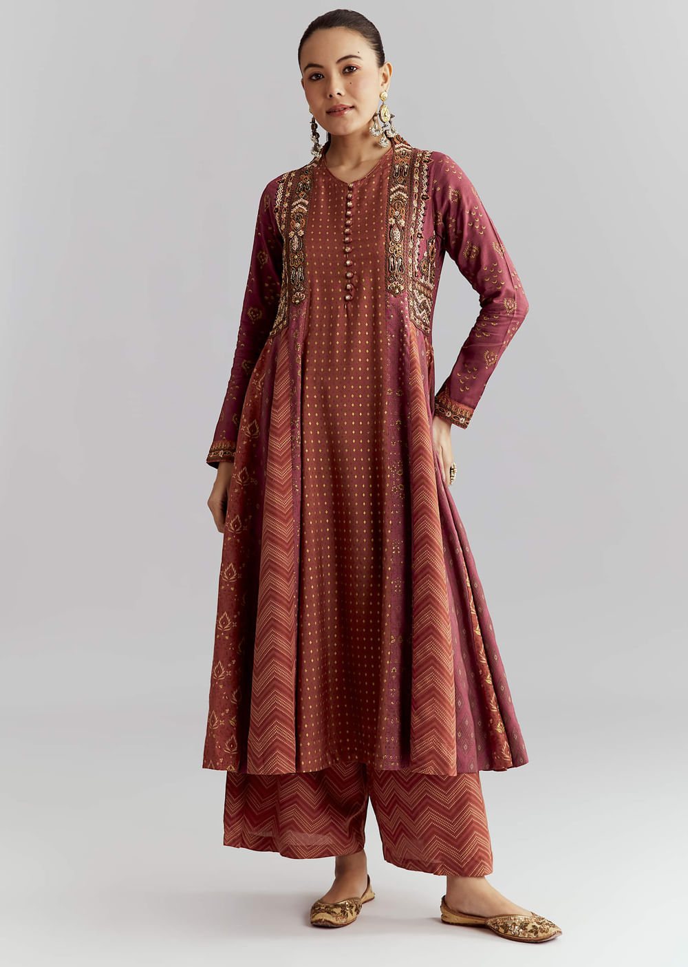 For a heritage look with subtle shine, this brown silk anarkali suit features indie print with cut dana and thread work that stays easy to wear. The soft flare moves... More Product Details