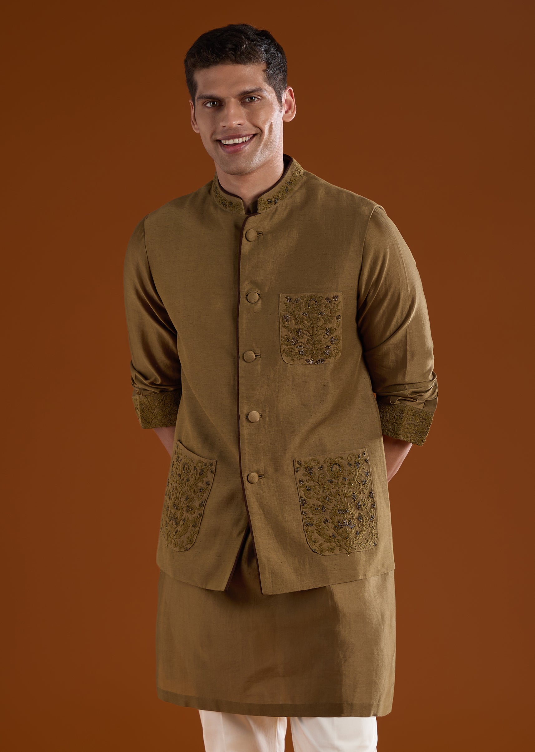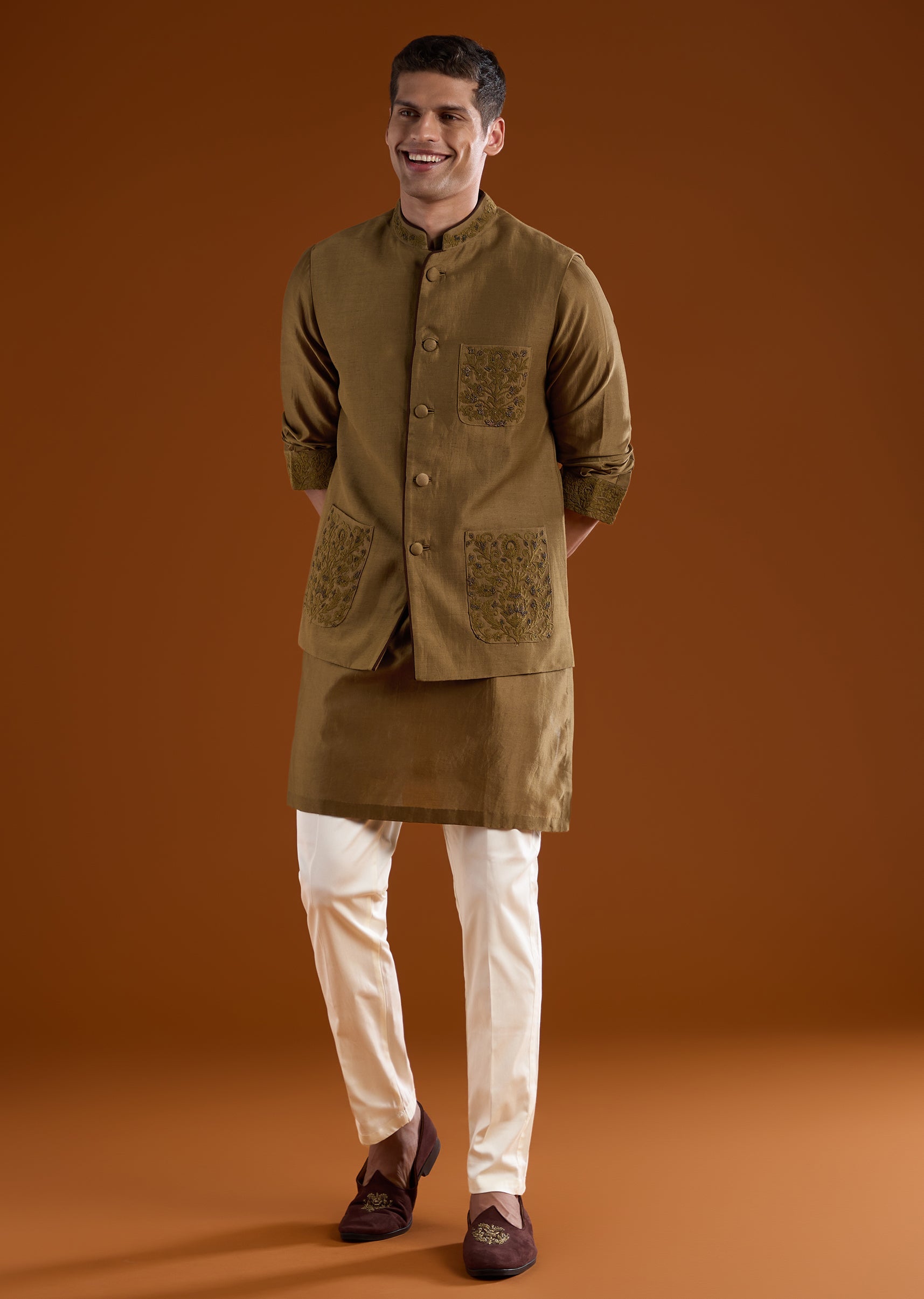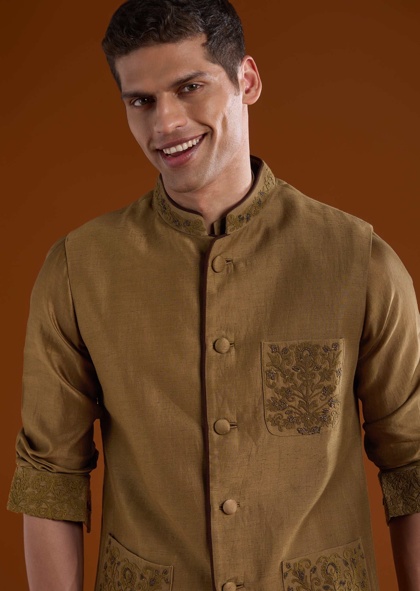 An elegant option for haldi, mehendi, and reception functions, this brown silk kurta set features refined bead and thread work for added depth. The full sleeves and mandarin collar provide a timeless silhouette, making it a versatile choice for groomsmen across multiple ceremonies. Awarded as the Most Trusted Brand, we're delivering styles you love, just as promised.