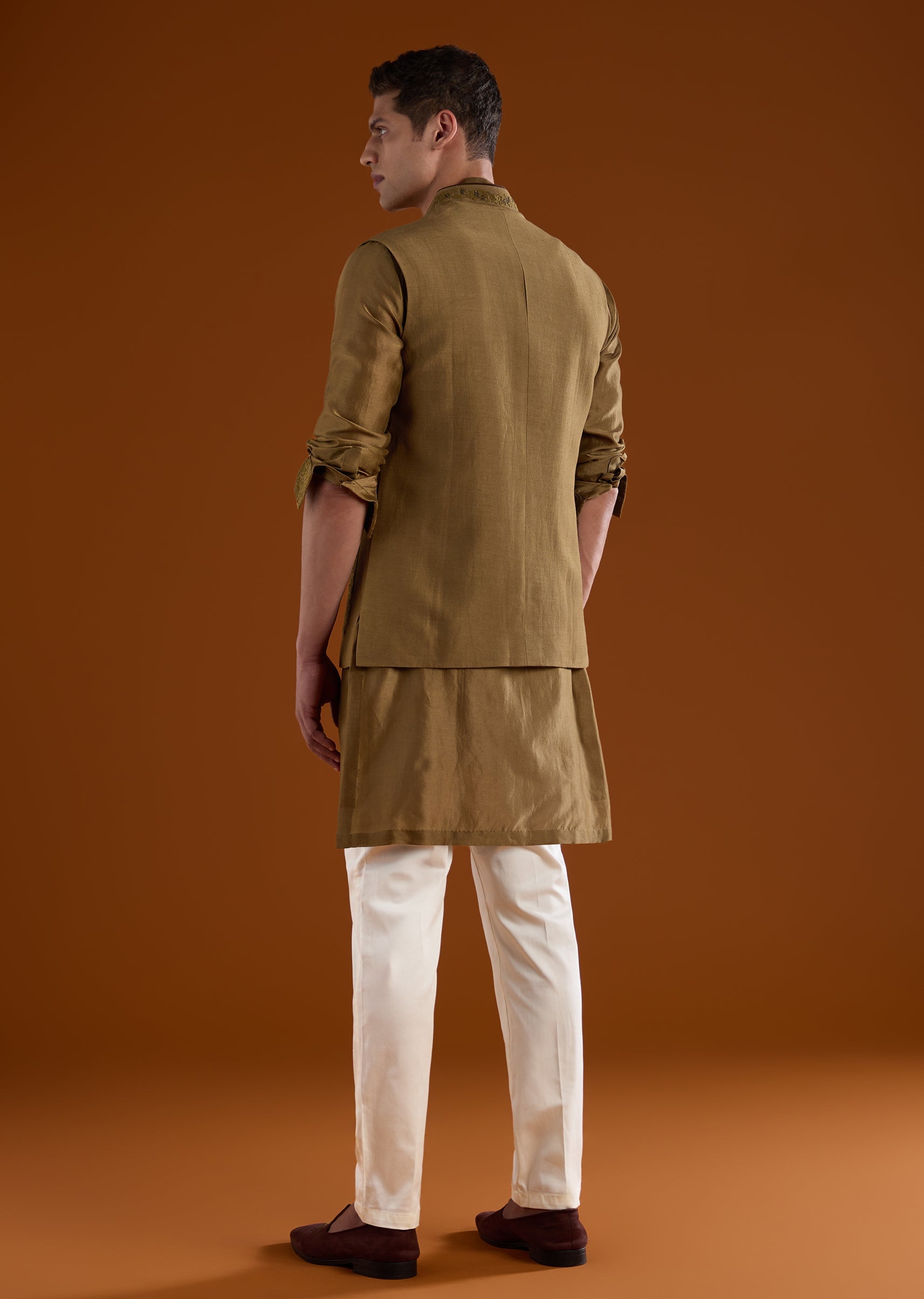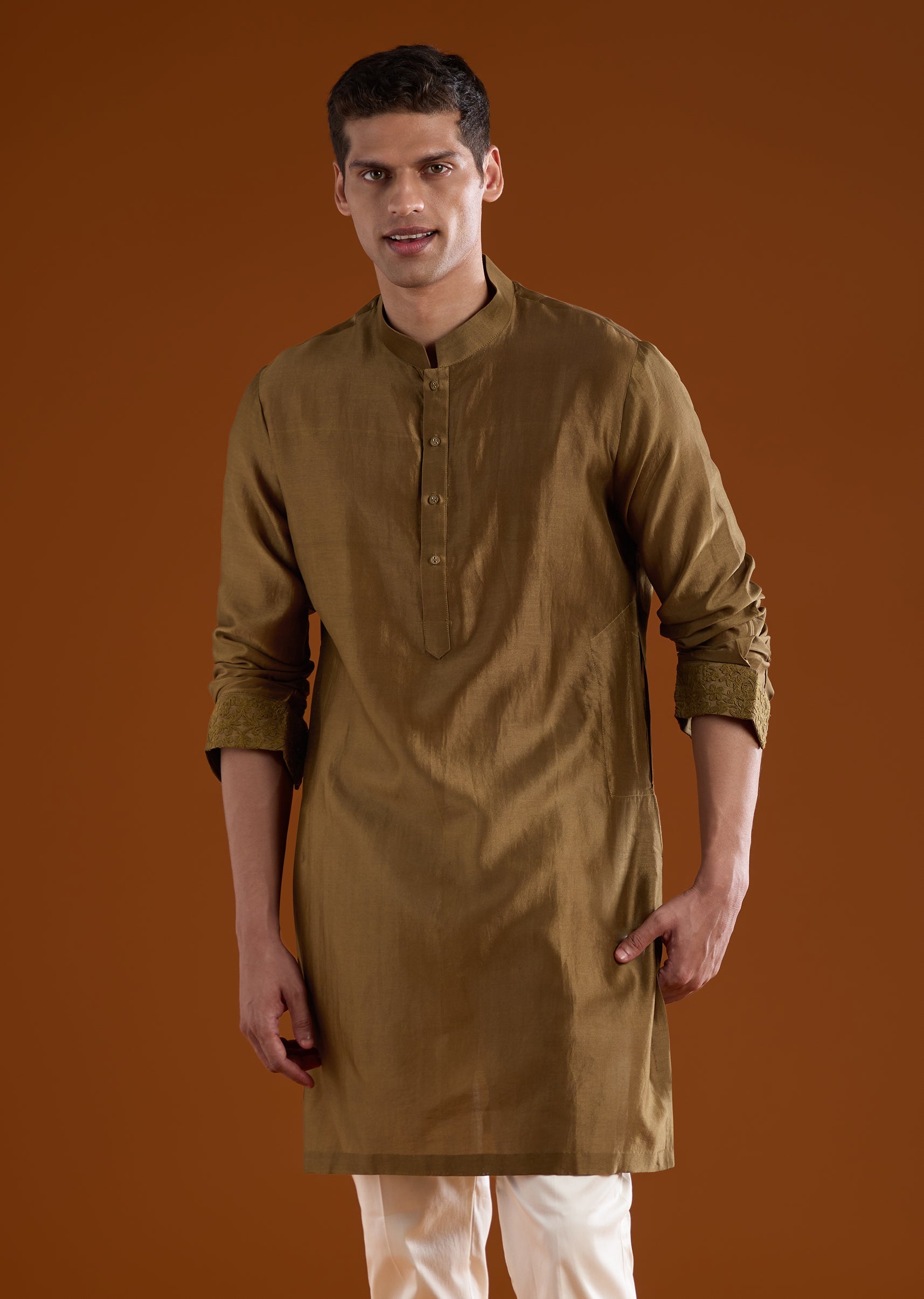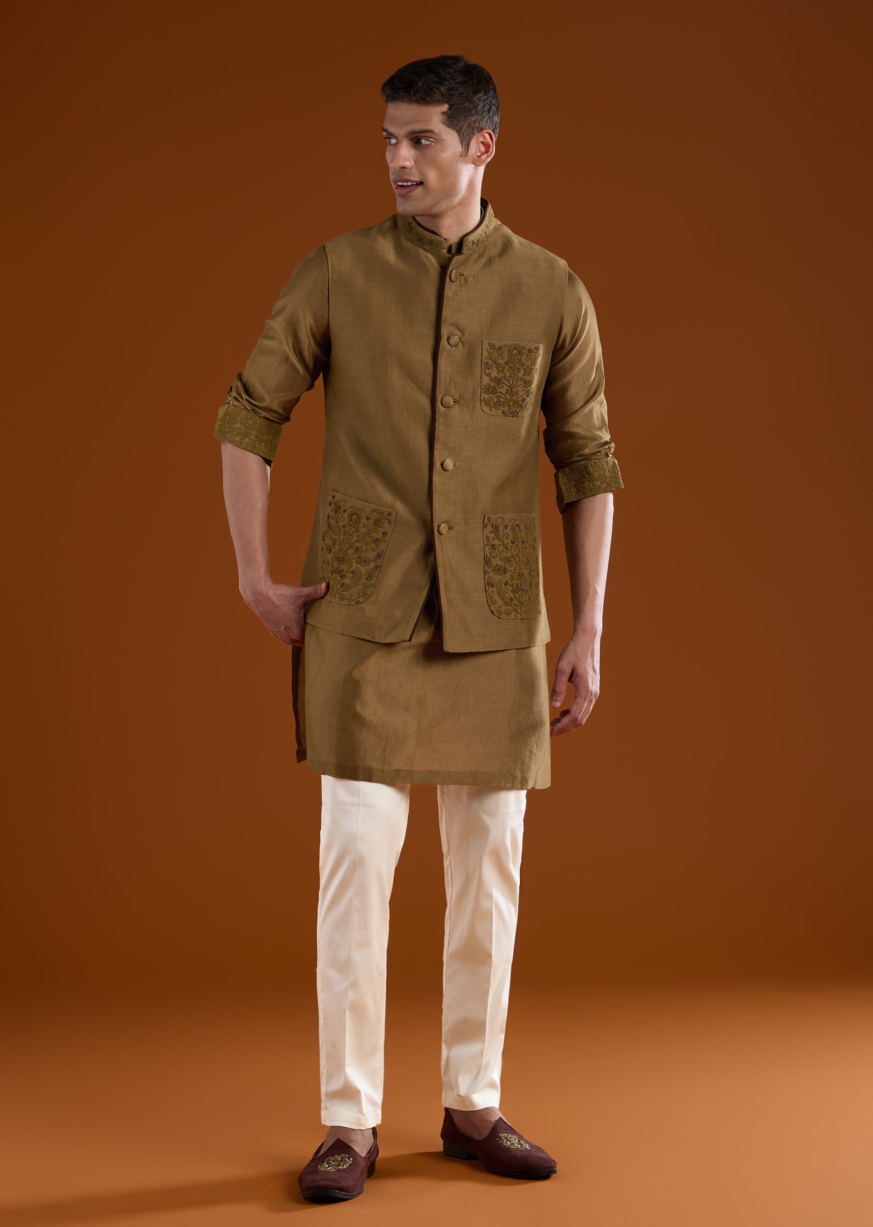 An elegant option for haldi, mehendi, and reception functions, this brown silk kurta set features refined bead and thread work for added depth. The full sleeves and mandarin collar provide a timeless silhouette, making it a versatile choice for groomsmen across multiple ceremonies. Awarded as the Most Trusted Brand, we're delivering styles you love, just as promised.