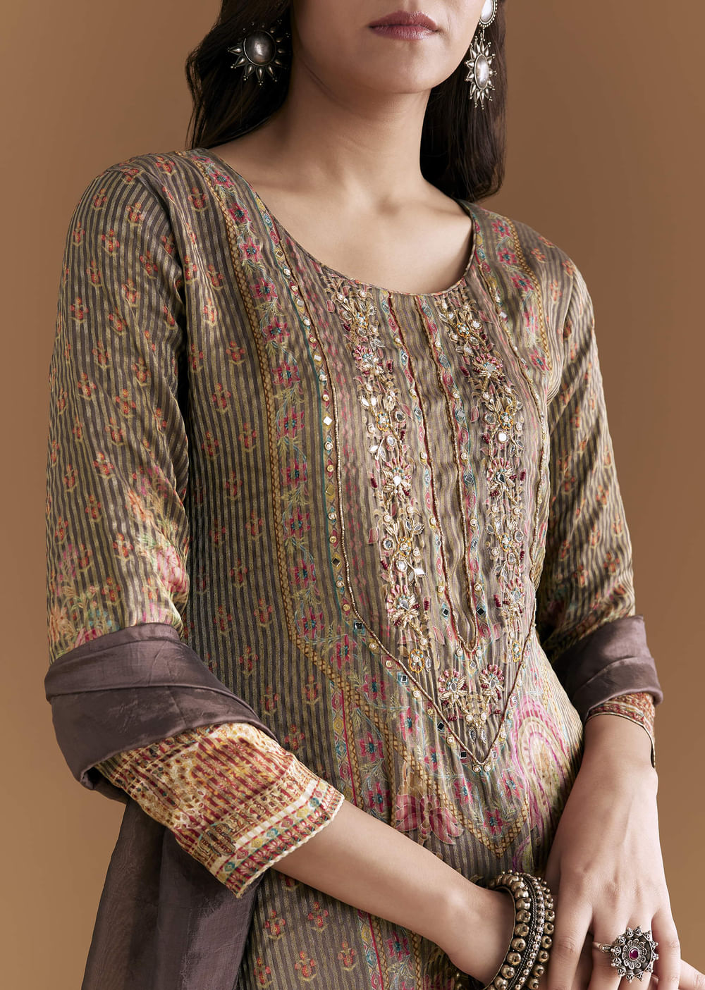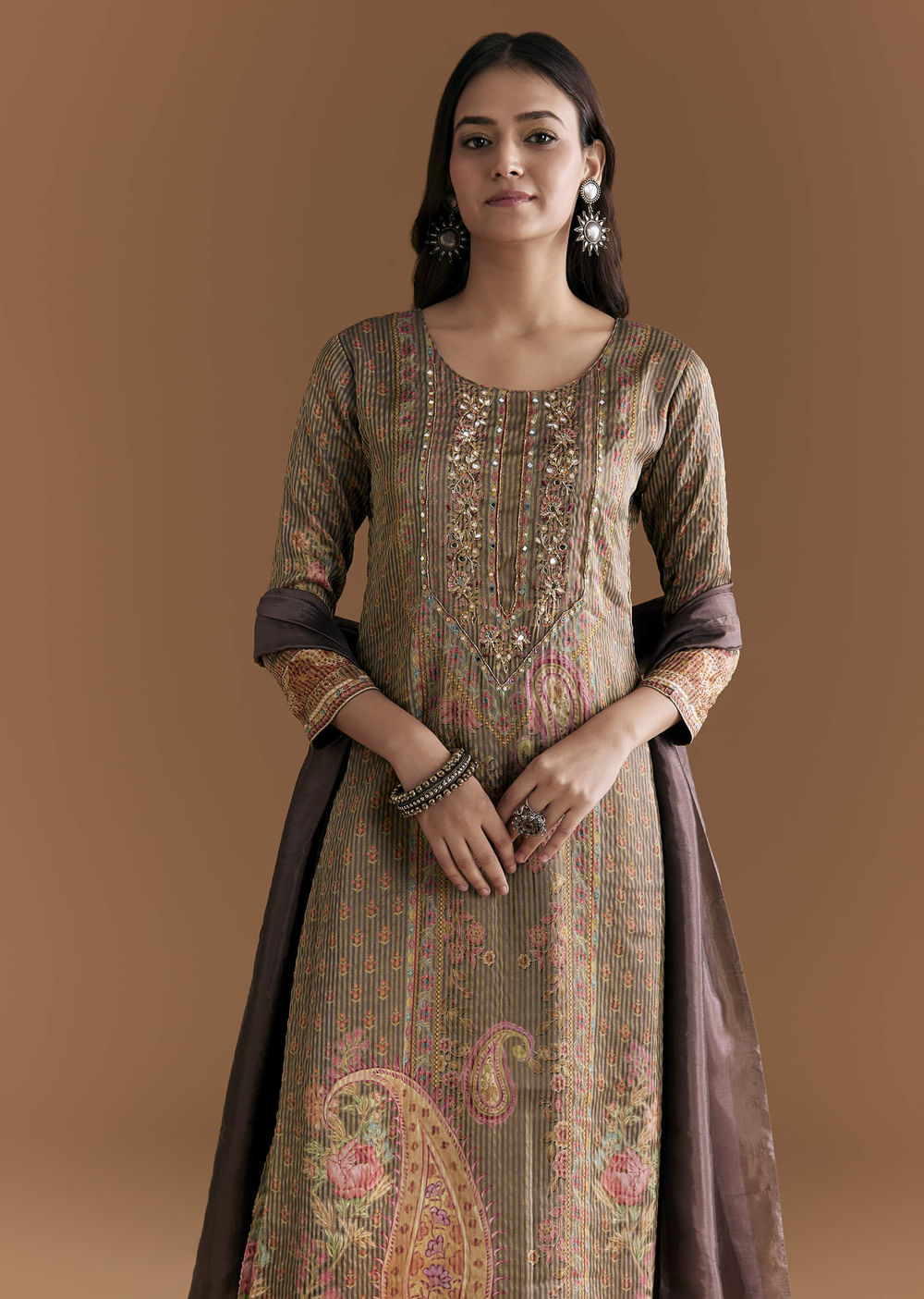 On busy function days, this brown silk kurta set keeps the silhouette sharp while floral and paisley prints add quiet pattern. Small moti and mirror touches give just enough highlight... More Product Details