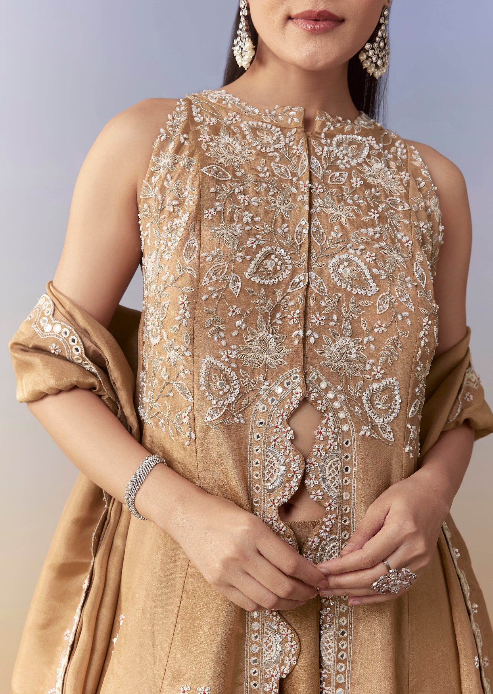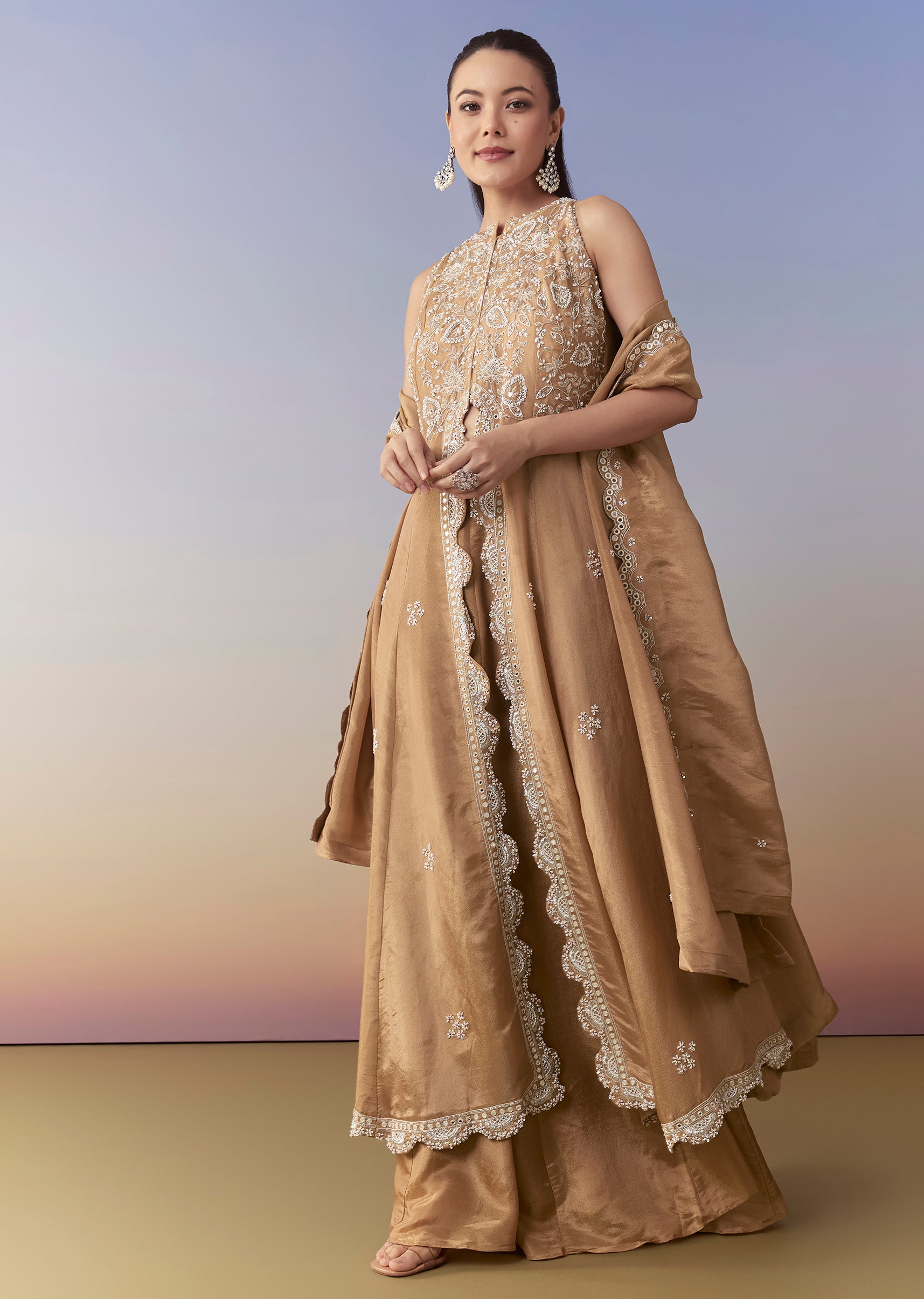 Embrace refined Indo-western elegance with this light brown front-slit anarkali, beautifully detailed with cutdana and bead work for a subtle festive shimmer. The scallop-cut border adds graceful definition, while the... More Product Details