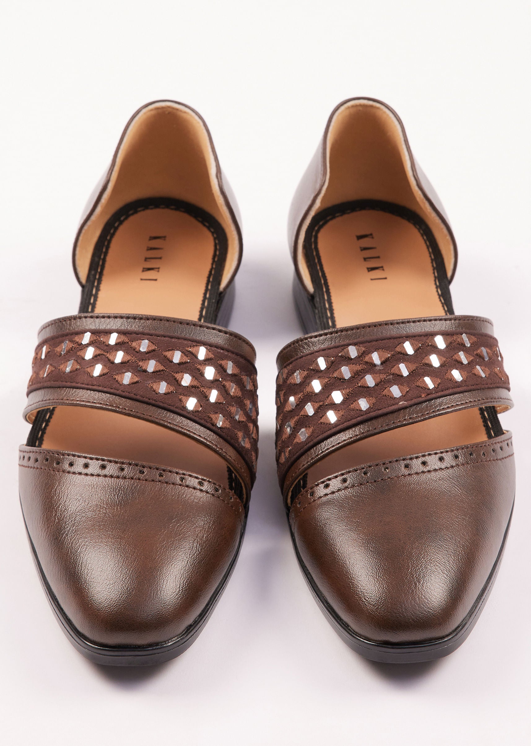 - These brown suede juttis are adorned with intricate mirror work detailing creating a perfect fusion of traditional craftsmanship and contemporary design.