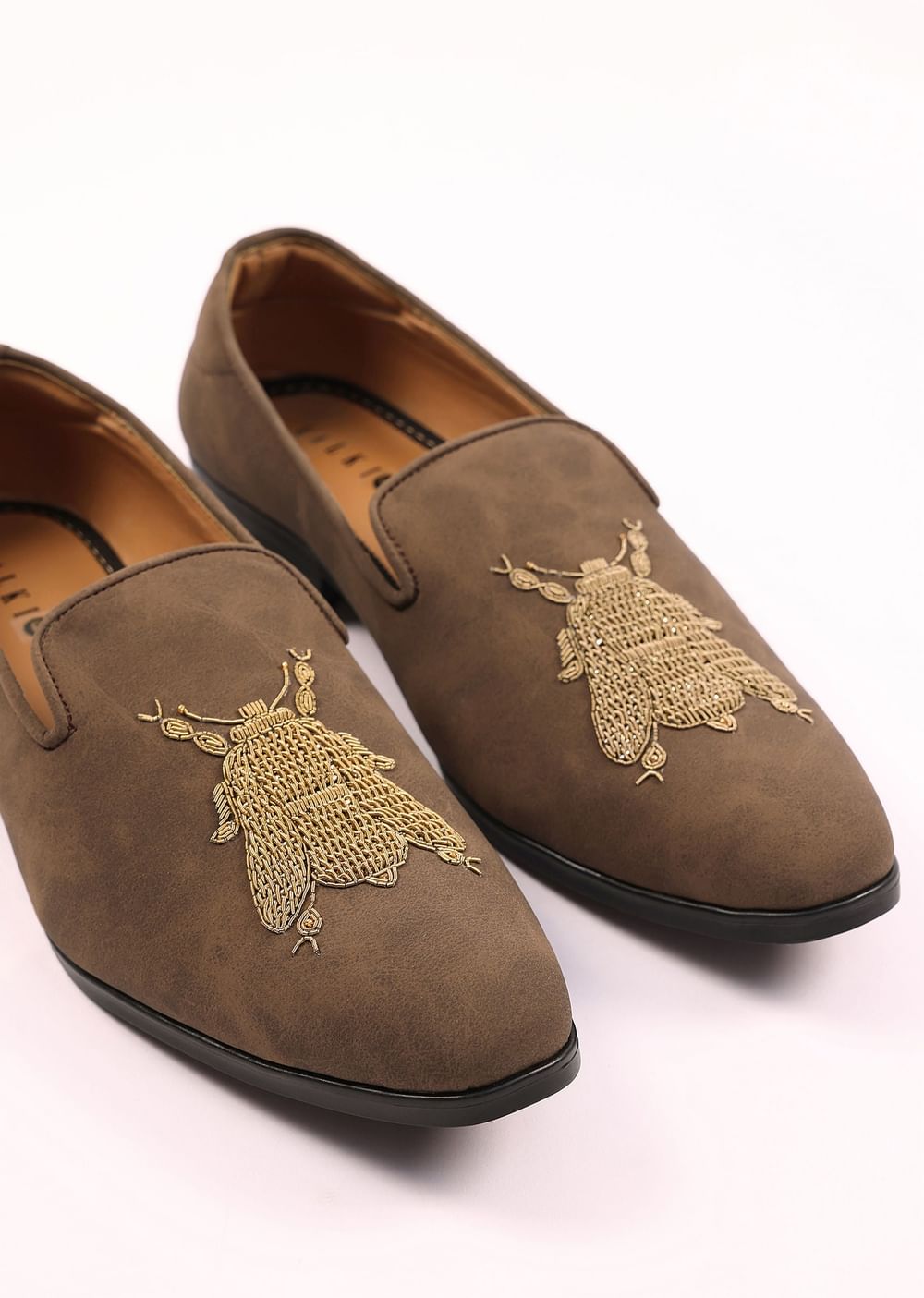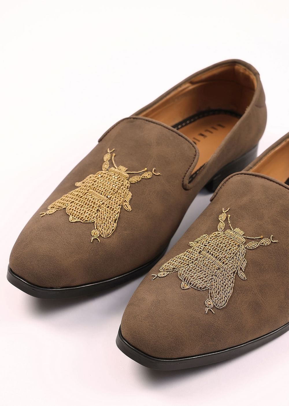 Add a touch of royalty to your footwear collection with these brown juttis adorned with exquisite zardosi embroidery. The detailed craftsmanship makes them a standout piece for any traditional ensemble.... More Product Details