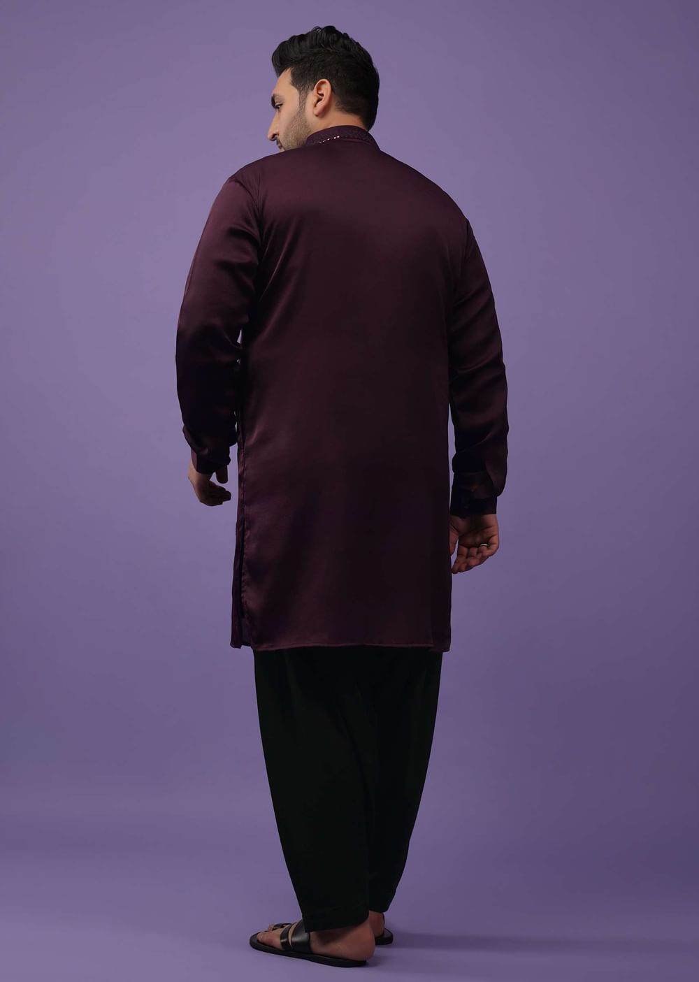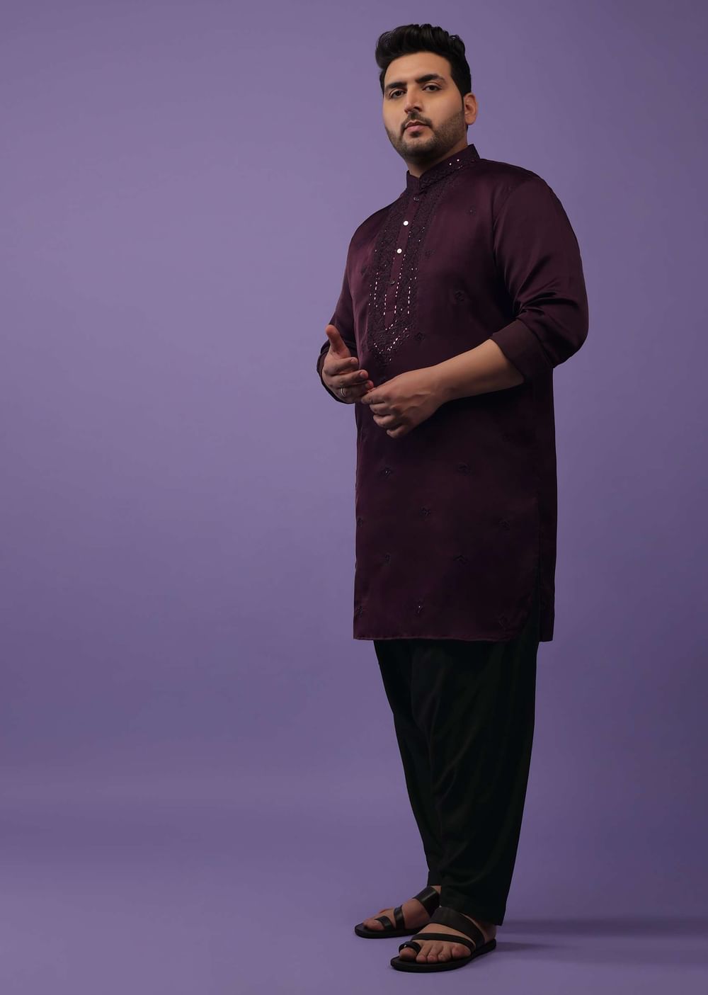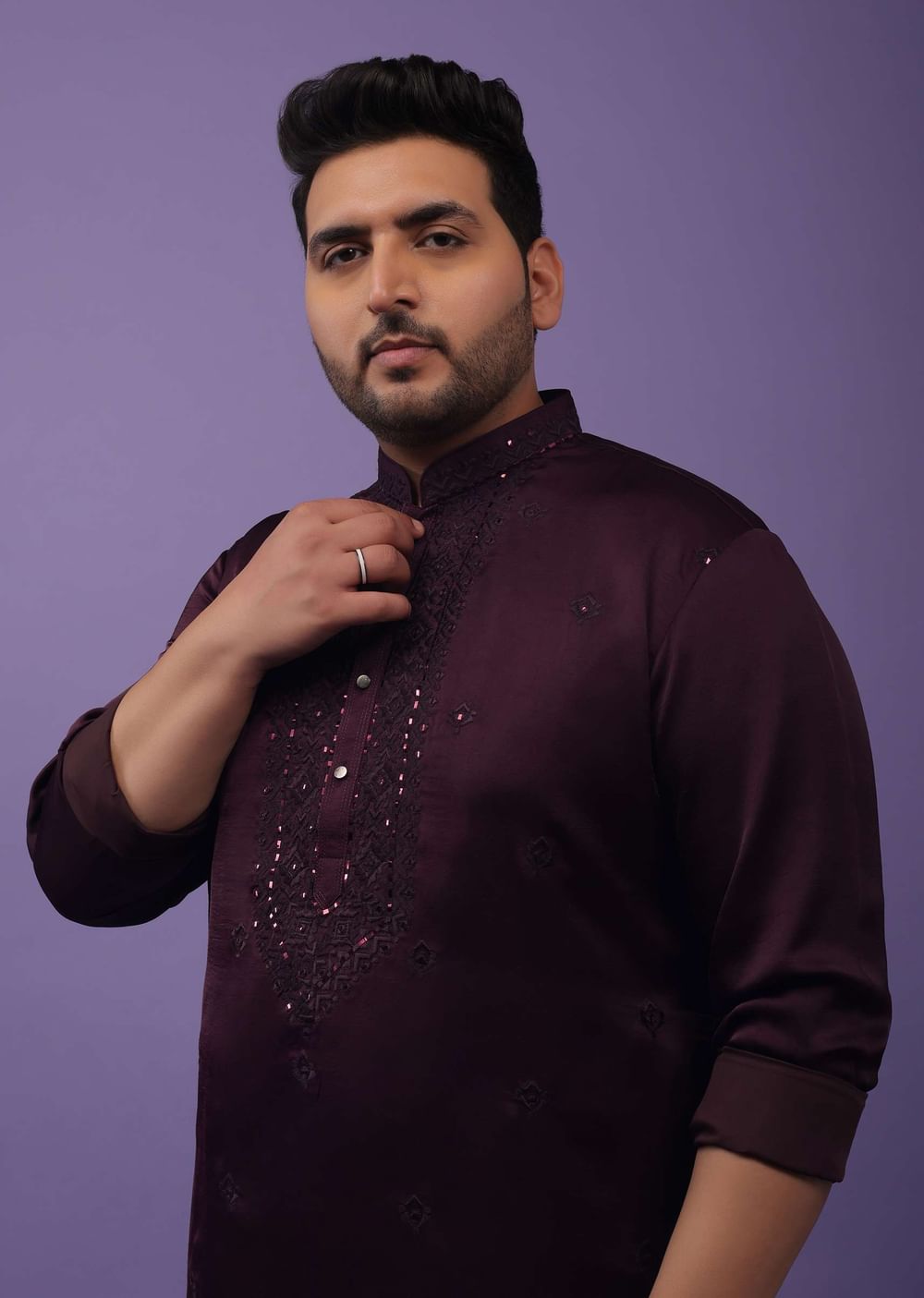 Festivities begin with Kalki in the most fantastic ways. Festive Prune Purple Kurta set in handloom silk suiting fabric. The outfit is fabricated in Mini Silk. The kurta is crafted in a mandarin collar with full sleeves, and front button closure from the yoke to the bodice. The sleeves come with classic square cuffs. The collar of the kurta and the yoke come with lucknowi embroidery and shiny film. The kurta comes with embroidered buttis, and shiny film serving as beautiful mirror work. The kurta comes with pockets on both sides. The outfit is paired with suitable bottoms. Elevate the look by pairing the outfit with some classic mules. Button design, shape, and size may vary as per availability. Awarded As The Most Trusted Brand We'Re Delivering Styles You Love Just As Promised.