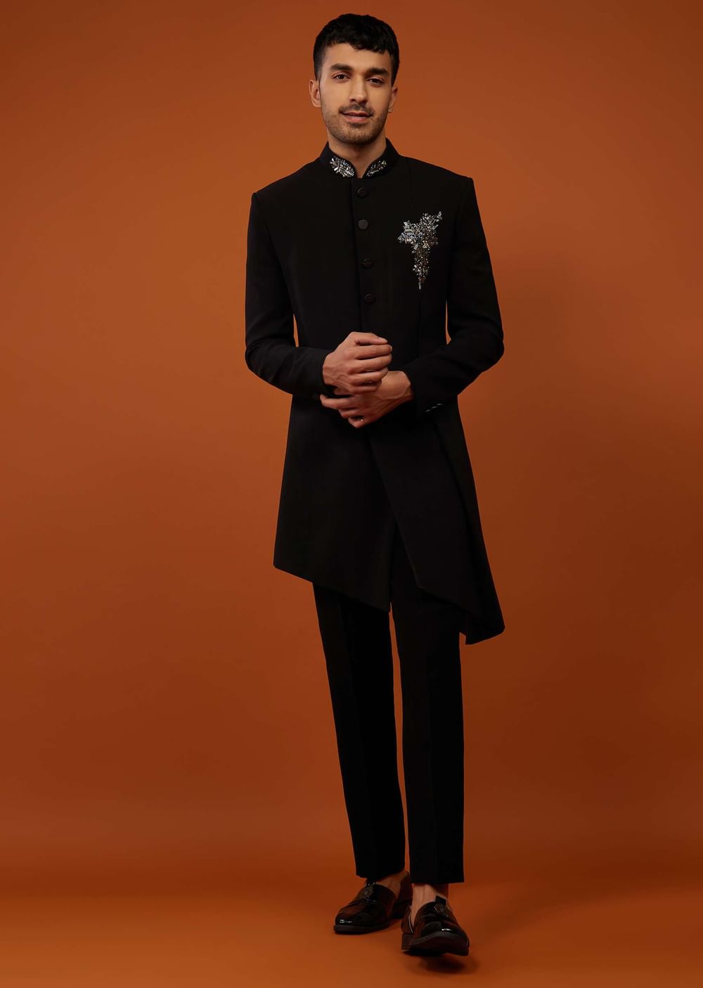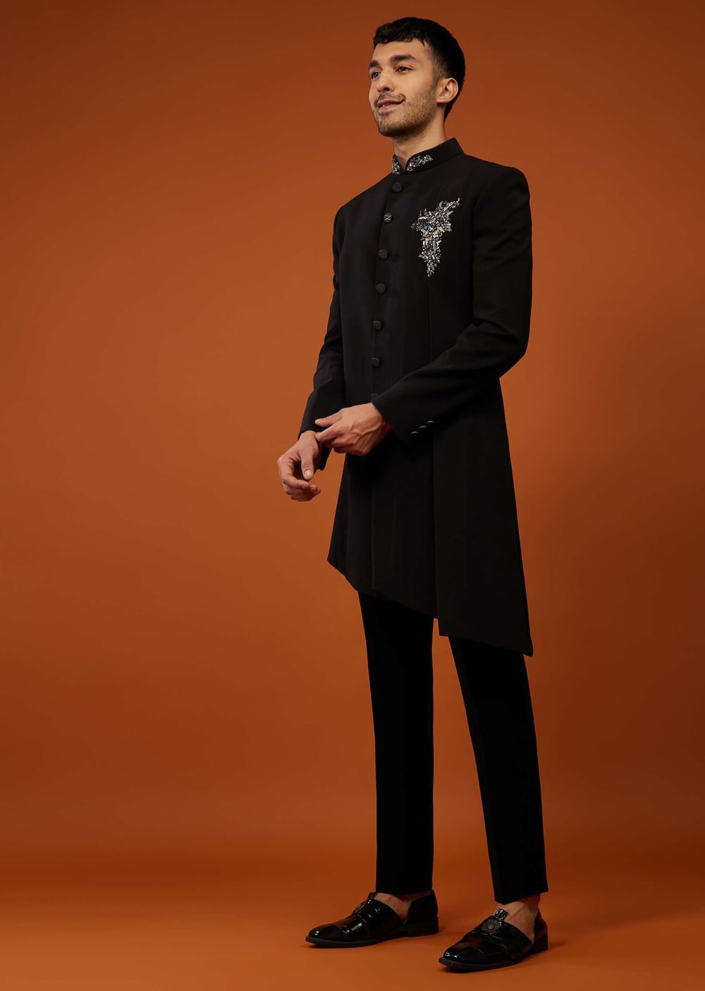 Caviar black embroidered indo-western sherwani set fabricated in imported suiting fabric.It comes in a mandarin collar neckline with a high-low sidewards slit and embroidery, and is paired with matching trouser pants.Buttons and Accessories may vary in color, shape and size. Awarded as the Most Trusted Brand, we're delivering styles you love, just as promised.