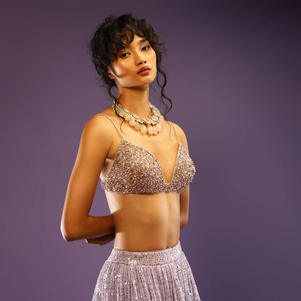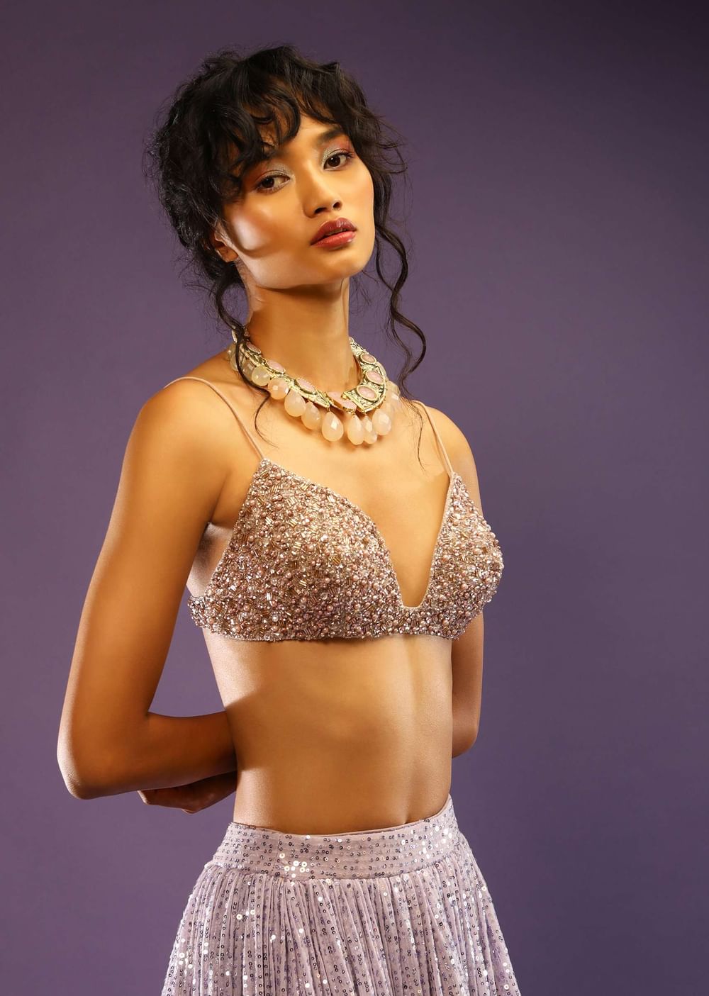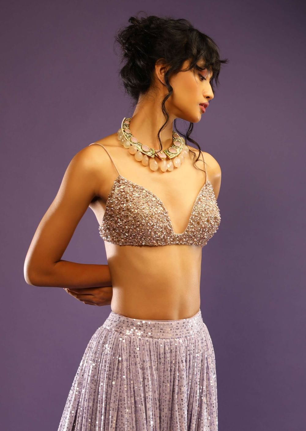 Champagne blouse with plunging neckline and heavily embroidered using moti, beads and cut dana work. It is crafted with spaghetti straps, padding and back hook closure. Awarded as the Most Trusted Brand, we're delivering styles you love, just as promised.