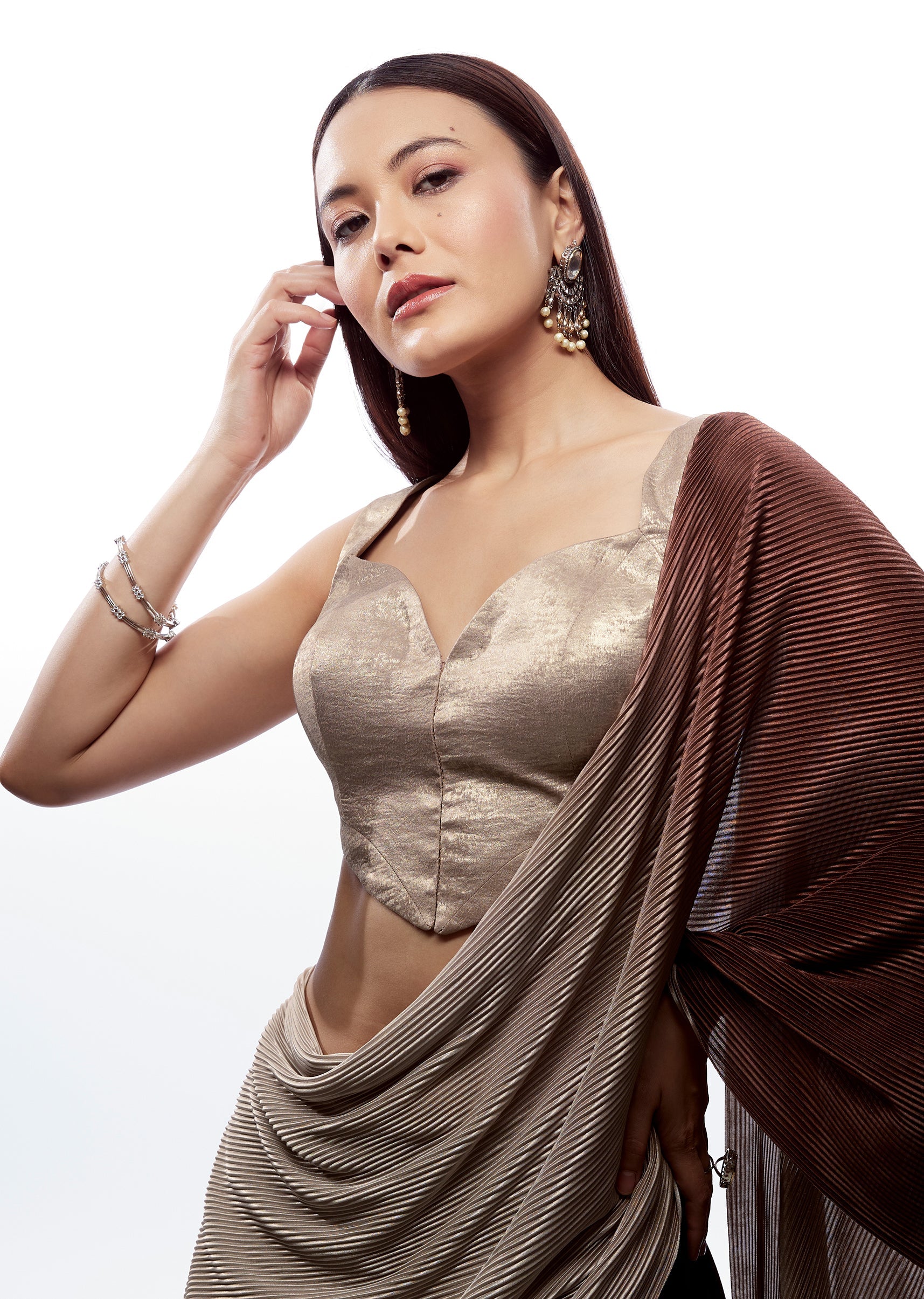 This blouse is designed for subtle glam with its sweetheart neckline and refined champagne-grey tone that complements both pastel and jewel-toned drapes. Crafted in imported fabric, it has a smooth,... More Product Details