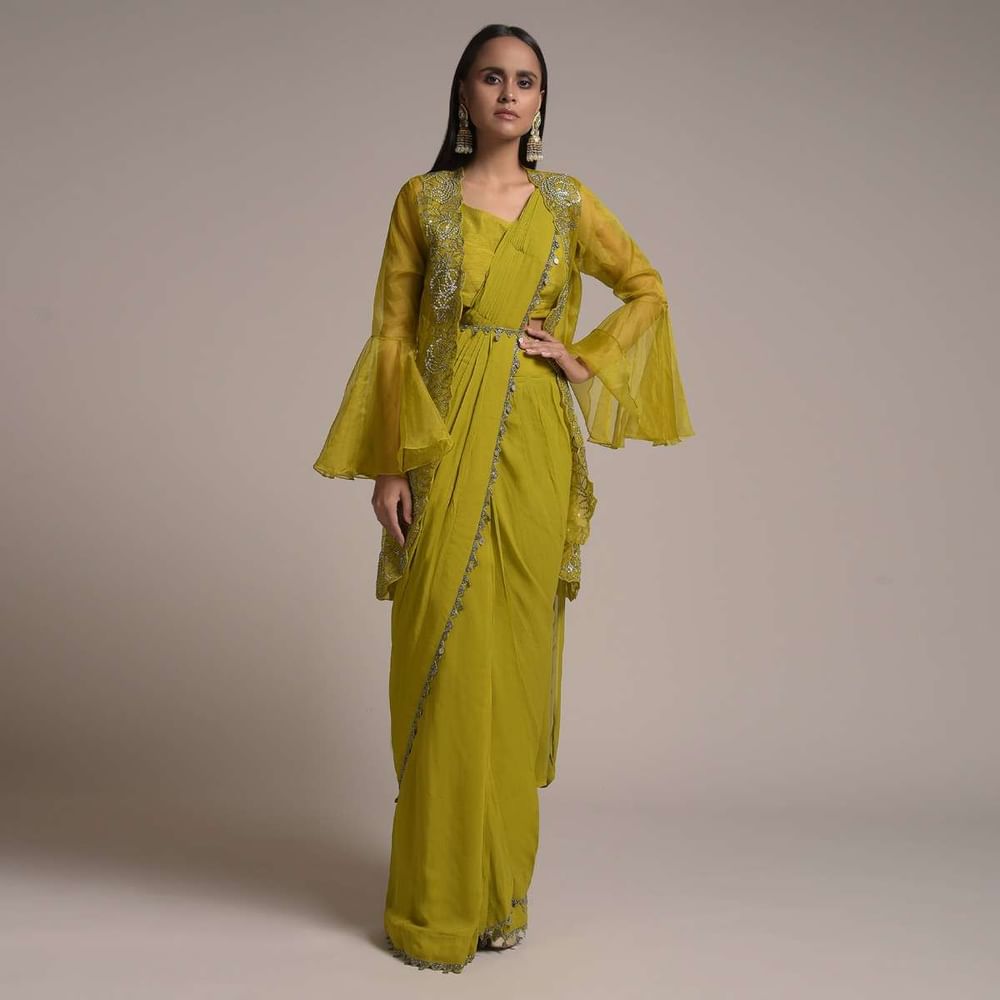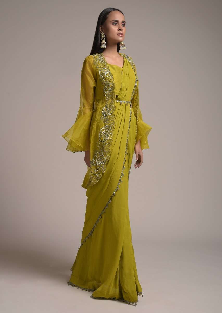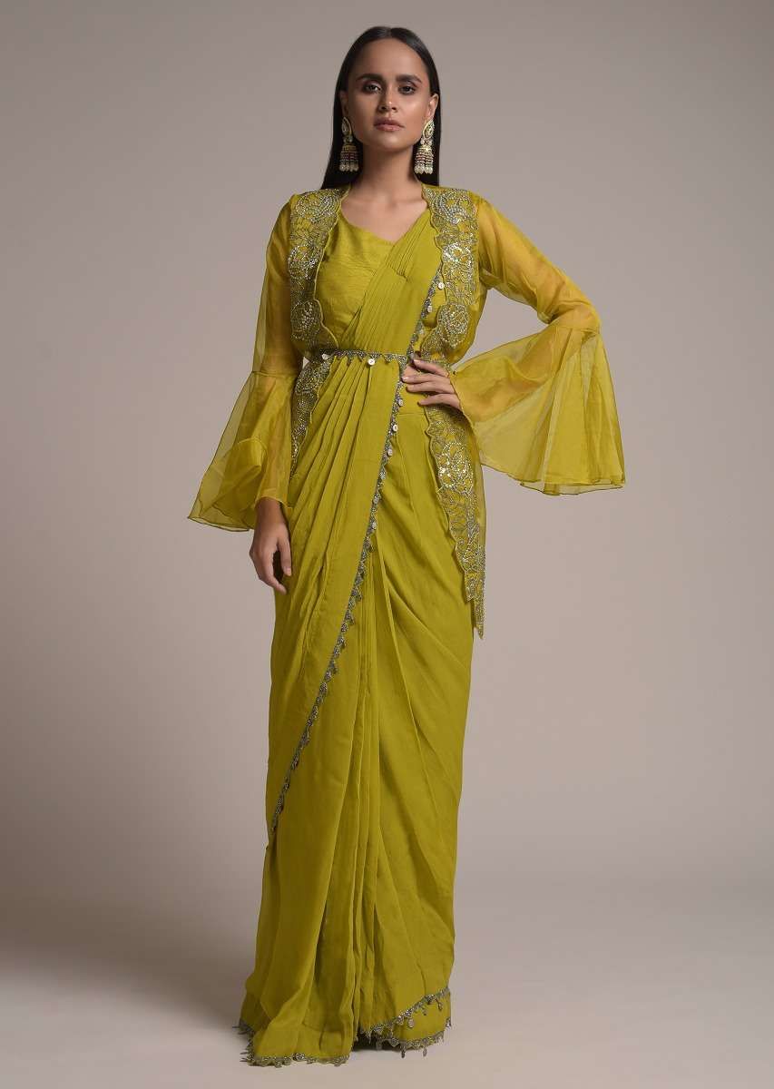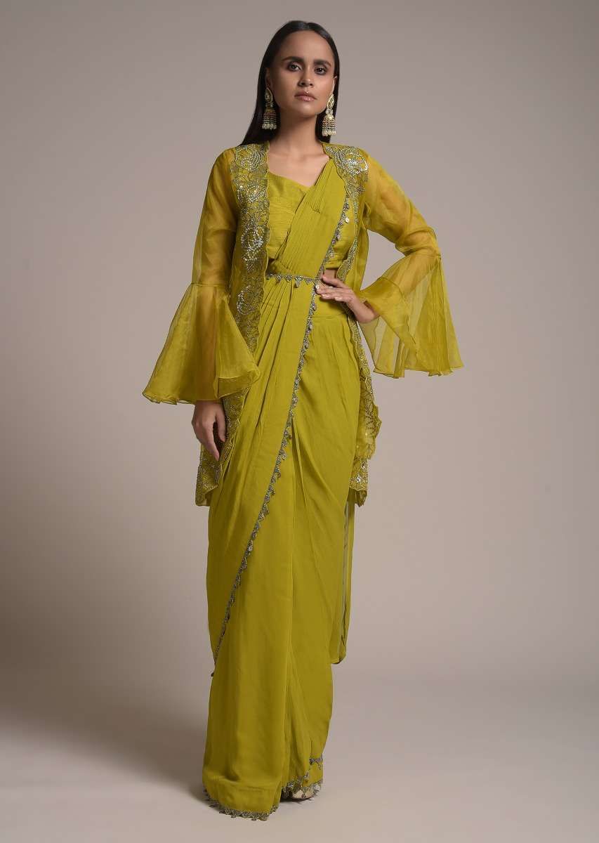 Chartreuse Green Ready Pleated Saree With Bell Sleeves Organza Jacket Online - Kalki Fashion