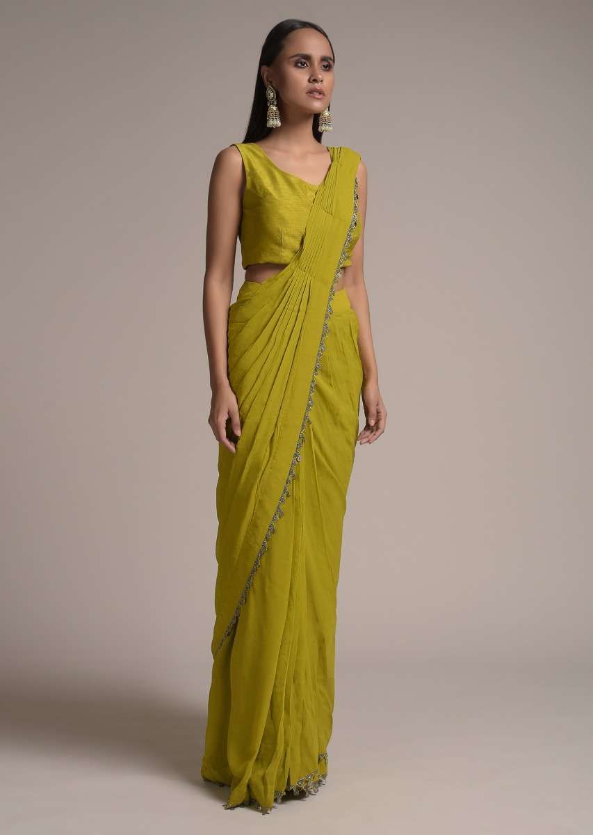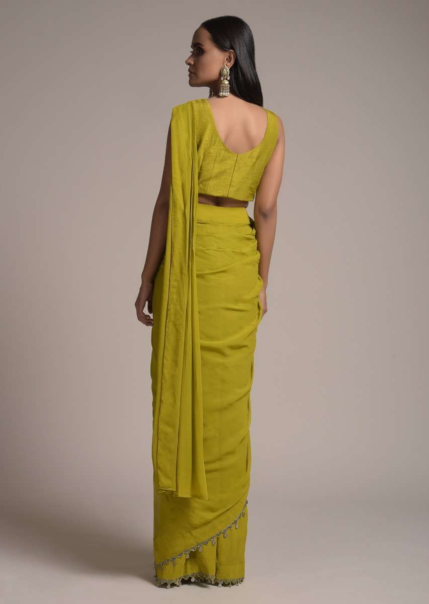 Chartreuse green ready pleated saree in georgette with cut dana and tassels on the border.Paired with a sleeveless raw silk crop top with round neckline and side zip closure.Topped with... More Product Details