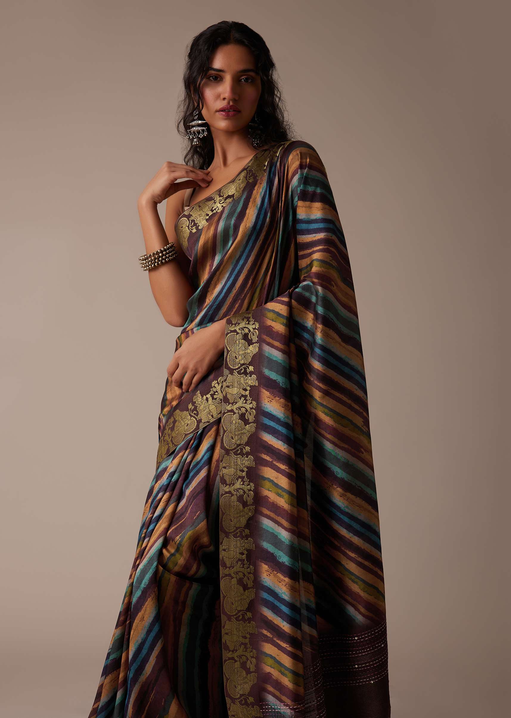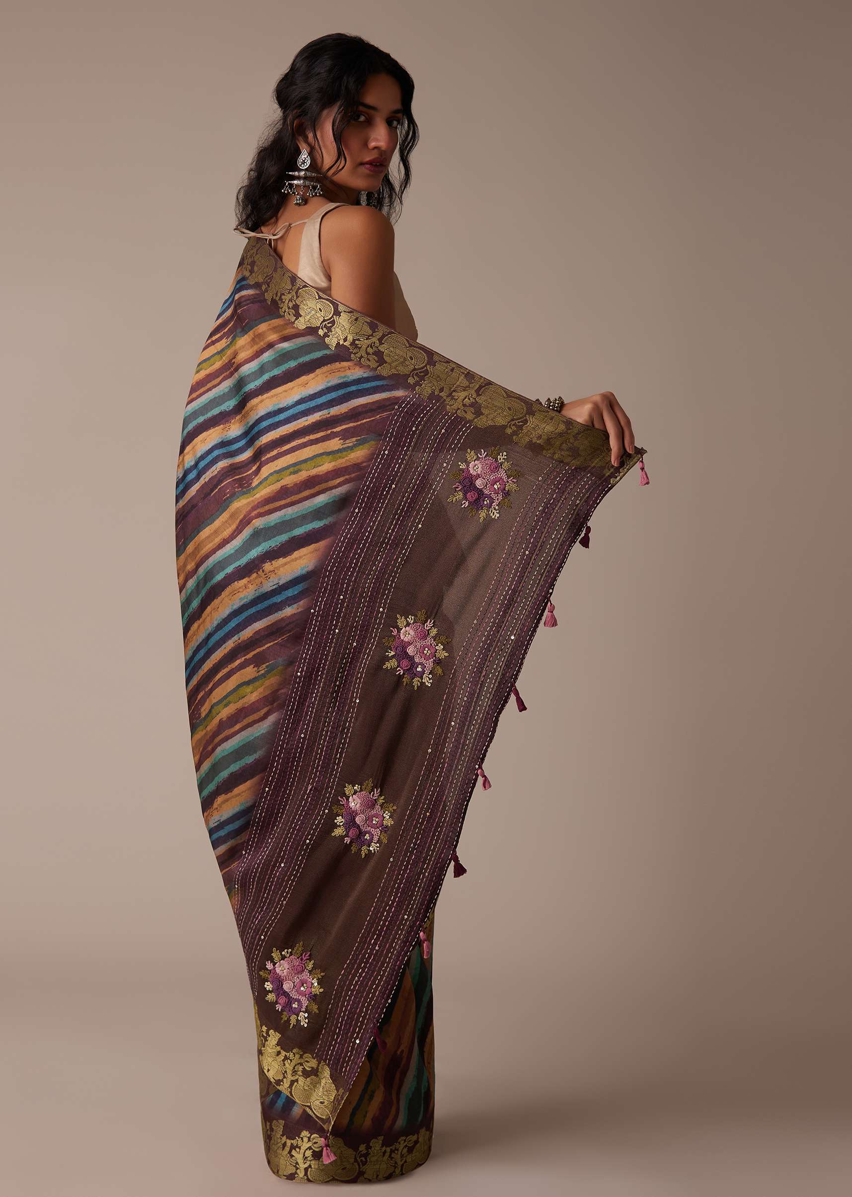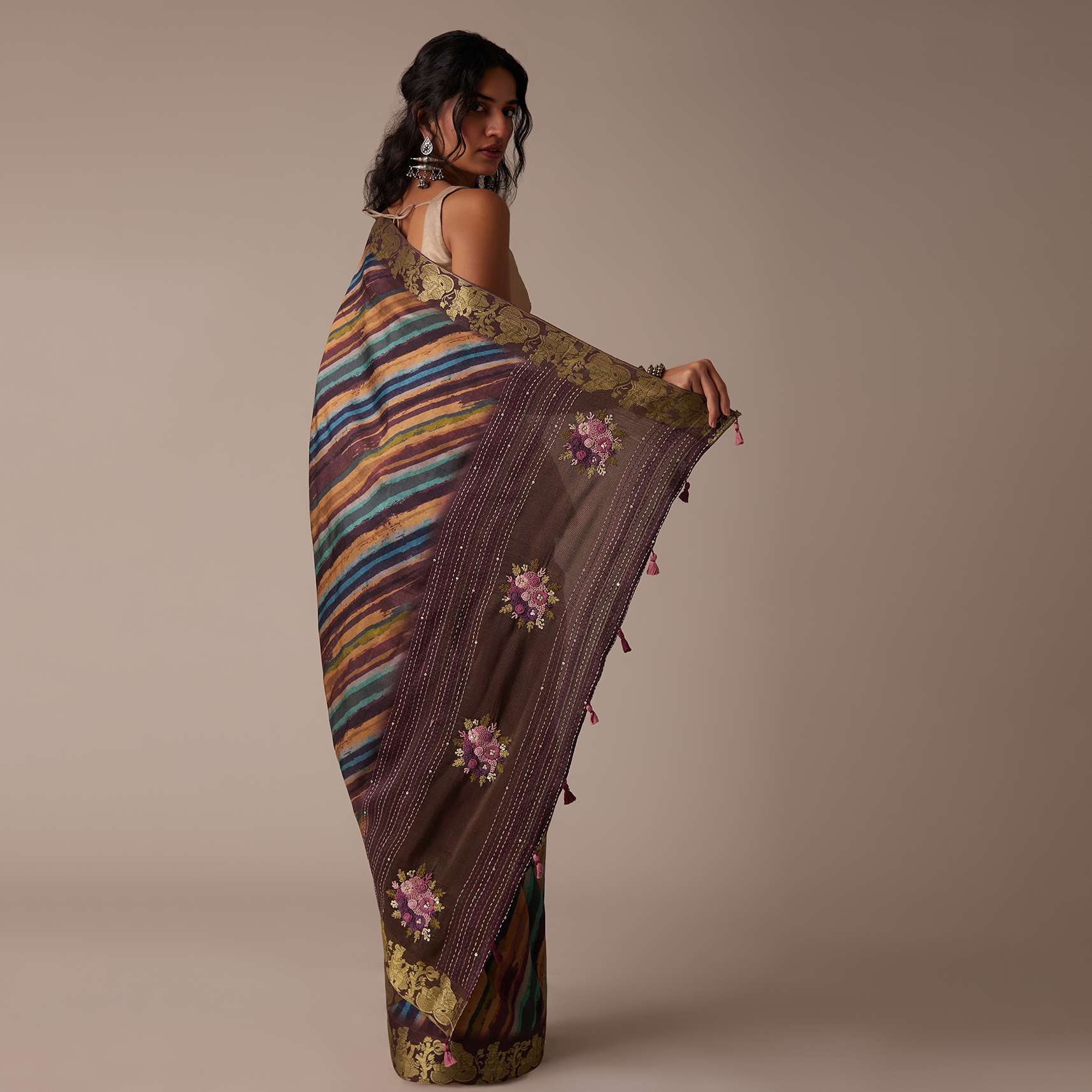 By accessorising this saree with festive kundan jewellery, a low bun, and a potli bag, you may get a festival-appropriate style.