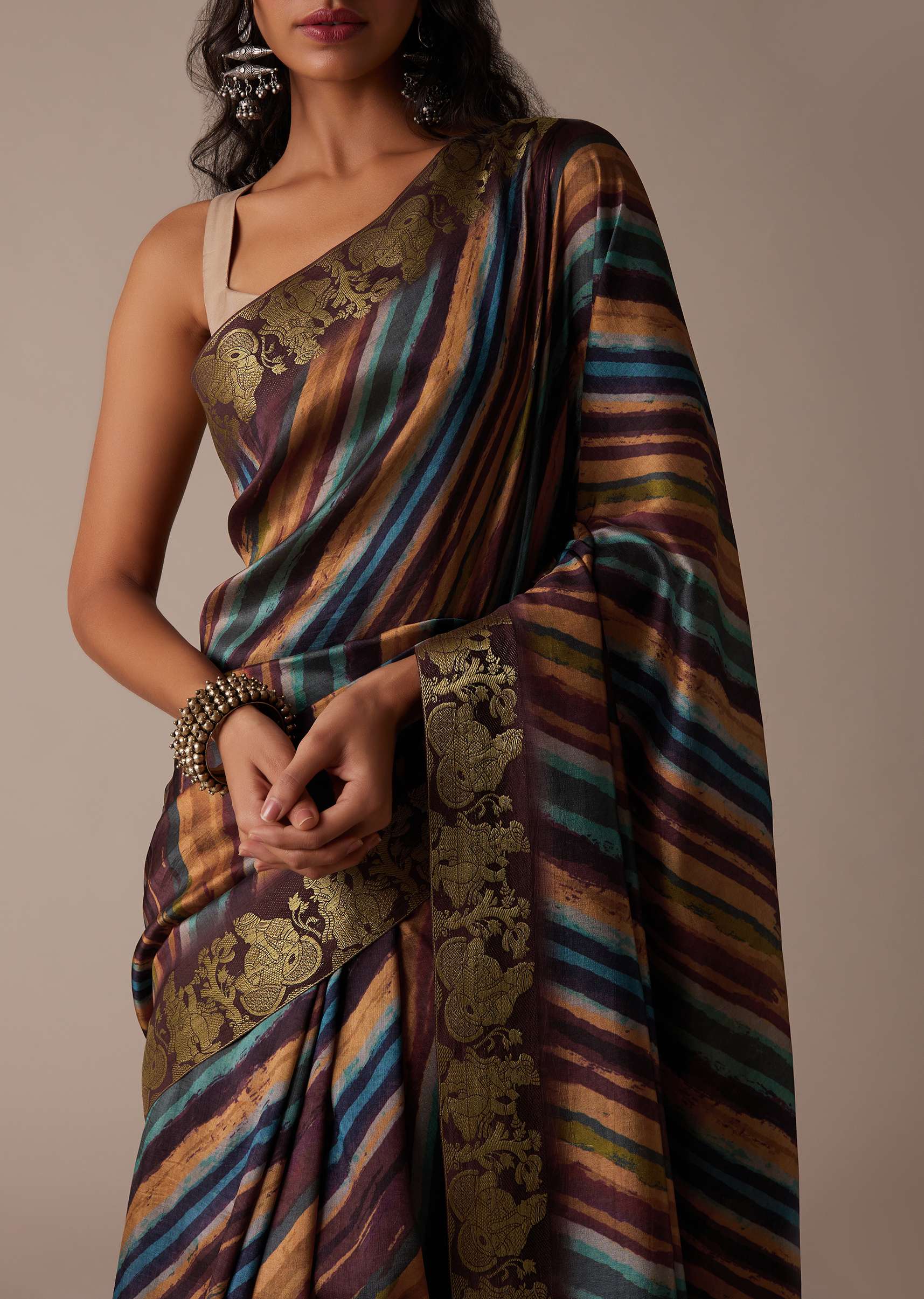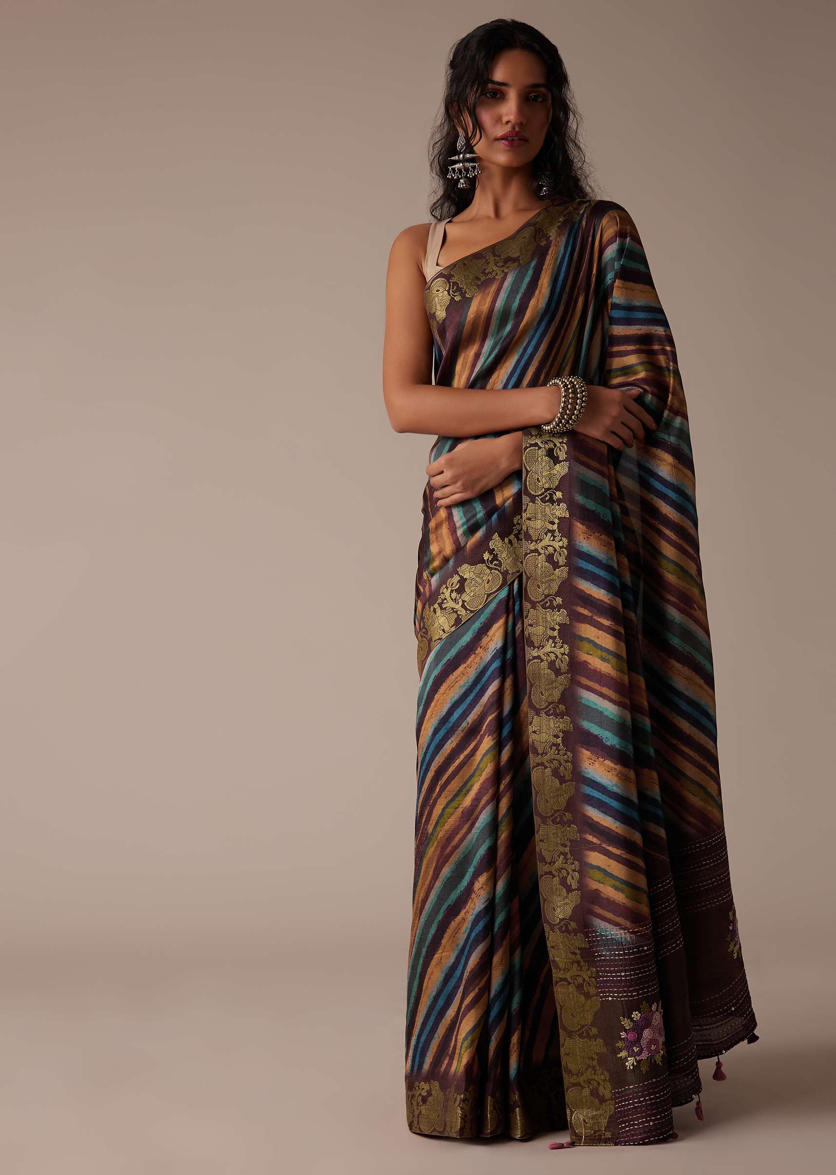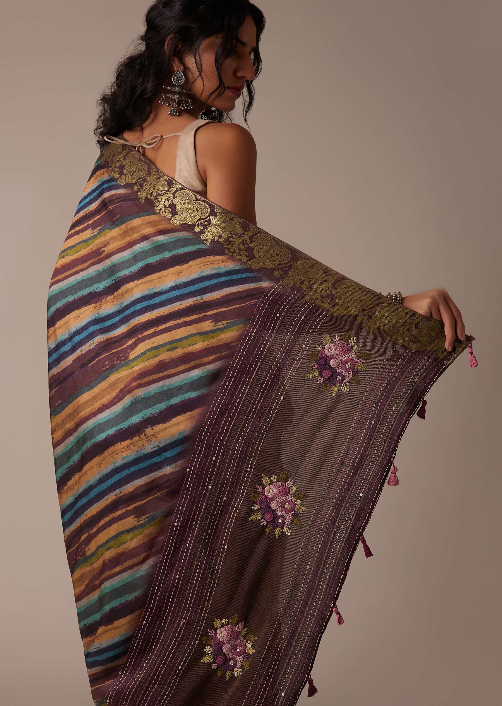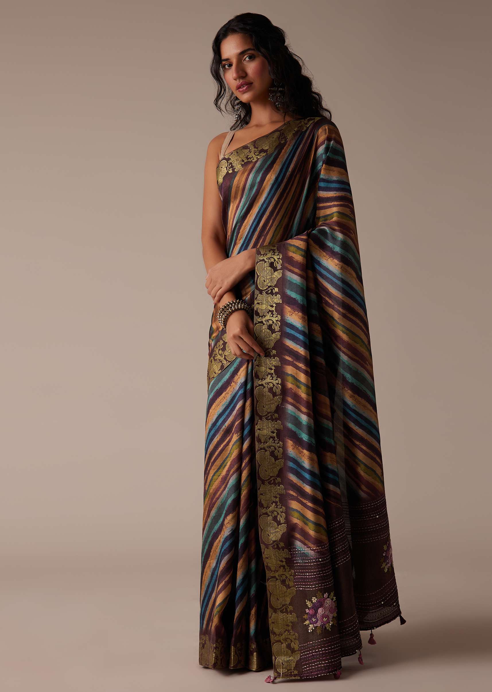 This tussar fabric saree in a chocolate brown tone embodies a seamless blend of traditional and modern styles. The intricate multicolor block print adds an ethnic touch to its graceful appearance, while the zari border further enhances its beauty. The unstitched blouse piece boasts heavy threadwork. EVENT - Perfect for a special occasion or festival. NOTE - The blouse worn by the model is designed for styling purposes. Awarded as the Most Trusted Brand, we're delivering styles you love, just as promised.