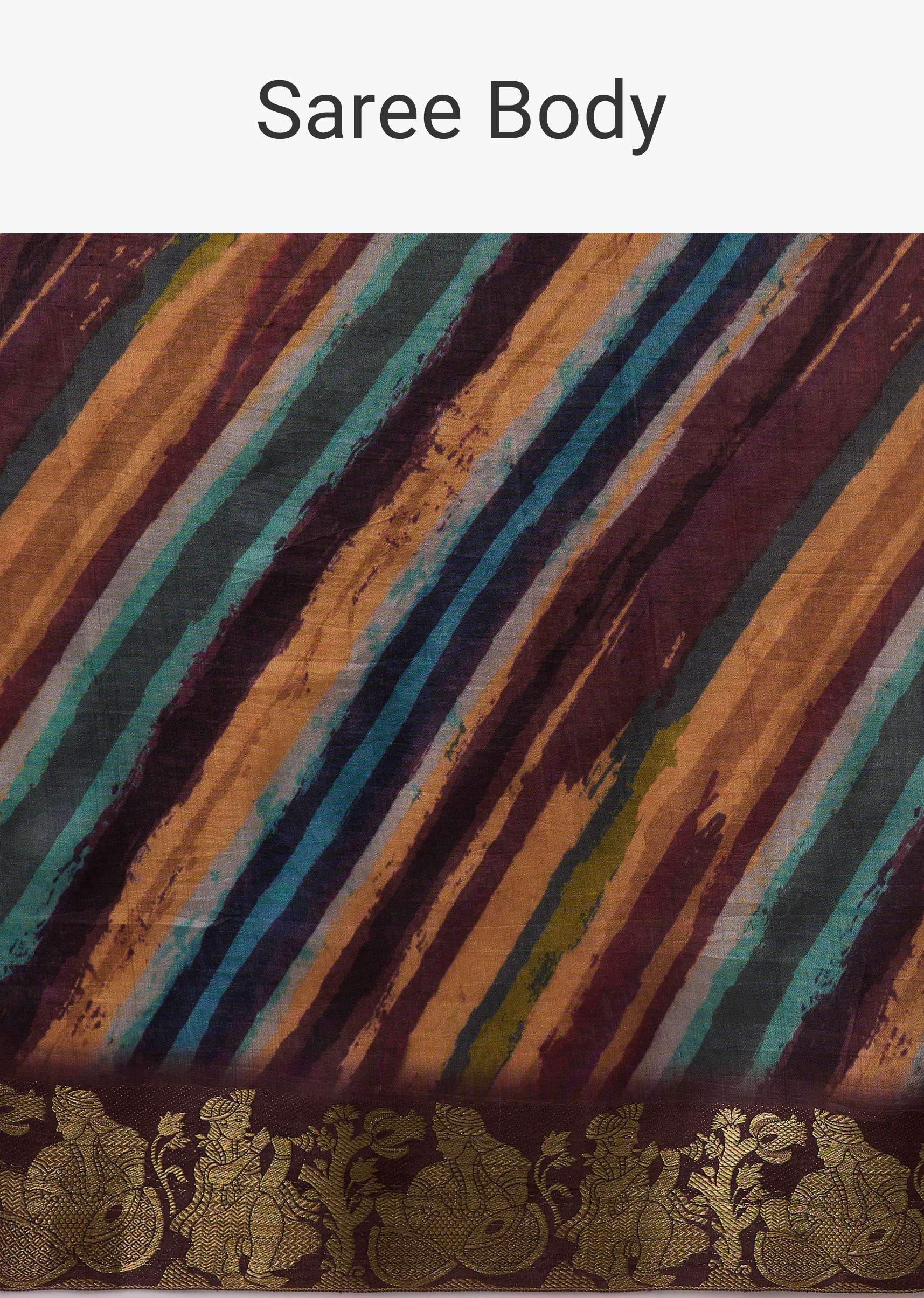 This tussar fabric saree in a chocolate brown tone embodies a seamless blend of traditional and modern styles. The intricate multicolor block print adds an ethnic touch to its graceful... More Product Details