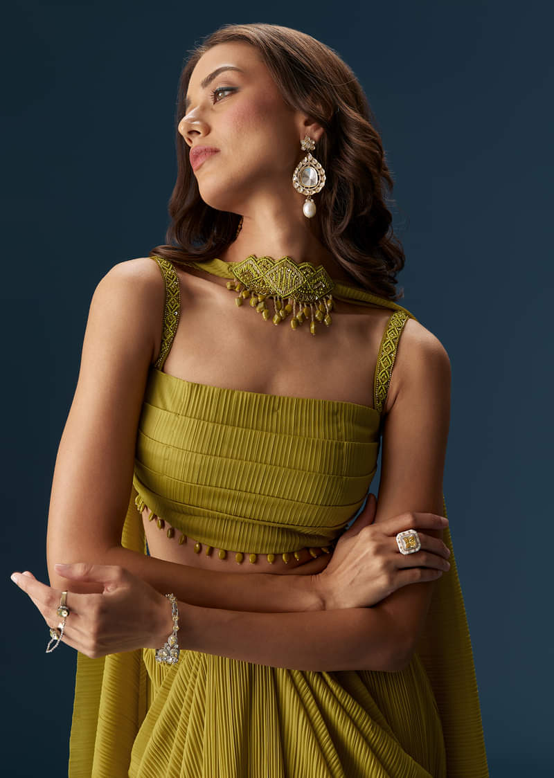Citrus Green Drape Skirt With Pleated Bustier And Choker Style Dupatta