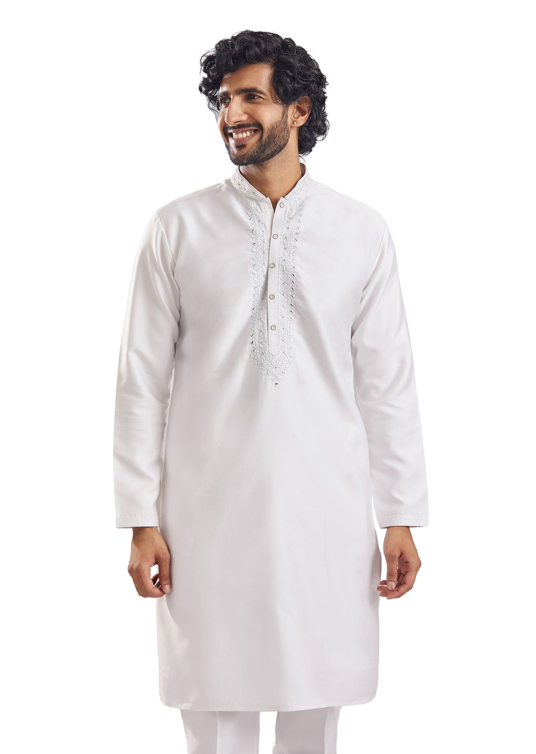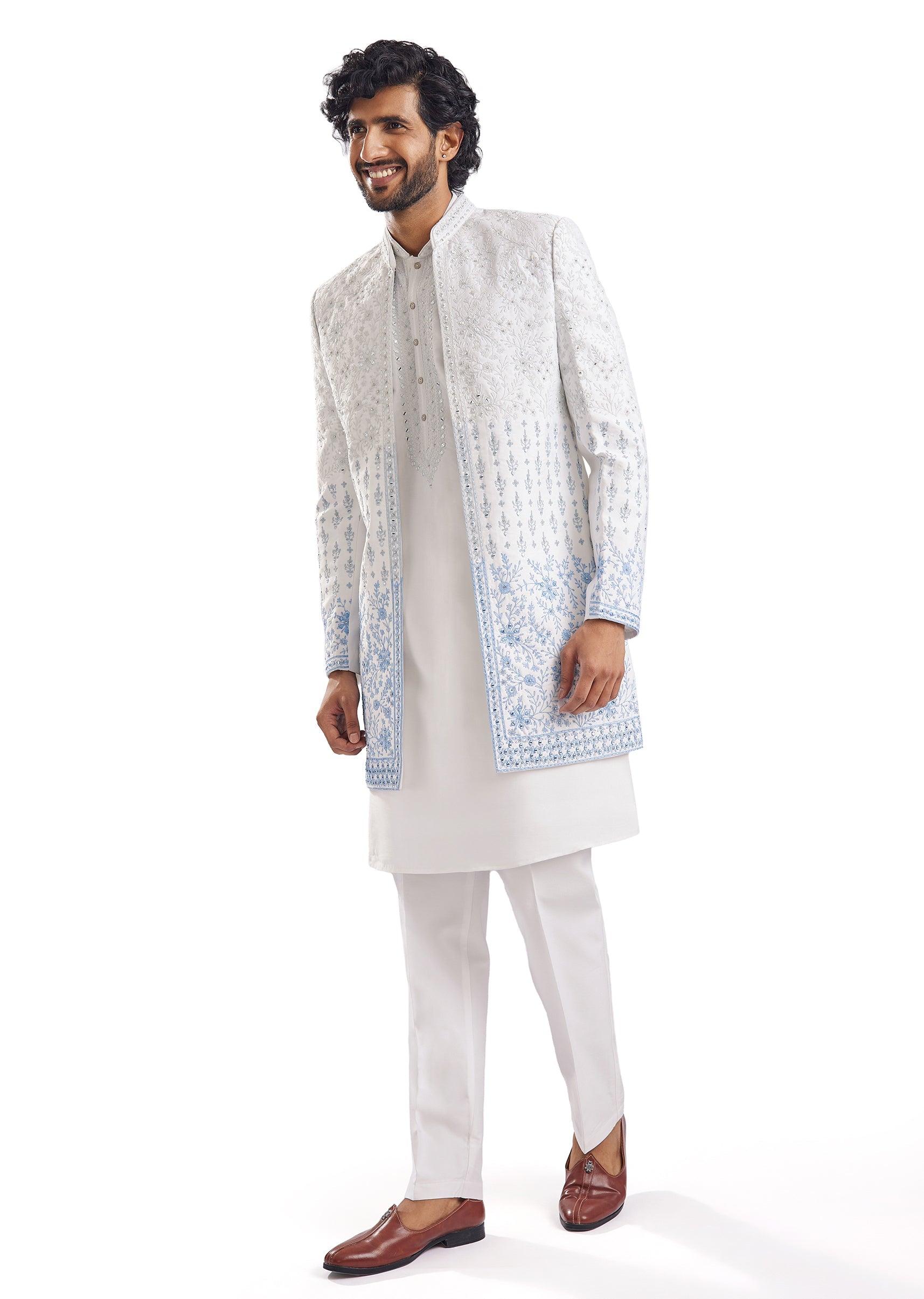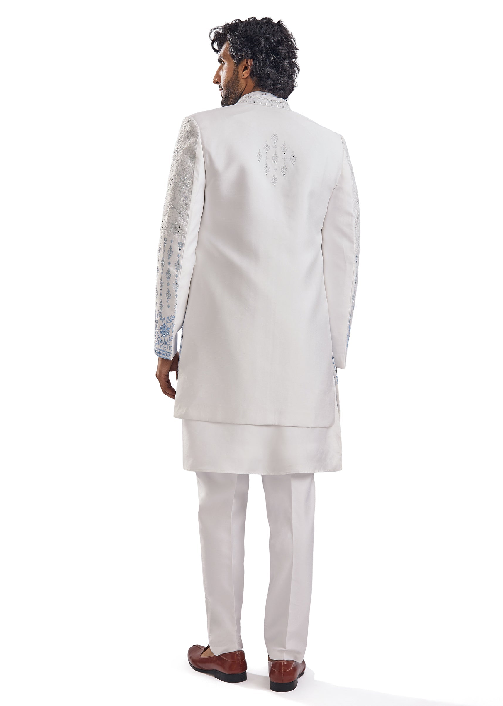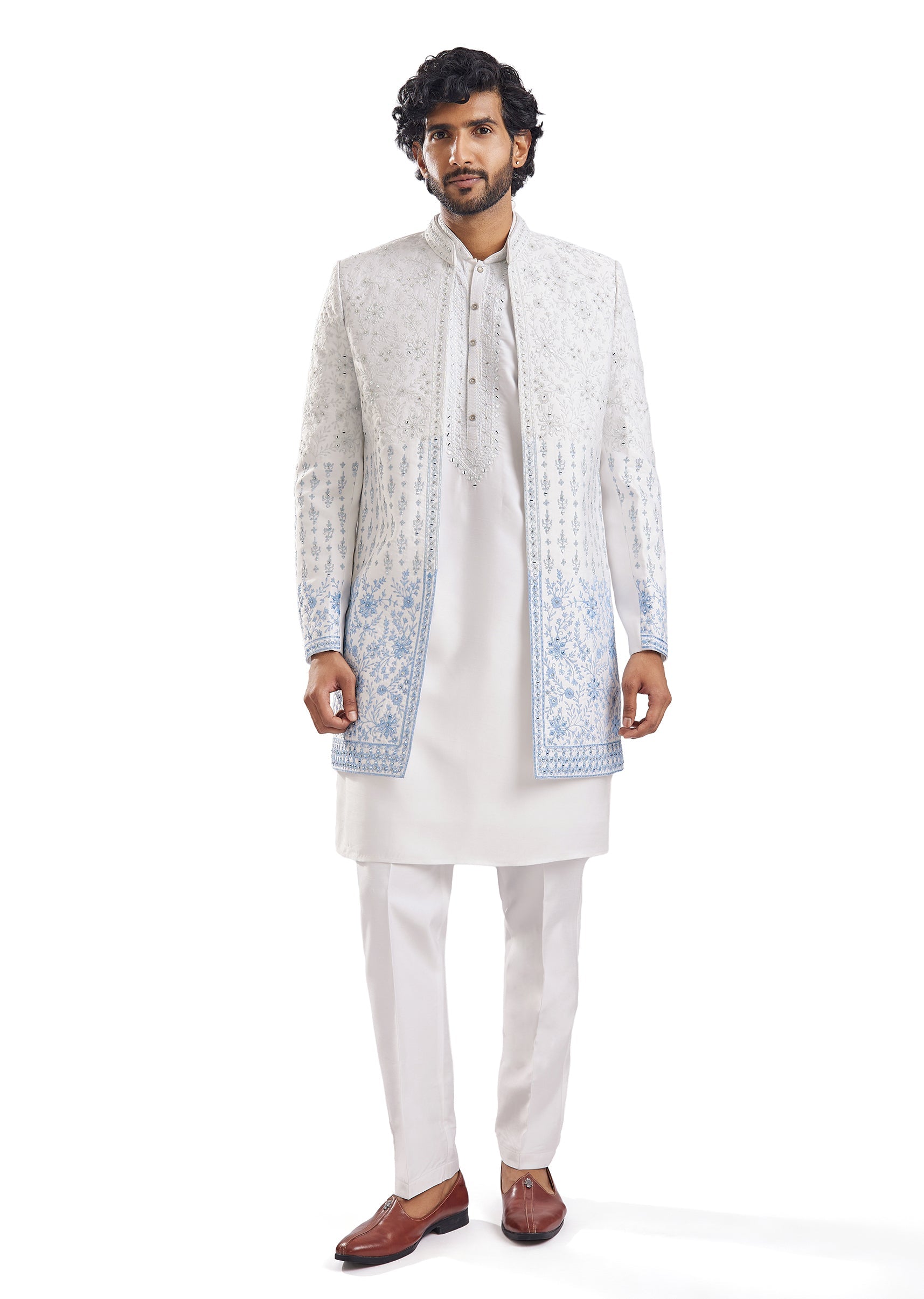 Fit Tips:This sherwani is stitched to a straight mid-waist fit — order your regular chest size and allow the trousers to be hemmed to your exact ankle length.