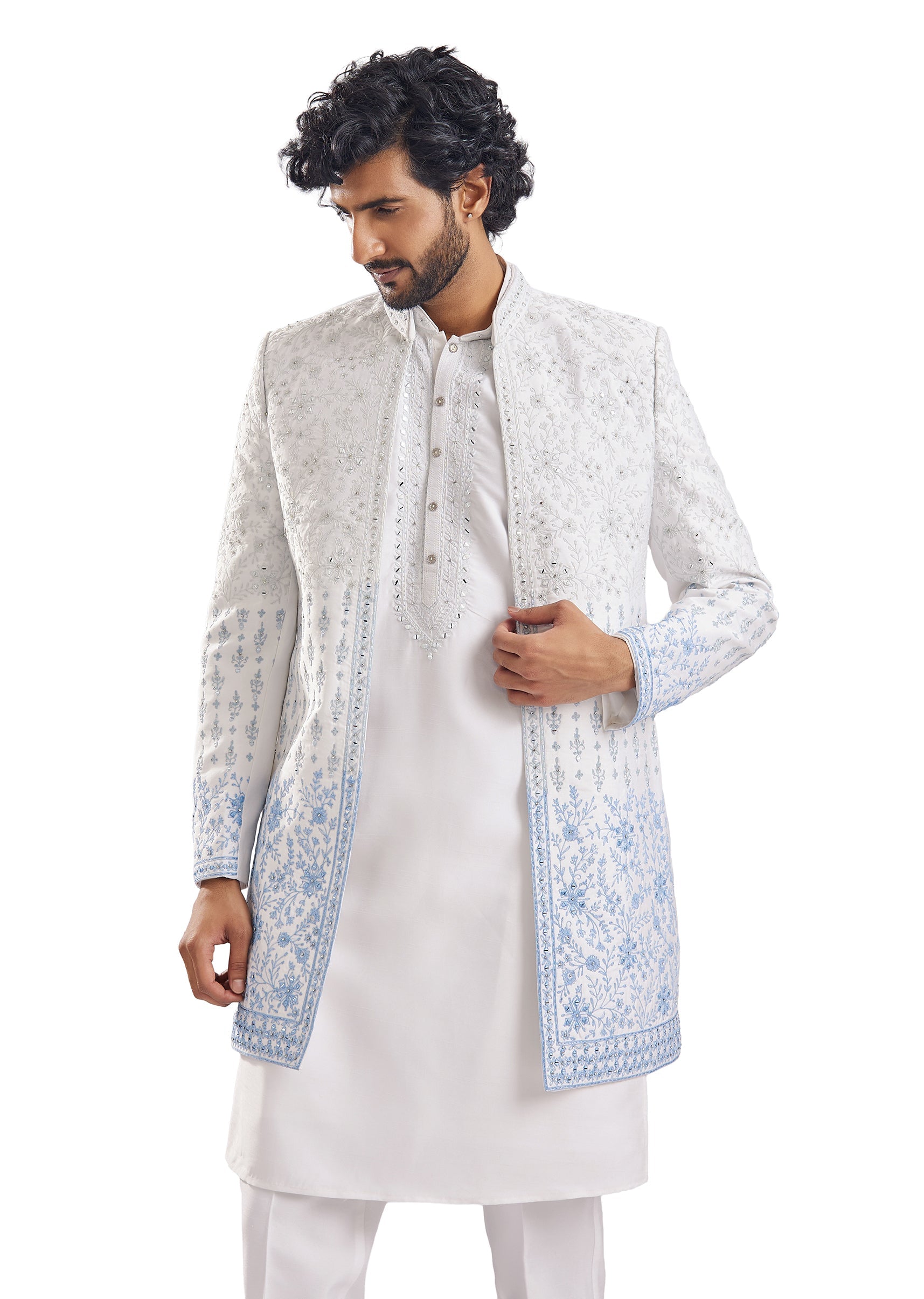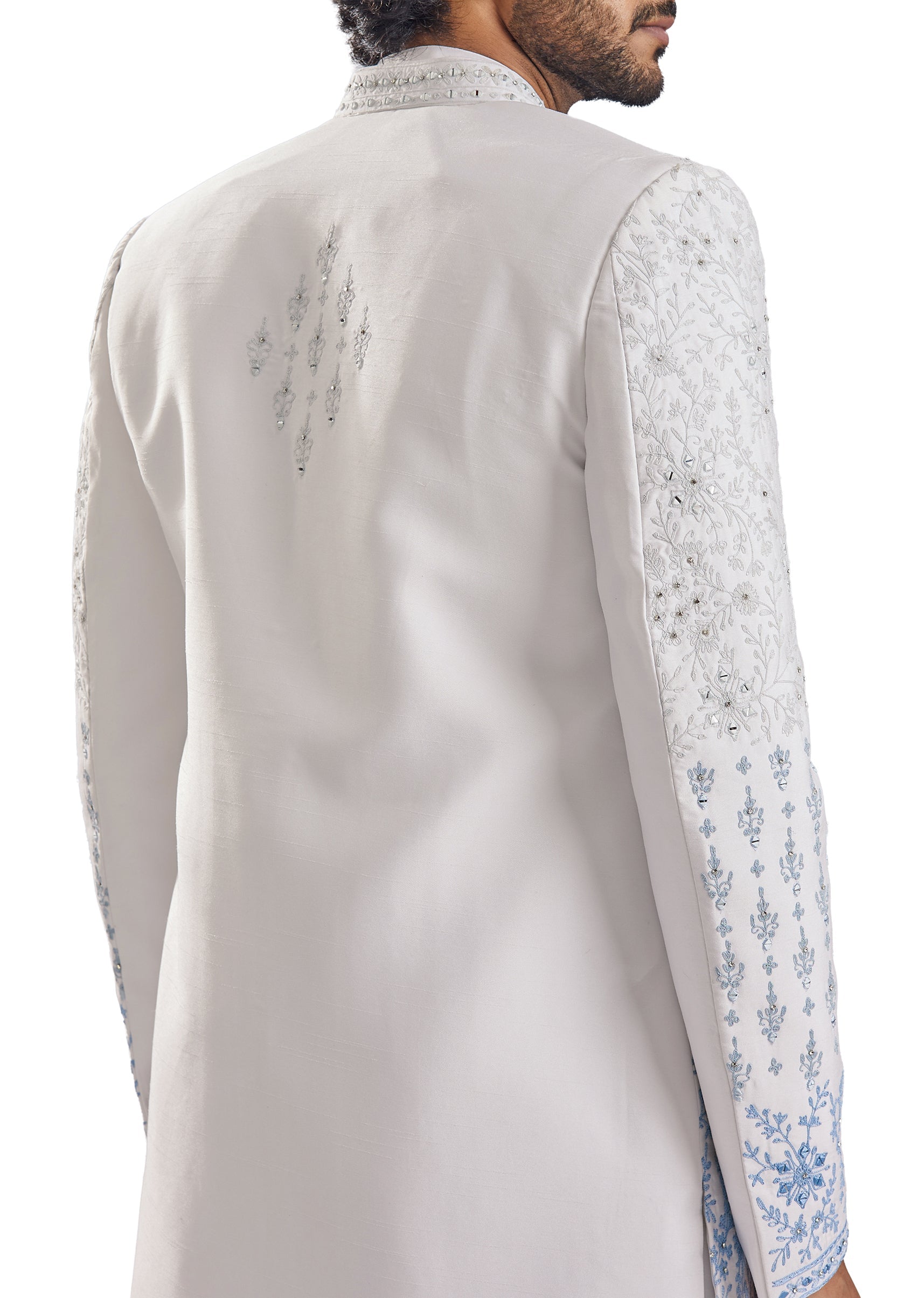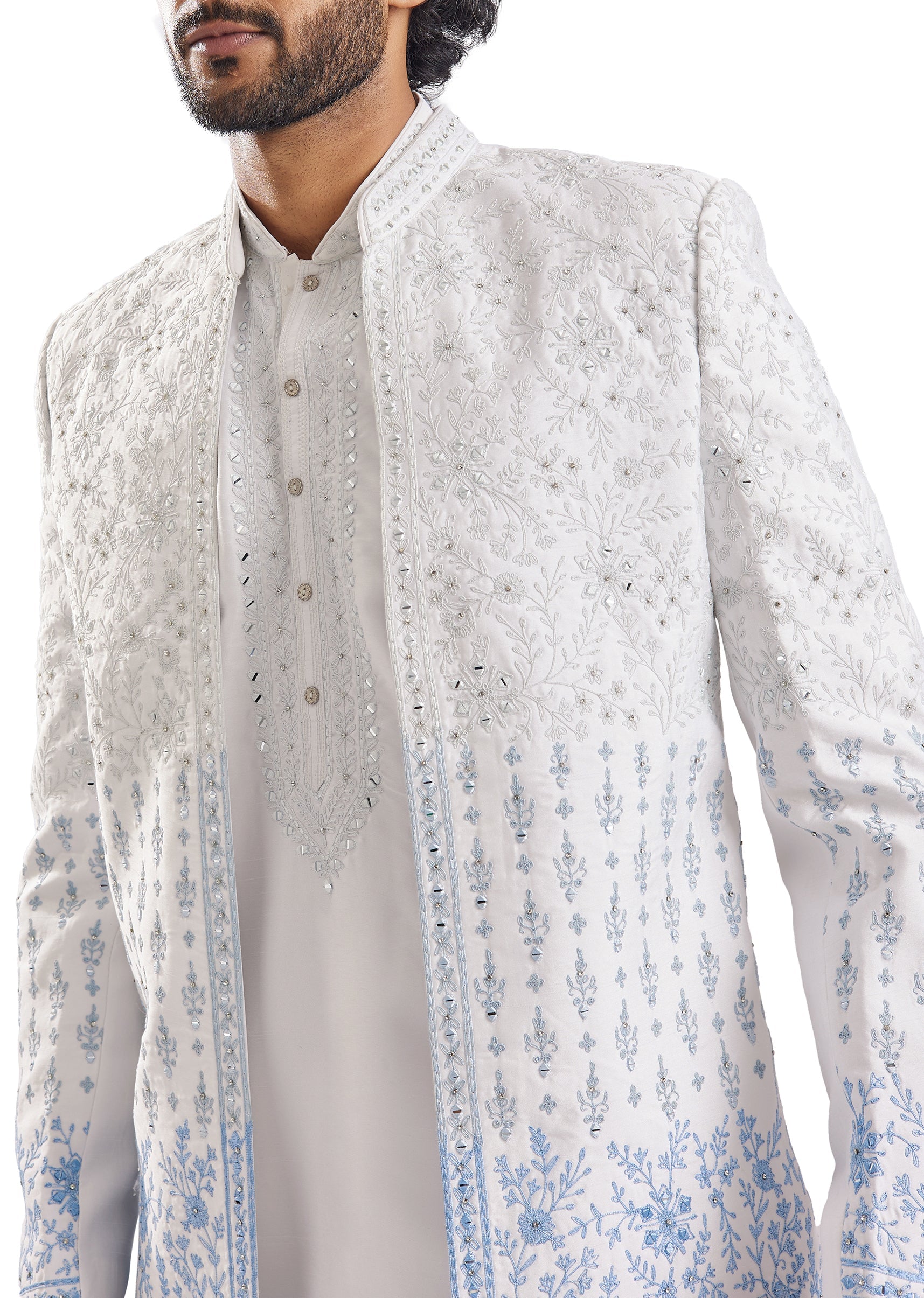 Sharp and statement-making, this blue silk groomsman sherwani is elevated with intricate thread, resham, and mirror work embroidery that catches the light beautifully at sangeet and engagement celebrations. The mandarin... More Product Details