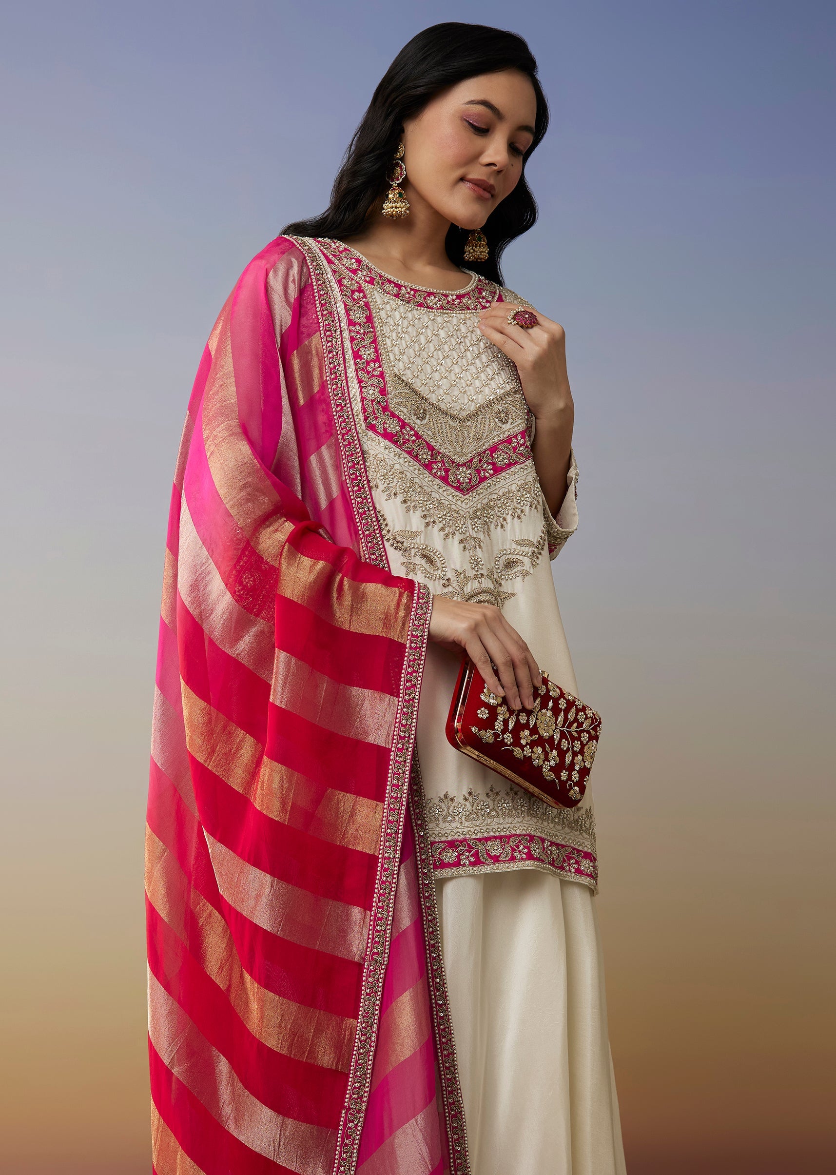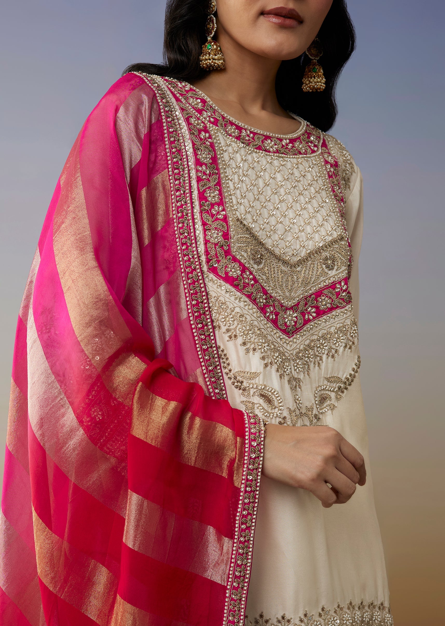 Elegant and timeless, this white silk palazzo suit is adorned with moti and zardosi work that adds refined festive detailing. Ideal for daytime weddings, poojas, and elegant celebrations.