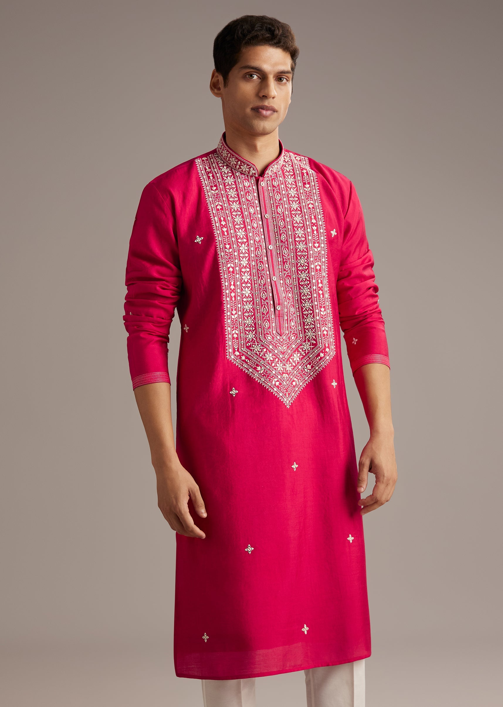 Soft yet festive, this pink silk kurta set features mirror and thread work that brings subtle sparkle. A perfect match for coordinated festive dressing at weddings and family functions.