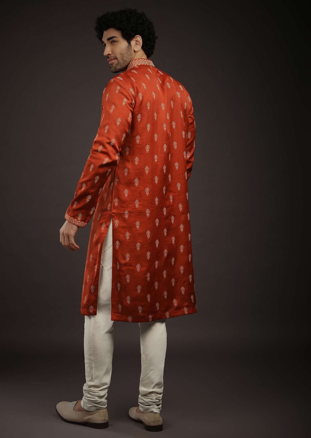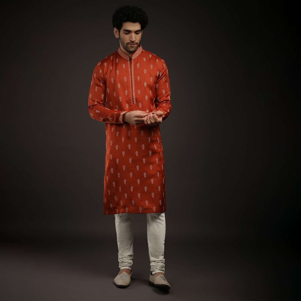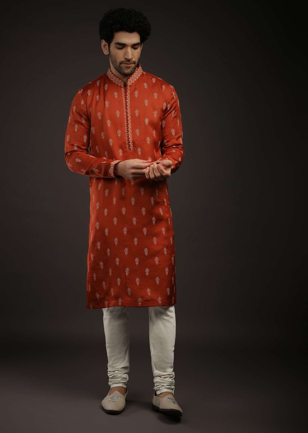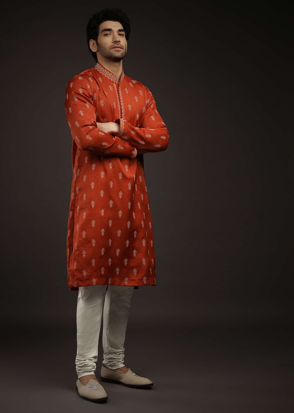 Clay red kurta in satin silk with 3D printed buttis. The placket is adorned with potli buttons.Crafted with full sleeves.Paired with matching churidar or pants.Bottom color may sometimes vary as per stock availabilityButton design, shape and size may vary as per availability. Awarded as the Most Trusted Brand, we're delivering styles you love, just as promised.