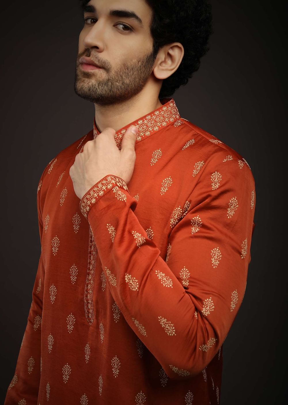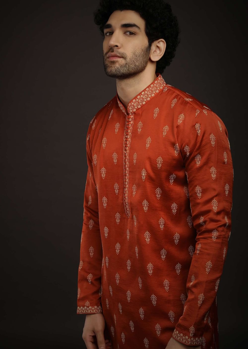 Clay red kurta in satin silk with 3D printed buttis. The placket is adorned with potli buttons.Crafted with full sleeves.Paired with matching churidar or pants.Bottom color may sometimes vary as... More Product Details