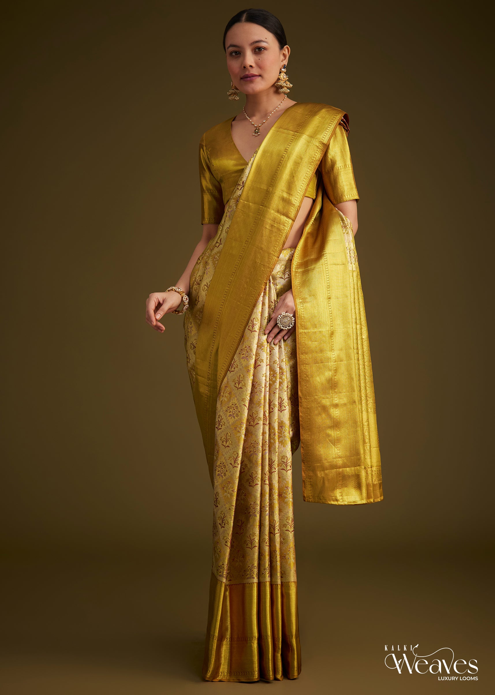 Complement the saree with heritage gold jewelry a classic bun hairstyle and a clutch to complete the ensemble.