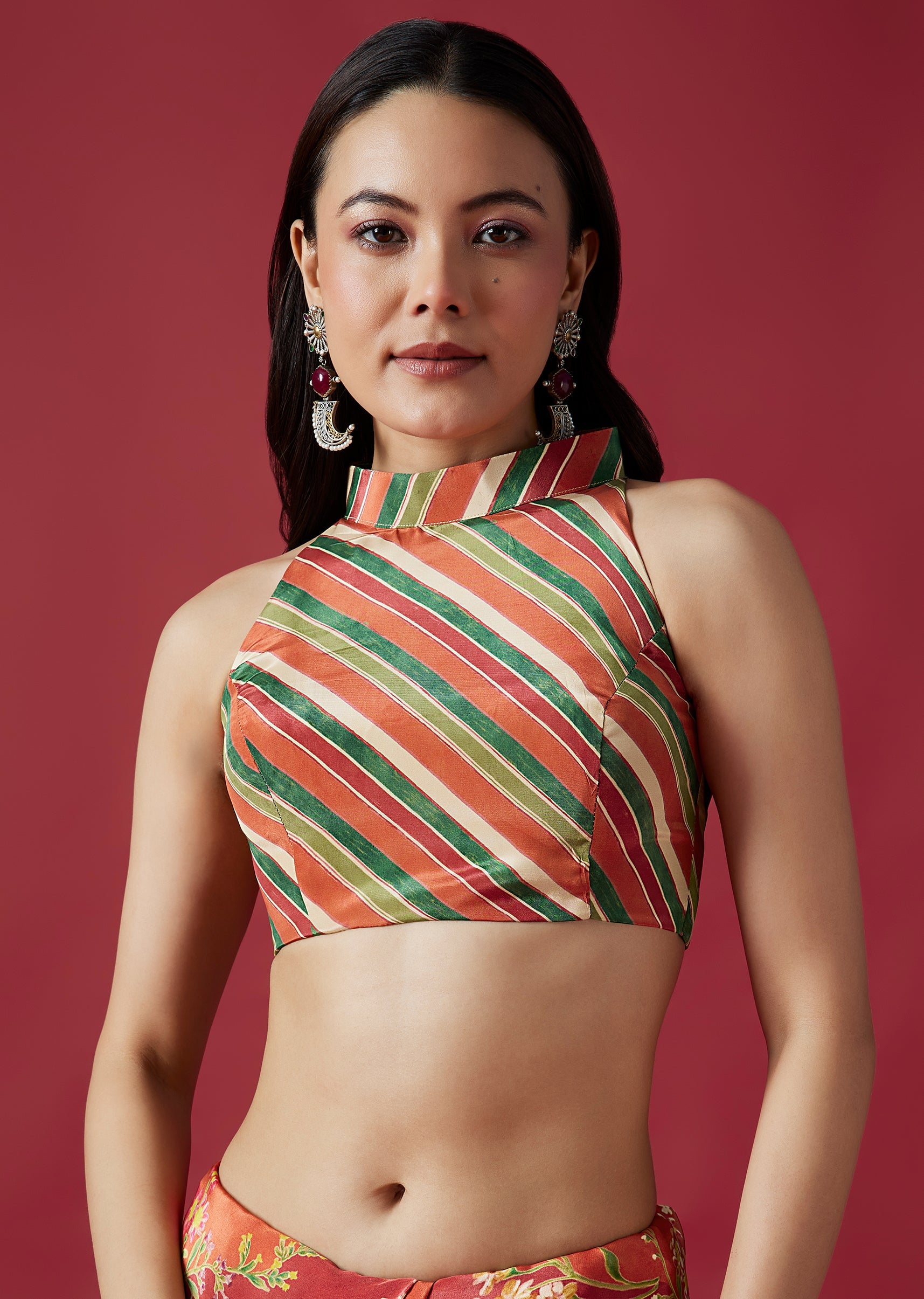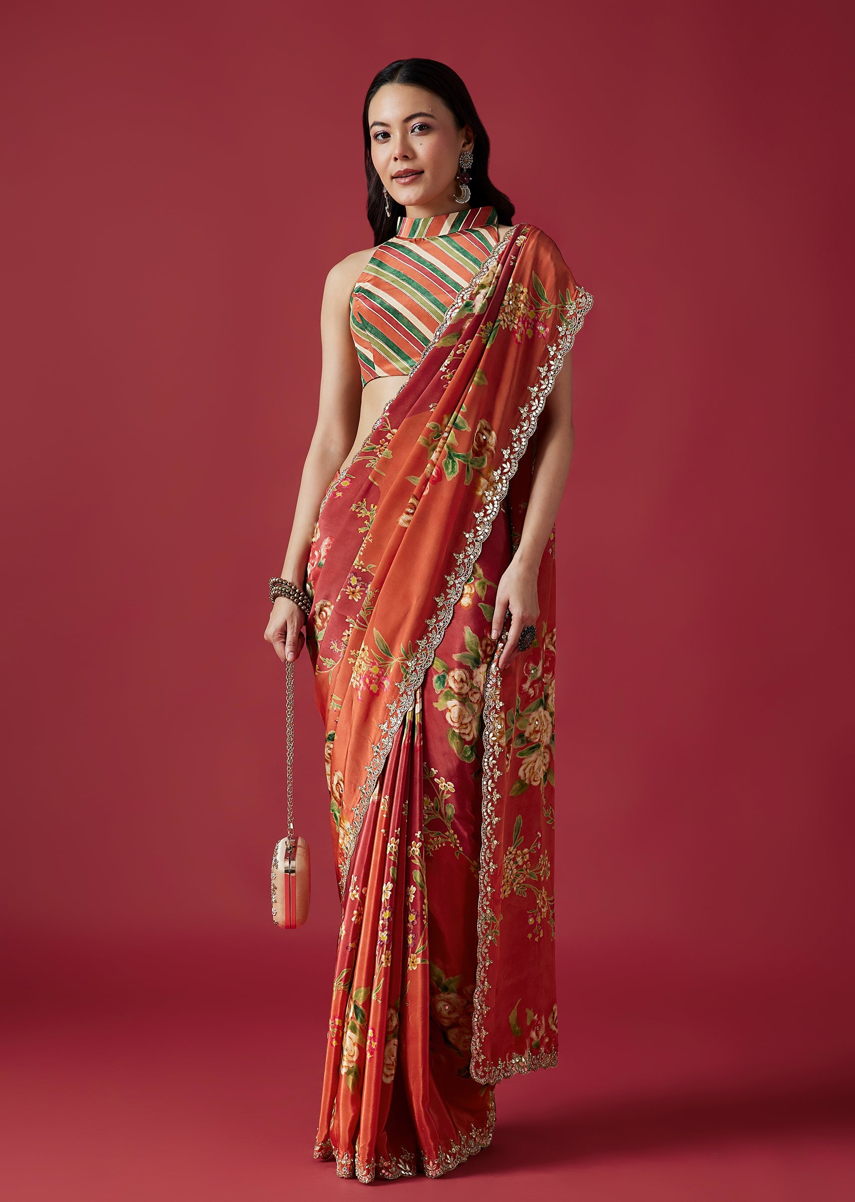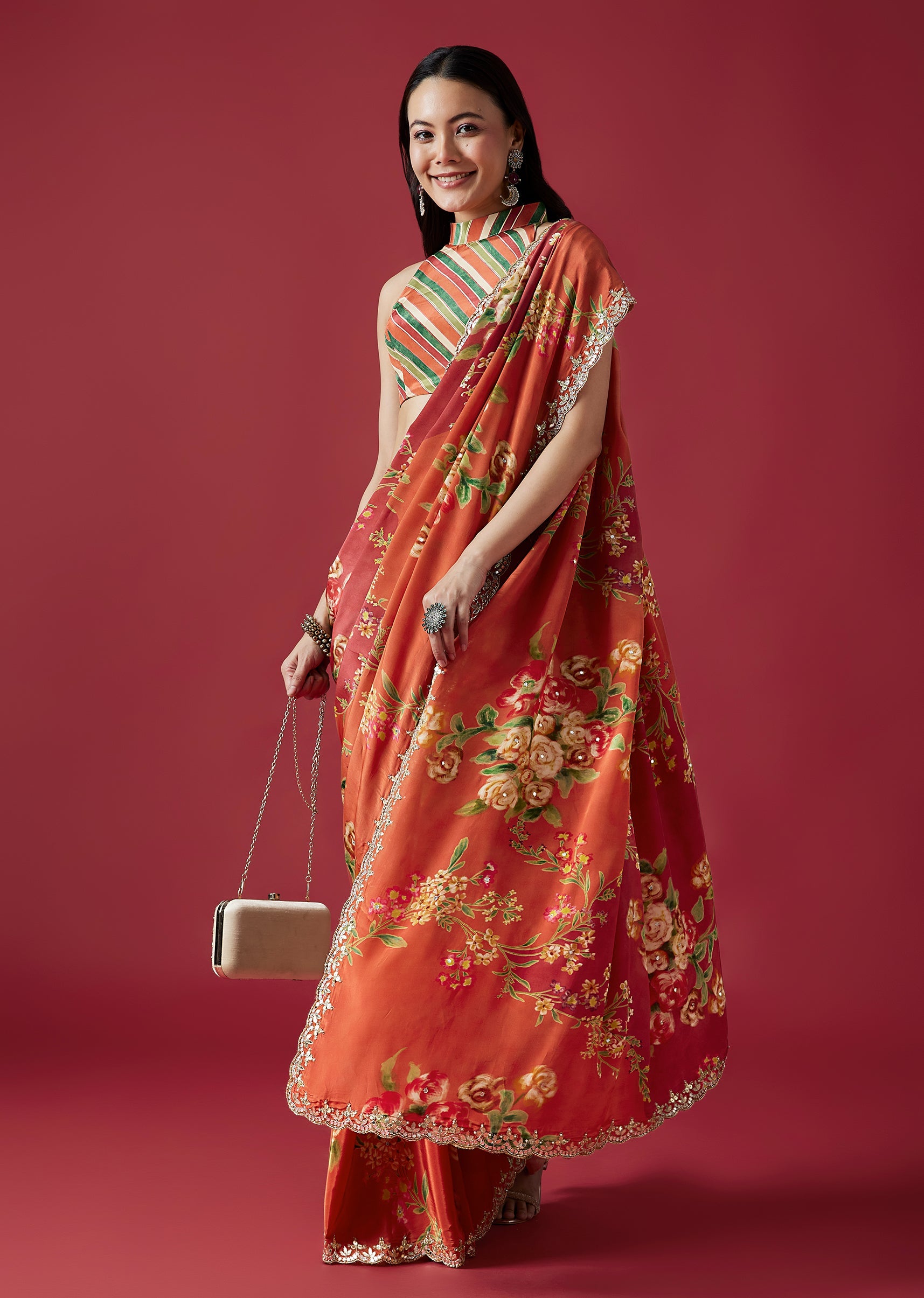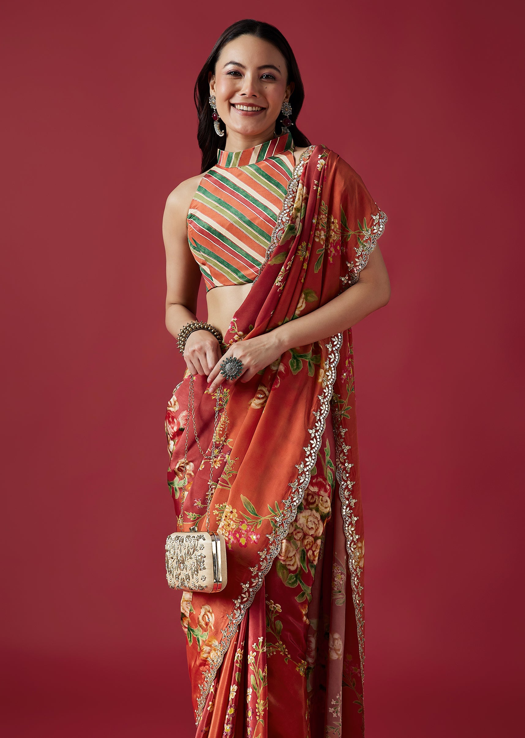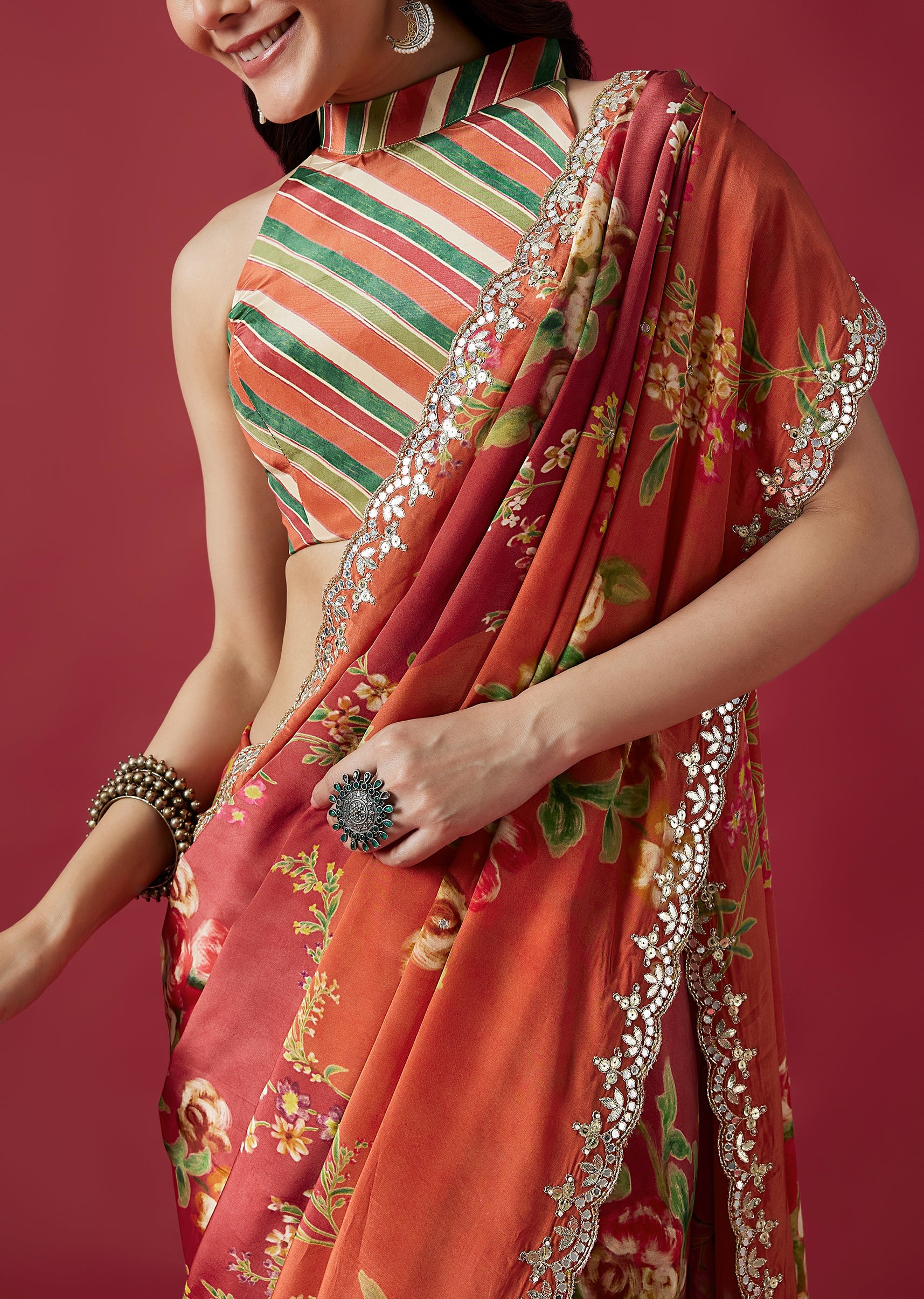 This vibrant coral crepe saree features charming floral prints and a statement scalloped border adorned with mirror and gotta work. Paired with a playful multicolor striped blouse fabric, it adds a lively festive touch to your wardrobe. Awarded as the Most Trusted Brand, we're delivering styles you love, just as promised.