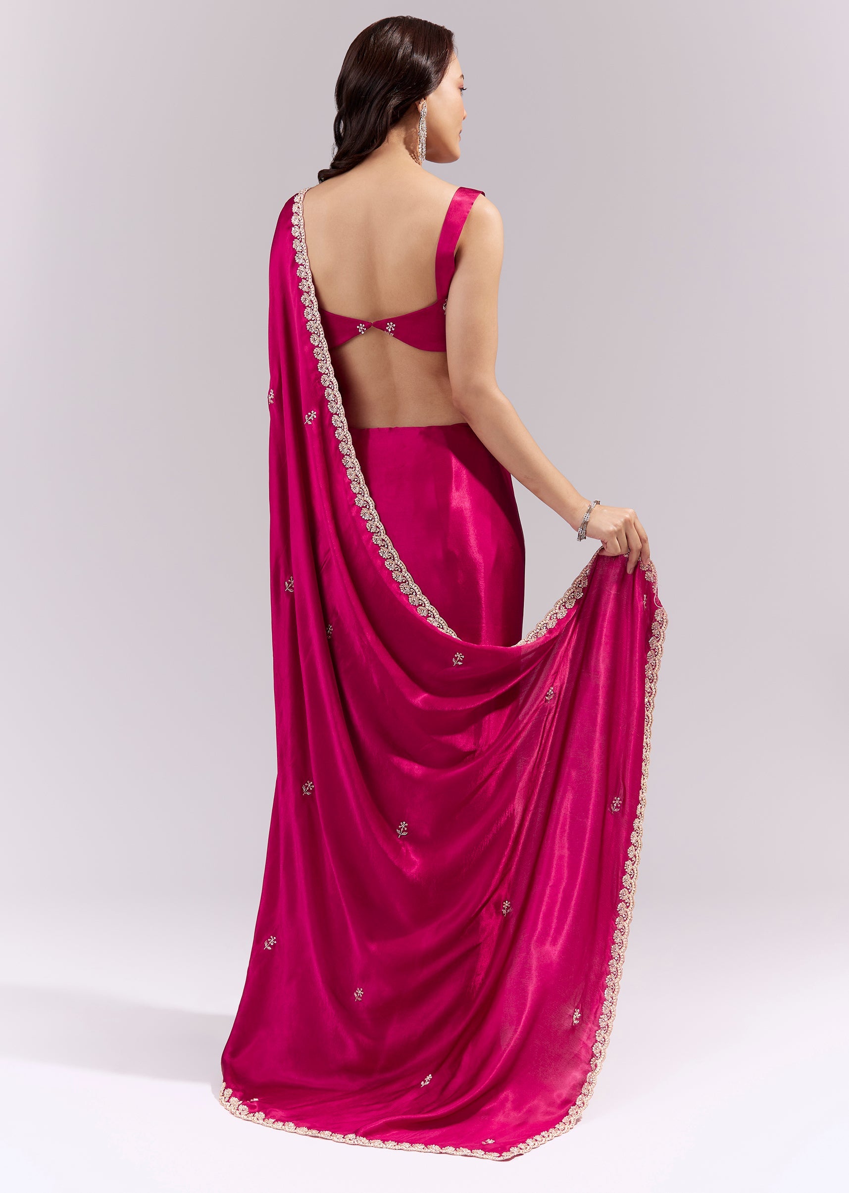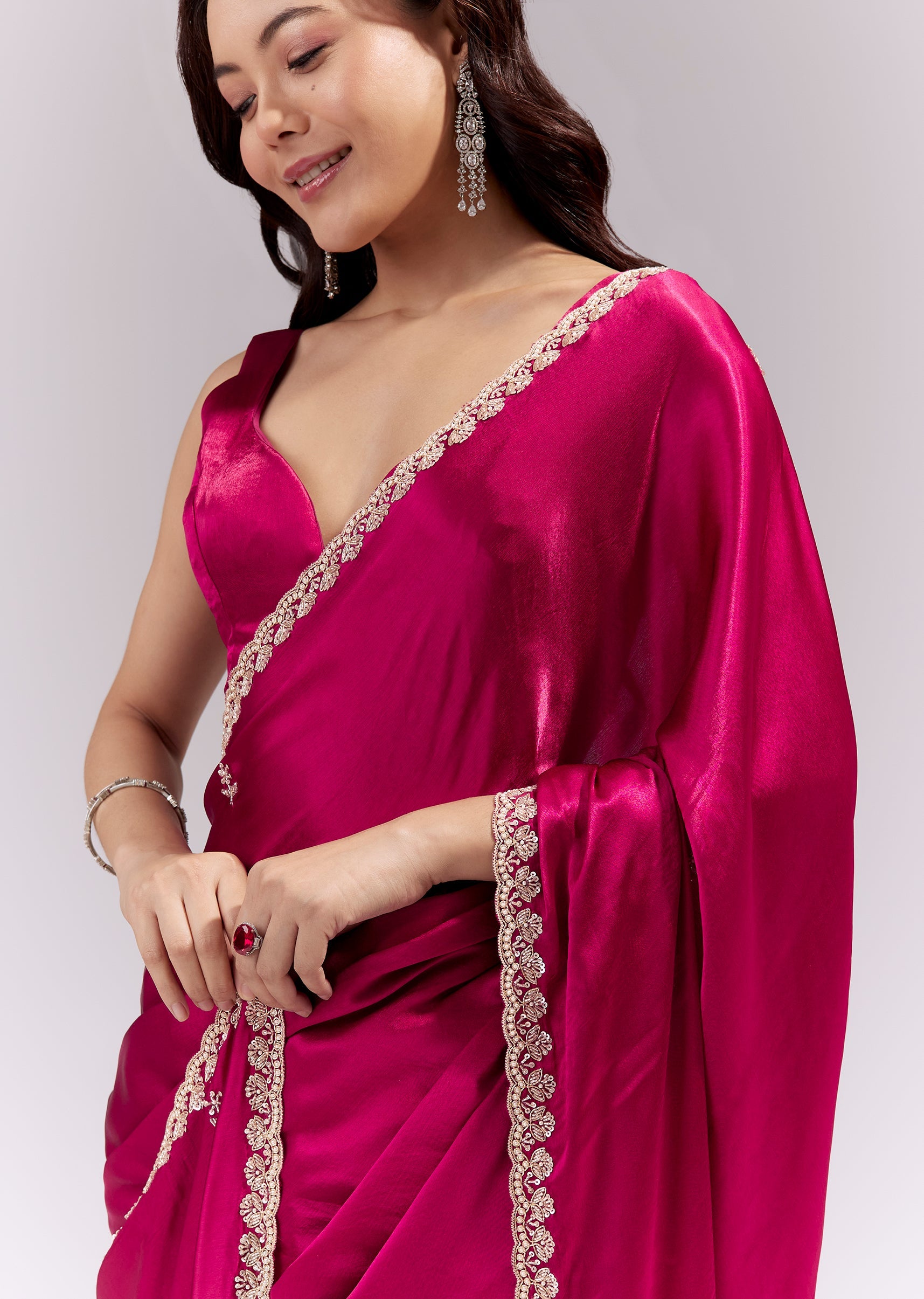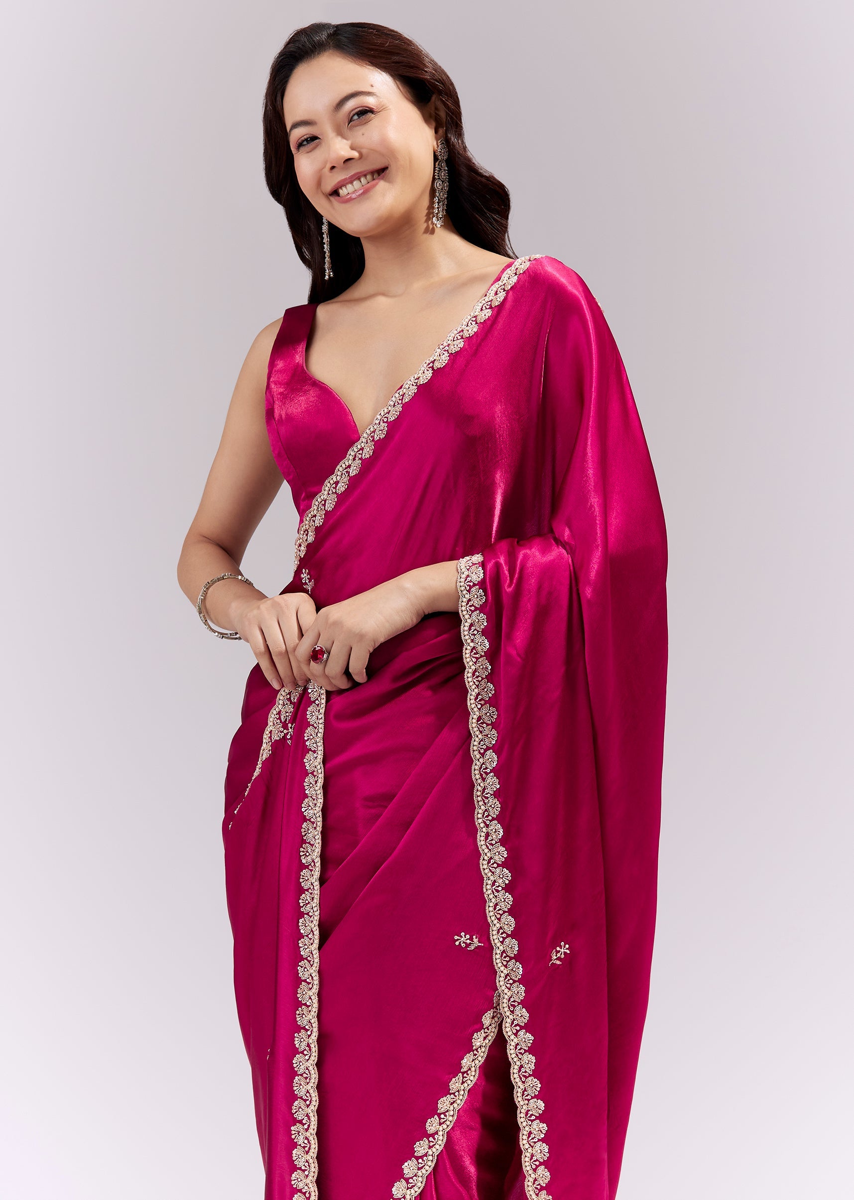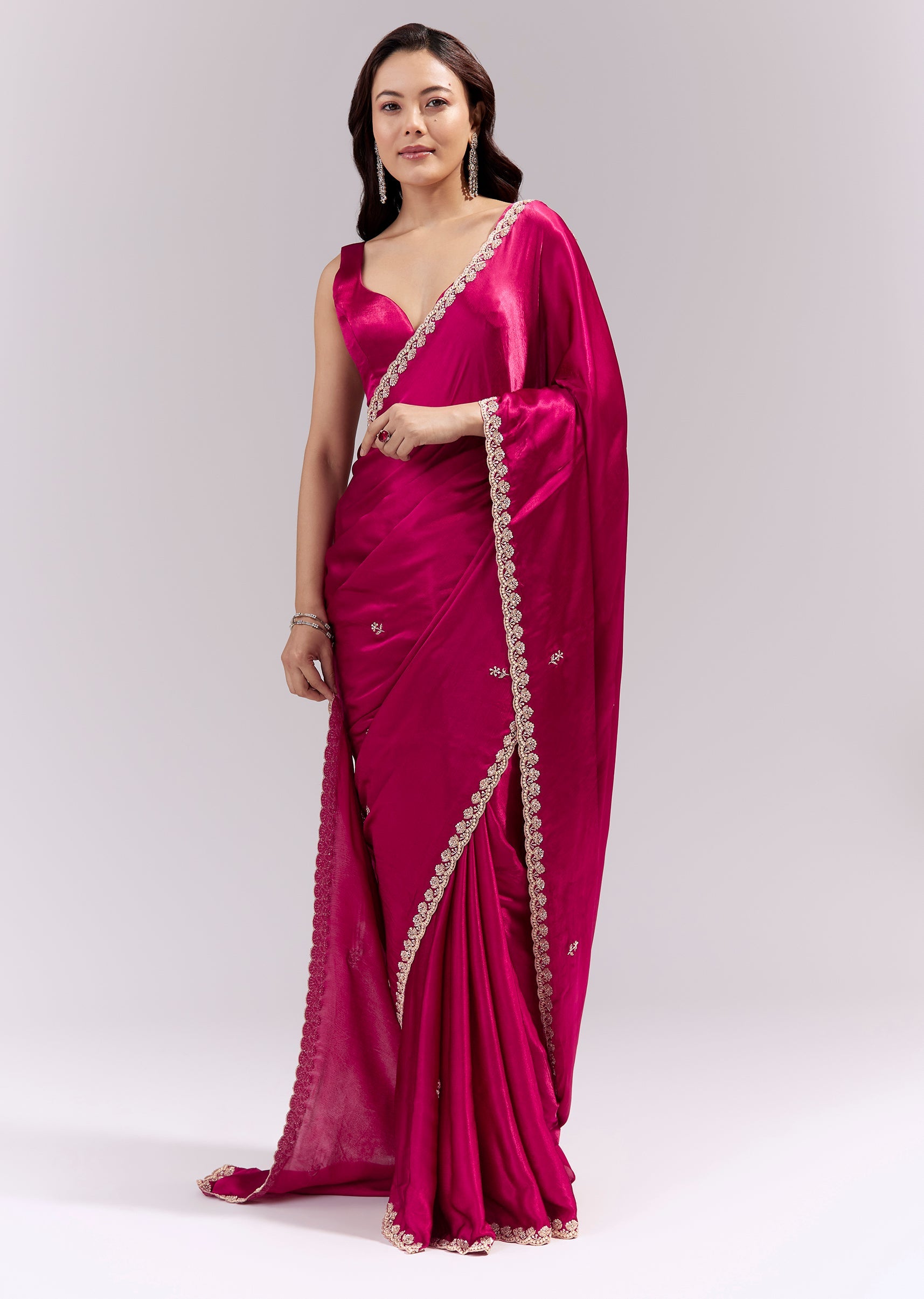 Coral Red Satin Chinon Saree With Scalloped Moti Embroidered Border And Buttis