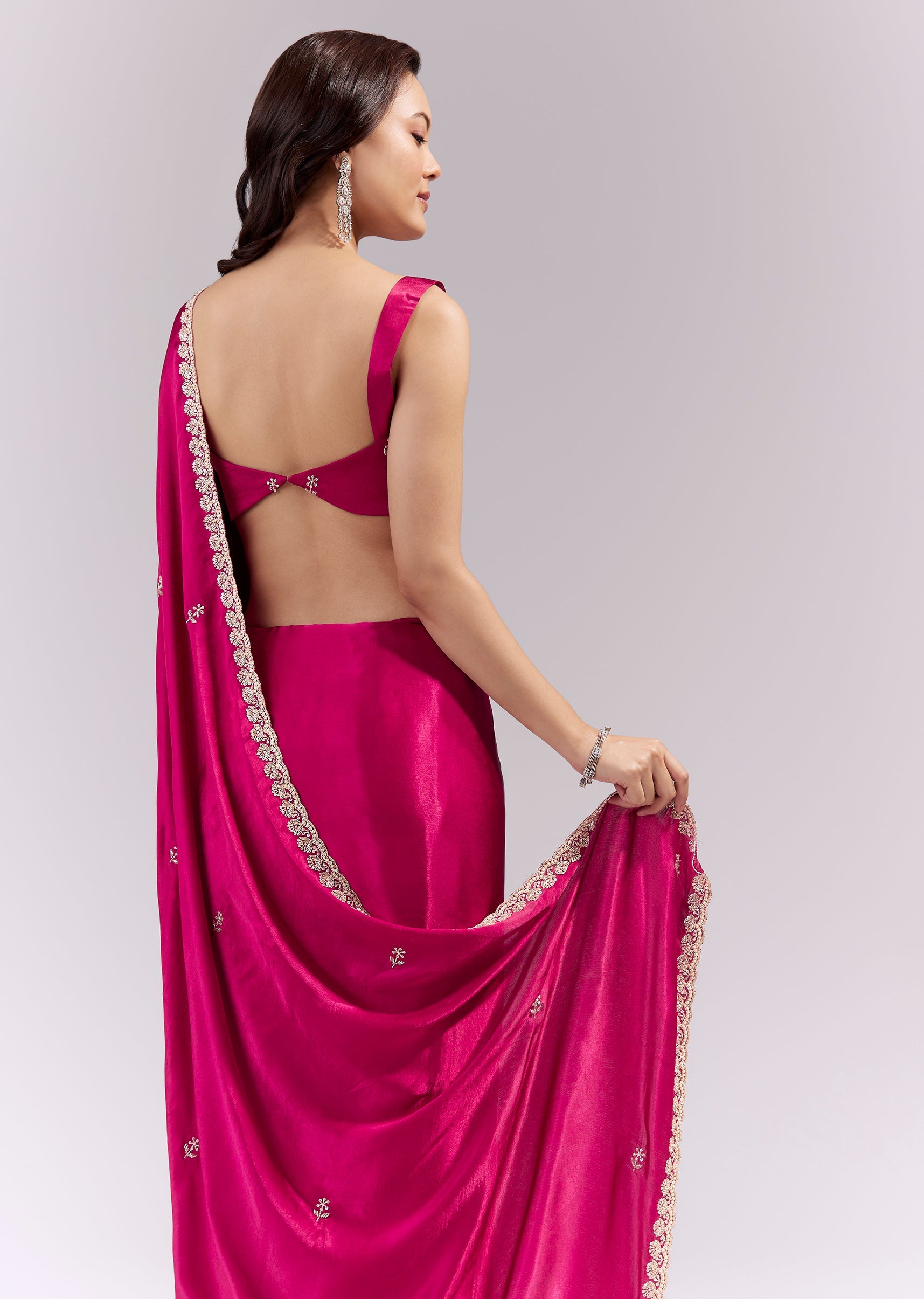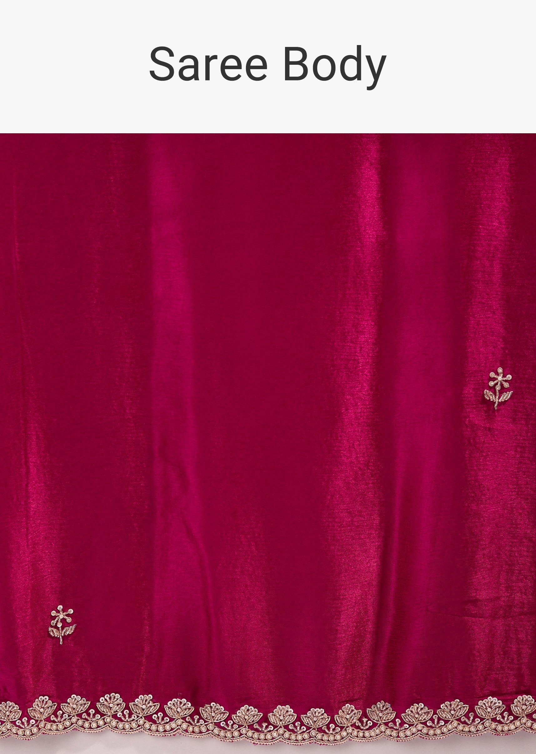This coral red satin chinon saree brings festive energy with a polished, elegant finish. The scalloped border and tiny buttis are hand-embroidered with moti, cutdana and beads, creating a soft shimmer that catches the light beautifully. A stunning pick for festive parties, evening celebrations, and statement occasions.