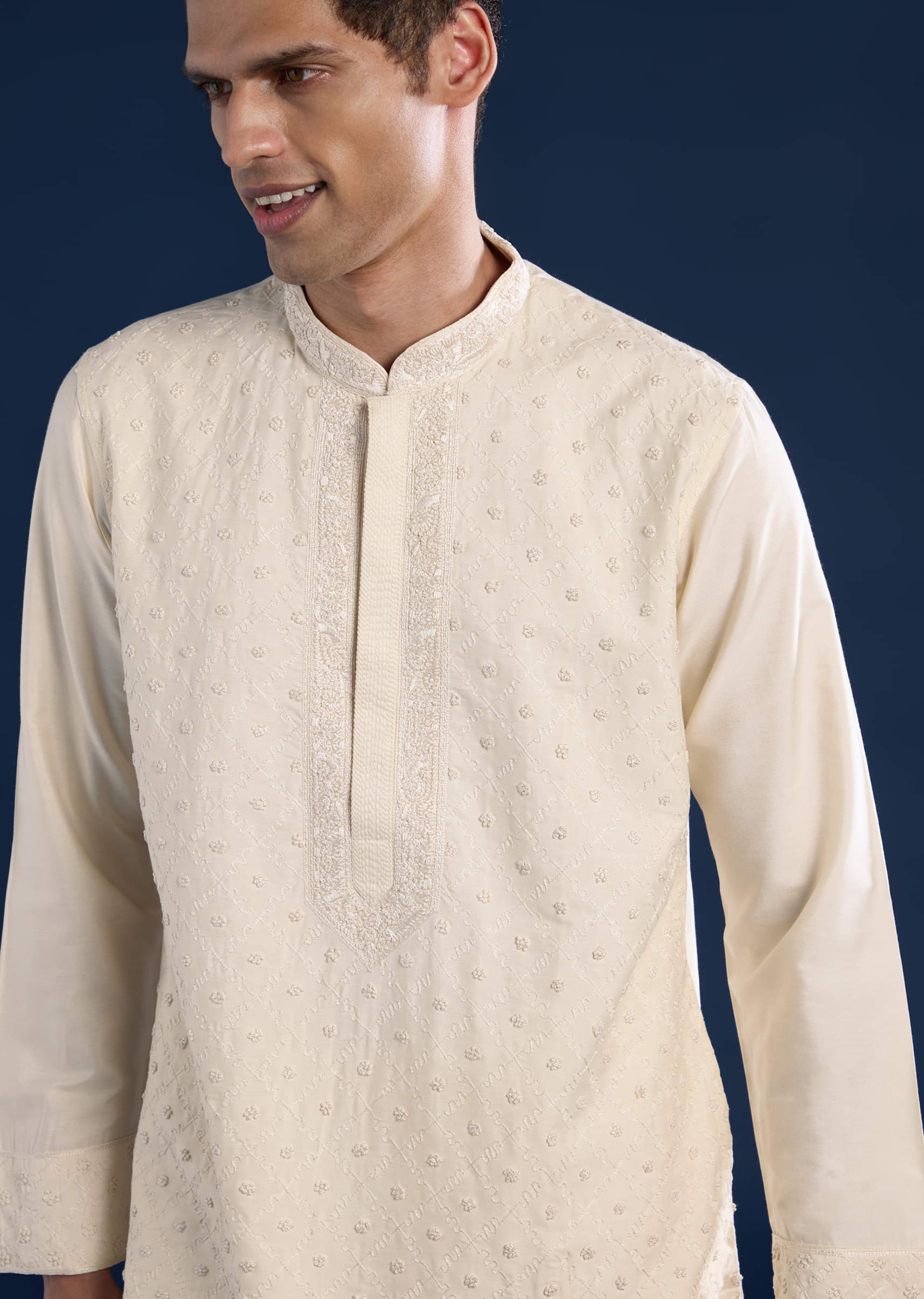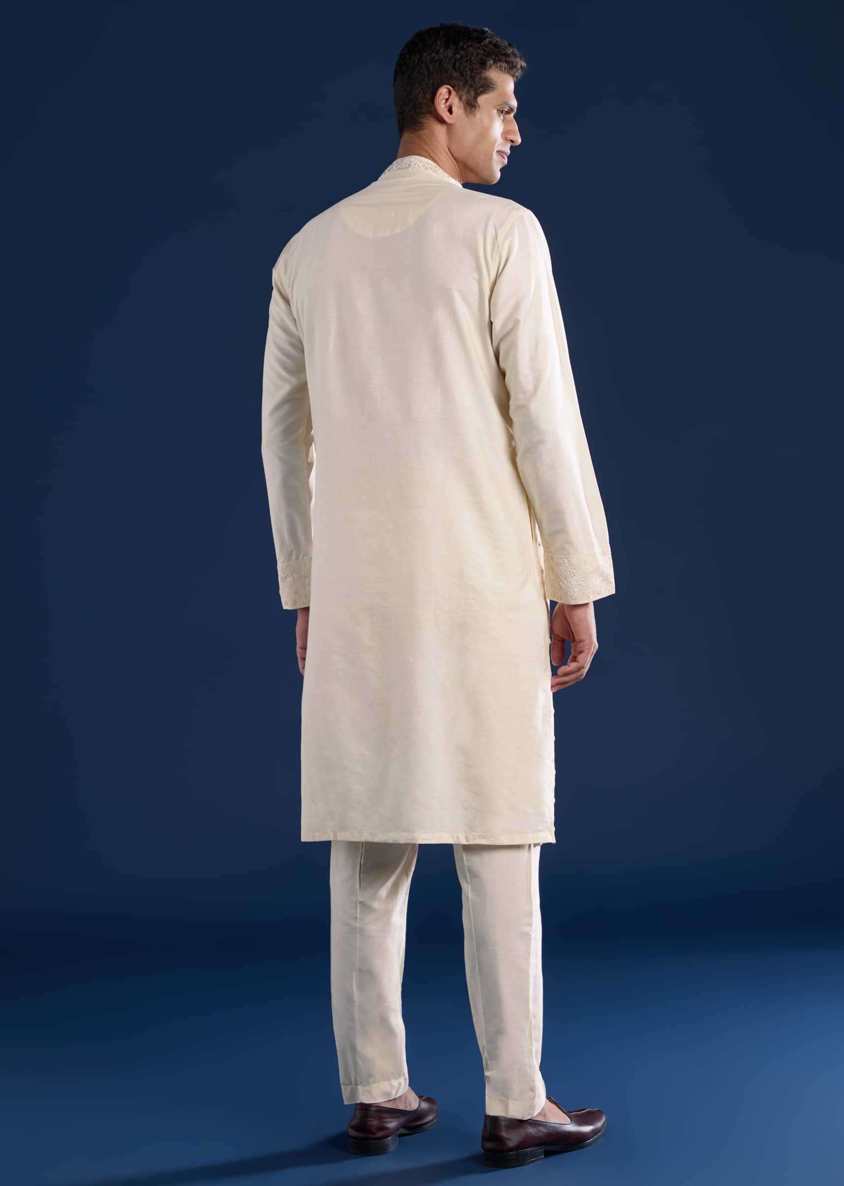 Cream Banarsi Silk Mens Kurta and Pant Set