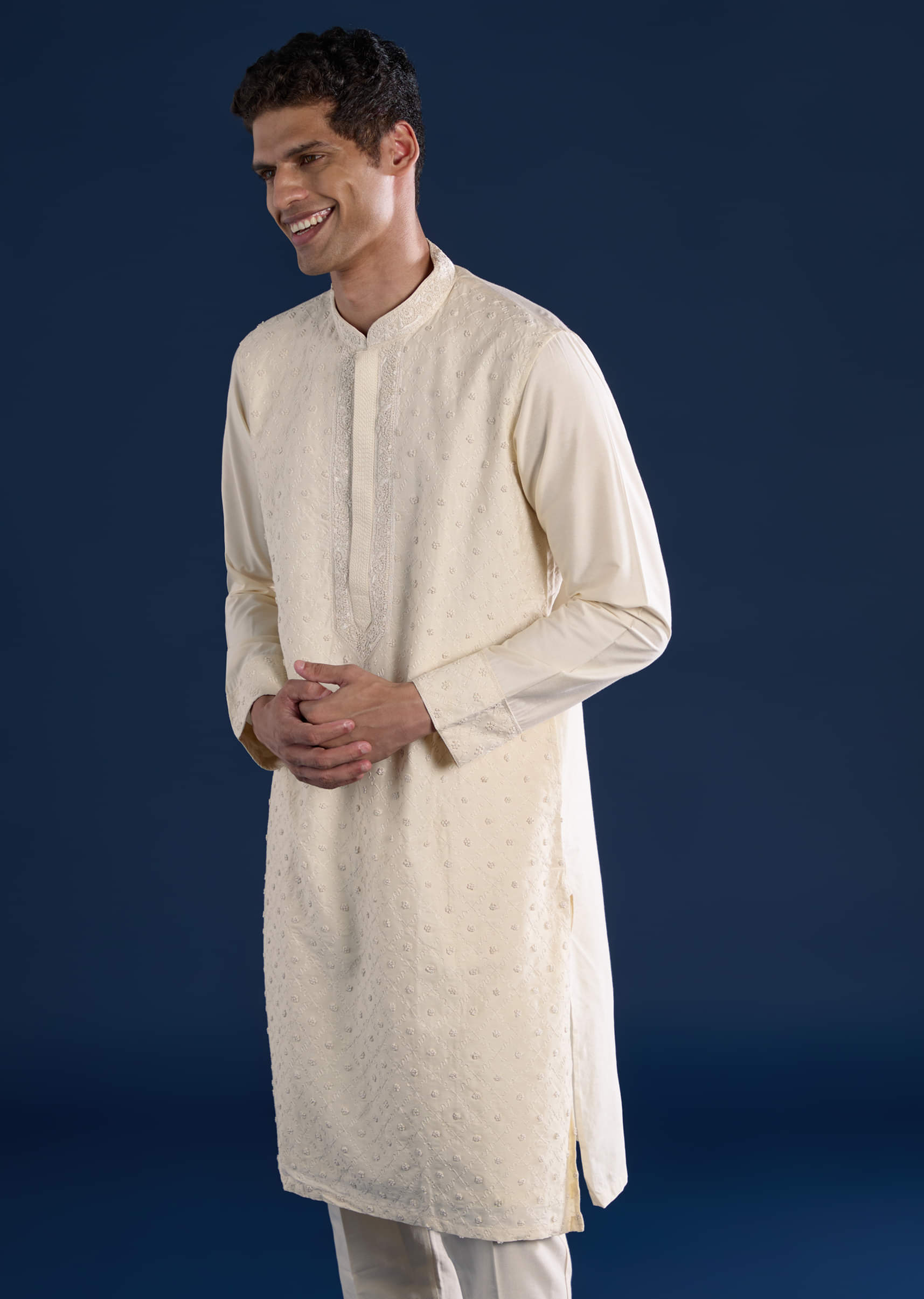 Exude timeless sophistication with this ivory Banarasi silk men’s kurta set, featuring intricate embroidery crafted with thread and elegant French knot detailing. The luxurious silk fabric offers a rich sheen... More Product Details