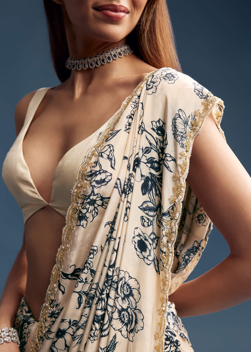 Fit Tips:Team it with a black sleeveless halter or even a backless blouse for a modern finish. Wrap the pallu tightly around the neck like a scarf and pin it at the shoulder. It's a fresh way to wear print like a pro.